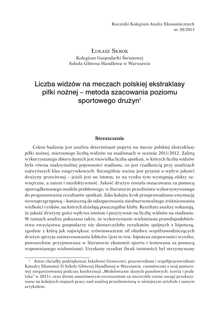 Roczniki Kolegium Analiz Ekonomicznych nr 30/2013 Łukasz Skrok Kolegium Gospodarki Światowej Szkoła Główna Handlowa w Warszawie Liczba widzów na meczach polskiej ekstraklasy piłki nożnej – metoda szacowania poziomu sportowego drużyn1 Streszczenie Celem badania jest analiza determinant popytu na mecze polskiej ekstraklasy piłki nożnej, mierzonego liczbą widzów na stadionach w sezonie 2011/2012. Zaletą wykorzystanego zbioru danych jest niewielka liczba spotkań, w których liczba widzów była równa maksymalnej pojemności stadionu, co jest rzadkością przy analizach najwyższych klas rozgrywkowych. Szczególnie ważne jest pytanie o wpływ jakości drużyny przeciwnej – jeżeli jest on istotny, to na rynku tym występują efekty zewnętrzne, a zatem i nieefektywność. Jakość drużyn została oszacowana za pomocą uporządkowanego modelu probitowego, w literaturze przedmiotu wykorzystywanego do prognozowania rezultatów spotkań. Jako kolejny krok przeprowadzono estymację wewnątrzgrupową – konieczną do odseparowania nieobserwowalnego zróżnicowania wielkości rynków, na których działają poszczególne kluby. Rezultaty analizy wskazują, że jakość drużyny gości wpływa istotnie i pozytywnie na liczbę widzów na stadionie. W ramach analizy pokazano także, że wykorzystanie wielomianu prawdopodobieństwa zwycięstwa gospodarzy nie dostarczyłoby rezultatów spójnych z hipotezą, zgodnie z którą jak największe zrównoważenie sił obydwu współzawodniczących drużyn sprzyja zainteresowaniu kibiców (jest to tzw. hipoteza niepewności wyniku, powszechnie przyjmowana w literaturze ekonomii sportu i testowana za pomocą wspomnianego wielomianu). Uzyskany rezultat (brak istotności) był otrzymywany 1 Autor chciałby podziękować Jakubowi Growcowi, pracownikom i współpracownikom Katedry Ekonomii II Szkoły Głównej Handlowej w Warszawie, rozmówcom z sesji posterowej zorganizowanej podczas konferencji „Modelowanie danych panelowych: teoria i praktyka” w 2013 r. oraz dwóm anonimowym recenzentom za niezwykle cenne uwagi przekazywane na kolejnych etapach pracy nad analizą przedstawioną w niniejszym artykule i samym artykułem. 274 Łukasz Skrok w licznych badaniach prezentowanych w literaturze. Jak można jednak wykazać, wykorzystanie miar jakości drużyn jako zmiennych objaśniających może być uznane za tożsame z uwzględnieniem wielomianu prawdopodobieństwa. Pokazuje to, że z jednej strony stosowana w literaturze empirycznej strategia testowania za pomocą wielomianu jest wadliwa, a z drugiej – że utrudnia to interpretację rezultatów. Słowa kluczowe: liczba widzów na meczach piłkarskich, piłka nożna, hipoteza niepewności wyniku, polska ekstraklasa 1. Wstęp Artykuł stanowi wkład w badania determinant liczby widzów na stadionach podczas meczów piłki nożnej2. W większości z istniejących już prac za centralny problem uznaje się weryfikację hipotezy niepewności wyniku, zgodnie z którą największym zainteresowaniem powinny się cieszyć spotkania możliwie zrównoważone. Ma ona fundamentalne znaczenie teoretyczne – jest propozycją swoistej teorii ekonomii sportu – i normatywne – stanowi uzasadnienie dla interwencji na poziomie ligi ograniczającej swobodę decyzji klubów i mającej prowadzić do zmniejszania nierówności sił pomiędzy klubami. Proponowany w literaturze przedmiotu test empiryczny polega na poszukiwaniu kwadratowej zależności między prawdopodobieństwem zwycięstwa gospodarzy a liczbą widzów, gdy maksymalne zainteresowanie osiągane jest dla prawdopodobieństwa równego 0,53. Jak pokazują Coates i in.4, rezultaty analiz przedstawianych w literaturze przedmiotu są zróżnicowane – uzyskuje się zarówno rezultaty zgodne lub sprzeczne z hipotezą niepewności wyniku, jak i rezultaty niekonkluzywne. Możliwym wytłumaczeniem jest to, że rozkład prawdopodobieństwa poszczególnych rezultatów jest silnie związany z poziomem współzawodniczących drużyn, a w ramach analizy empirycznej nie można odróżnić wpływu obydwu tych 2 Ponieważ dogłębne odnoszenie się do literatury przedmiotu w tym zakresie nie jest jego celem, zainteresowany czytelnik powinien sięgnąć do szerokiego przeglądu zawartego w pracy: D. Coates, B. Humphreys, L. Zhou, Outcome Uncertainty, Reference-Dependent Preferences and Live Game Attendance, Working Papers 2012–7. Informacje na ten temat można znaleźć także w pracy: S. Dobson, J. Goddard, The Economics of Football, Cambridge University Press, Cambridge 2011. 3 Względnie, maksimum zainteresowania osiągane jest dla prawdopodobieństwa nieco większego niż 0,5, co ma na celu uwzględnienie chęci oglądania przez kibiców zwycięstw ulubionej drużyny. 4 D. Coates, B. Humphreys, L. Zhou, op.cit. Liczba widzów na meczach polskiej ekstraklasy piłki nożnej – metoda szacowania... 275 czynników5. Wynika z tego także niska użyteczność testu hipotezy niepewności wyniku opartego na analizach liczby widzów poszczególnych spotkań. Dlatego też w tym artykule prawdopodobieństwo zwycięstwa gospodarzy i poziom sportowy6 współzawodniczących drużyn są analizowane łącznie. Podstawowym celem empirycznym analizy jest natomiast analiza wpływu siły drużyny gości – jeżeli jest on istotny, to występuje efekt zewnętrzny polegający na tym, że poziom sportowy każdej drużyny wpływa na przychody osiągane przez wszystkie kluby. W efekcie poziom sportowy całej ligi jest niższy od optymalnego. Prawdziwość hipotezy niepewności wyniku nie jest zatem jedynym możliwym argumentem za ingerencją w decyzje klubów. Celem dodatkowym artykułu jest zilustrowanie kolejnego problemu testu hipotezy niepewności wyniku opartego na funkcji prawdopodobieństw rezultatów spotkań. Prawdopodobieństwa te same są oszacowaniami, co powinno być uwzględnione przy ocenie błędów oszacowań współczynników regresji w modelu objaśniającym lic