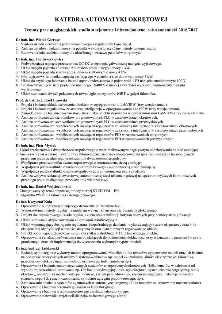 KATEDRA AUTOMATYKI OKRĘTOWEJ Tematy prac magisterskich, studia stacjonarne i niestacjonarne, rok akademicki 2016/2017 Dr hab. inż. Witold Gierusz 1. Synteza układu sterowania jednowymiarowego z regulatorem typu robust. 2. Analiza układów rozdziału mocy na pędniki wykorzystujące różne metody matematyczne. 3. Budowa układu rozdziału mocy dla określonego zestawu pędników okrętowych. Dr hab. inż. Jan Iwaszkiewicz 1. Podwyższająca napięcie przetwornica DC-DC z separacją galwaniczną napięcia wyjściowego. 2. Układ napędu pojazdu kołowego z silnikiem prądu stałego o mocy 4 kW. 3. Układ napędu pojazdu kołowego z silnikiem klatkowym o mocy 4 kW. 4. Filtr wyjściowy falownika napięcia zasilającego wydzieloną sieć domową o mocy 3 kW. 5. Układ do szybkiego ładowania baterii super kondensatorów o pojemności 1 F i napięciu znamionowym 100 V. 6. Prostownik napięcia sieci prądu przemiennego 3X400 V o niskiej zawartości wyższych harmonicznych prądu wejściowego. 7. Układ sterowania dwóch połączonych równolegle tranzystorów IGBT w gałęzi falownika. Prof. dr hab. inż. Józef Lisowski 1. Projekt i badanie układu sterowania obiektem w oprogramowaniu LabVIEW (trzy wersje tematu). 2. Projekt i badanie regulatorów ze sztuczną inteligencją w oprogramowaniu LabVIEW (trzy wersje tematu). 3. Zamodelowanie i badanie równań stanu statku jako obiektu sterowania w oprogramowaniu LabVIEW (trzy wersje tematu). 4. Analiza porównawcza sterowników programowalnych PLC w zastosowaniach okrętowych. 5. Analiza porównawcza sterowników programowalnych PLC w zastosowaniach przemysłowych. 6. Analiza porównawcza współczesnych rozwiązań regulatorów ze sztuczną inteligencją w zastosowaniach okrętowych. 7. Analiza porównawcza współczesnych rozwiązań regulatorów ze sztuczną inteligencją w zastosowaniach przemysłowych. 8. Analiza porównawcza współczesnych rozwiązań regulatorów PID w zastosowaniach okrętowych. 9. Analiza porównawcza współczesnych rozwiązań regulatorów PID w zastosowaniach przemysłowych. Dr hab. inż. Piotr Mysiak 1. Układ przekształtnika dwudziestoczteropulsowego o zminimalizowanym negatywnym oddziaływaniu na sieć zasilającą. 2. Analiza wpływu reaktancji zwarciowej autonomicznej sieci niskonapięciowej na spektrum wyższych harmonicznych przebiegu prądu zasilającego przekształtnik dwudziestoczteropulsowy. 3. Współpraca przekształtnika dwunastopulsowego z autonomiczną siecią zasilającą. 4. Współpraca przekształtnika dwudziestoczteropulsowego z autonomiczną siecią zasilającą. 5. Współpraca przekształtnika osiemnastopulsowego z autonomiczną siecią zasilającą. 6. Analiza wpływu reaktancji zwarciowej autonomicznej sieci niskonapięciowej na spektrum wyższych harmonicznych przebiegu prądu zasilającego przekształtnik wielopulsowy. Dr hab. inż. Daniel Wojciechowski 1. Zintegrowany system kompensacji mocy biernej STATCOM – BK. 2. Algorytm PWM dla falownika czterogałęziowego. Dr inż. Krzysztof Kula 1. Opracowanie autopilota realizującego sterowanie po zadanym łuku . 2. Wykorzystanie metody regulacji z modelem wewnętrznym oraz sterowania predykcyjnego. 3. Projekt dwuwymiarowego układu regulacji kursu oraz stabilizacji kołysań bocznych przy pomocy steru głównego. 4. Układ sterowania aktywizowanymi zbiornikami stabilizacyjnymi. 5. Układ wspomagający dostrojenie regulatora bezpośredniego działania, wykorzystujący system ekspertowy oraz blok okazjonalnej identyfikacji własności statycznych oraz dynamicznych regulowanego obiektu. 6. Projekt odpornego, nieliniowego autopilota statku o strukturze MFC z linearyzacją obiektu. 7. Opracowanie i analiza porównawcza metod służących do podniesienia dokładności przy wyznaczaniu parametrów cyklu granicznego oraz ich implementacja do wyznaczania wybranych typów modeli. Dr inż. Andrzej Łebkowski 1. Badania symulacyjne z wykorzystaniem oprogramowania Modelica (kilka tematów: opracowanie modeli oraz ich badania na podstawie rzeczywistych urządzeń/systemów/układów np. model akumulatora, silnika elektrycznego, falownika, przetwornicy, elektrycznego samochodu osobowego, łodzi, autobusu itp.). 2. Opracowanie i badania zautomatyzowanych systemów energetycznych/okrętowych (kilka tematów w zależności od wyboru procesu/obiektu sterowania np. DP, kocioł utylizacyjny, instalacje okrętowe, system elektroenergetyczny, silnik okrętowy, urządzenia i mechanizmy pomocnicze, system przeładunkowy, system nawigacyjny, instalacja powietrza rozruchowego SG, system ozonowania, symulator agregatu prądotwórczego, itp.). 3. Zastosowanie i badania systemów agentowych w automatyce okrętowej (kilka tematów np. kierowanie ruchem statków). 4. Opracowanie i budowa przenośnego zasilacza laboratoryjnego. 5. Opracowanie i budowa wysokonapięciowego zasilacza laboratoryjnego. 6. Opracowanie sterownika trajektorii dla pojazdu bezzałogowego (dron). 7. Opracowanie i badanie generatora dźwięków dla symulatora silnika okrętowego. 8. Analiza rozwiązań technologicznych Nikola Tesli. 9. Zastosowanie i badania metod sztucznej inteligencji w systemach okrętowych (kilka tematów). 10. Badania komputerowe i analiza porównawcza systemów kierowania statkiem / antykolizyjnych. 11. Badania symulacyjne z wykorzystaniem symulatora sieciowego systemów kierowania ruchem statków (kilka tematów). 12. Opracowanie i badania układów sterowania i kontroli dla modelu statku pływającego z wykorzystaniem mikrokontrolera / karty przetwornikowej / PLC / SCADA (kilka tematów do ustalenia indywidualnie w zależności od wybranego procesu/obiektu). 13. Modyfikacja i badanie symulatora nawigacyjnego do sterowania ruchem statku. 14. Opracowanie i badania układu sterowania lub kontroli z wykorzystaniem mikrokontrolera / karty przetwornikowej / PLC / SCADA (kilka tematów do ustalenia indywidualnie w zależności od wybranego procesu/obiektu). 15. Opracowanie i badan