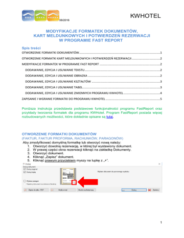 KWHOTEL 08/2016 MODYFIKACJE FORMATEK DOKUMENTÓW, KART MELDUNKOWYCH I POTWIERDZEŃ REZERWACJI W PROGRAMIE FAST REPORT Spis treści OTWORZENIE FORMATKI DOKUMENTÓW...........................................................................................1 OTWORZENIE FORMATKI KART MELDUNKOWYCH I POTWIERDZEO REZERWACJI ................................2 MODYFIKACJE FORMATEK W PROGRAMIE FAST REPORT ....................................................................2 DODAWANIE, EDYCJA I USUWANIE TEKSTU.....................................................................................2 DODAWANIE, EDYCJA I USUWANIE OBRAZKA .................................................................................2 DODAWANIE, EDYCJA I USUWANIE KSZTAŁTÓW .............................................................................3 DODAWANIE, EDYCJA I USUWANIE TABEL .......................................................................................3 DODAWANIE, EDYCJA I USUWANIE ZMIENNYCH PROGRAMU KWHOTEL .........................................4 ZAPISANIE I WGRANIE FORMATKI DO PROGRAMU KWHOTEL .............................................................5 Poniższa instrukcja przedstawia podstawowe funkcjonalności programu FastReport oraz przykłady tworzenia formatek dla programu KWHotel. Program FastReport posiada więcej rozbudowanych możliwości, które dokładnie opisane są tutaj. OTWORZENIE FORMATKI DOKUMENTÓW (FAKTUR, FAKTUR PROFORMA, RACHUNKÓW, PARAGONÓW) Aby zmodyfikować domyślną formatkę lub stworzyć nową należy: 1. Otworzyć dowolną rezerwację, w której był wystawiony dokument. 2. W prawej części okna rezerwacji kliknąć na zakładkę Dokumenty. 3. Otworzyć dokument. 4. Kliknąć „Zapisz” dokument. 5. Kliknąć prawym przyciskiem myszy na lupkę z „+”. 1 KWHOTEL 08/2016 OTWORZENIE FORMATKI KART MELDUNKOWYCH I POTWIERDZEŃ REZERWACJI Aby zmodyfikować domyślną formatkę lub stworzyć nową należy: 1. Otworzyć dowolną rezerwację. 2. W dolnej części okna rezerwacji kliknąć na „Wystaw dokument”. 3. Na liście wybrać dowolny dokument, który zostanie zmodyfikowany, lub na jego bazie powstanie nowy. 4. Kliknąć na dokument prawym przyciskiem myszy. MODYFIKACJE FORMATEK W PROGRAMIE FAST REPORT W oknie programu FastReport można dowolne modyfikować wygląd formatek. DODAWANIE, EDYCJA I USUWANIE TEKSTU W celu dodania tekstu w formatce należy: Kliknąć w menu bocznym po lewej stronie na ikonę . Kliknąć na formatce w miejscu gdzie ma pojawić się tekst. Pole można poszerzyć przeciągając obramowanie pola tekstowego. Klikając szybko dwukrotnie lewym przyciskiem myszy pojawi się okno, gdzie należy wpisać tekst. 5. Aby edytować czcionkę należy kliknąć na tekst i wybrać jej wygląd w górnej części okna. 1. 2. 3. 4. W celu edycji tekstu w formatce należy dwukrotnie szybko kliknąć lewym przyciskiem myszy na tekście i w oknie wpisać poprawny tekst. W celu usunięcia tekstu w formatce należy kliknąć lewym przyciskiem myszy na tekście, a następnie wcisnąć na klawiaturze klawisz „Delete”. DODAWANIE, EDYCJA I USUWANIE OBRAZKA (np. logo, zdjęcia pokoju/apartamentu itp.) W celu dodania obrazka w formatce należy: 1. Kliknąć w menu bocznym po lewej stronie na ikonę . 2. Kliknąć na formatce w miejscu gdzie ma pojawić się obrazek. 3. Klikając szybko dwukrotnie lewym przyciskiem myszy pojawi się okno, gdzie należy wgrać obrazek. 4. Kliknąć „Załaduj”, wybrać plik i kliknąć „Otwórz”, a następnie „Zatwierdź”. 5. Obrazek można poszerzyć przeciągając jego obramowanie. W celu edycji (podmiany) obrazka w formatce należy dwukrotnie szybko kliknąć lewym przyciskiem myszy na jego polu i w oknie wybrać nowy obrazek. 2 KWHOTEL 08/2016 W celu usunięcia obrazka w formatce należy kliknąć na nim lewym przyciskiem myszy, a następnie wcisnąć na klawiaturze klawisz „Delete”. DODAWANIE, EDYCJA I USUWANIE KSZTAŁTÓW (np. tworzenie obramówki formatki itp.) W celu dodania kształtu w formatce należy: 1. Kliknąć w menu bocznym po lewej stronie na ikonę . 2. Kliknąć na formatce w miejscu gdzie ma pojawić się kształt. 3. Kształt można poszerzyć przeciągając jego obramowanie. W celu edycji kształtu w formatce należy kliknąć na nim lewym przyciskiem myszy, a następnie przeciągnąć jego obramowanie. W celu usunięcia kształtu w formatce należy kliknąć na nim lewym przyciskiem myszy, a następnie wcisnąć na klawiaturze klawisz „Delete”. DODAWANIE, EDYCJA I USUWANIE TABEL (np. tworzenie cenników itp.) W celu dodania tabeli w formatce należy: 1. Kliknąć w menu bocznym po lewej stronie na ikonę . 2. Kliknąć na formatce w miejscu gdzie ma pojawić się tabela. Uwaga! Domyślna tabela pojawi się bez obramowania. W celu jego dodania należy w górnej części okna kliknąć na 3. Aby edytować tabelę należy ją zaznaczyć klikając na . Aby edytować pojedynczą komórkę należy kliknąć, aby się podświetliła. 4. Aby uzupełnić daną komórkę należy szybko dwukrotnie na nią kliknąć. 5. Zmianę parametrów, np. liczbę kolumn, wyrównanie itp. można modyfikować w prawej części okna w zakładce „Właściwości” wpisując wartości, rozwijając listę lub modyfikując zmienne . 3 KWHOTEL 08/2016 Położenie Dock Usytuowanie tabeli na stronie High Wysokość tabeli Width Szerokość tabeli Padding Odsunięcie tekstu od ścian komórki Wygląd Border Obramowanie tabeli ColumnCount Liczba kolumn RowCount Liczba wierszy Font HorzAlign Czcionka Wypełnienie (kolorem / gradientem) komórki Wyrównanie tekstu w poziomie VertAlign Wyrównanie tekstu w pionie Underlines Podkreślenie Fill W celu usunięcia tabeli w formatce należy kliknąć na niej lewym przyciskiem myszy, a następnie wcisnąć na klawiaturze klawisz „Delete”. DODAWANIE, EDYCJA I USUWANIE ZMIENNYCH PROGRAMU KWHOTEL (np. liczby osób, typu posiłków, kwot itp.) W celu dodania zmiennych wypełni