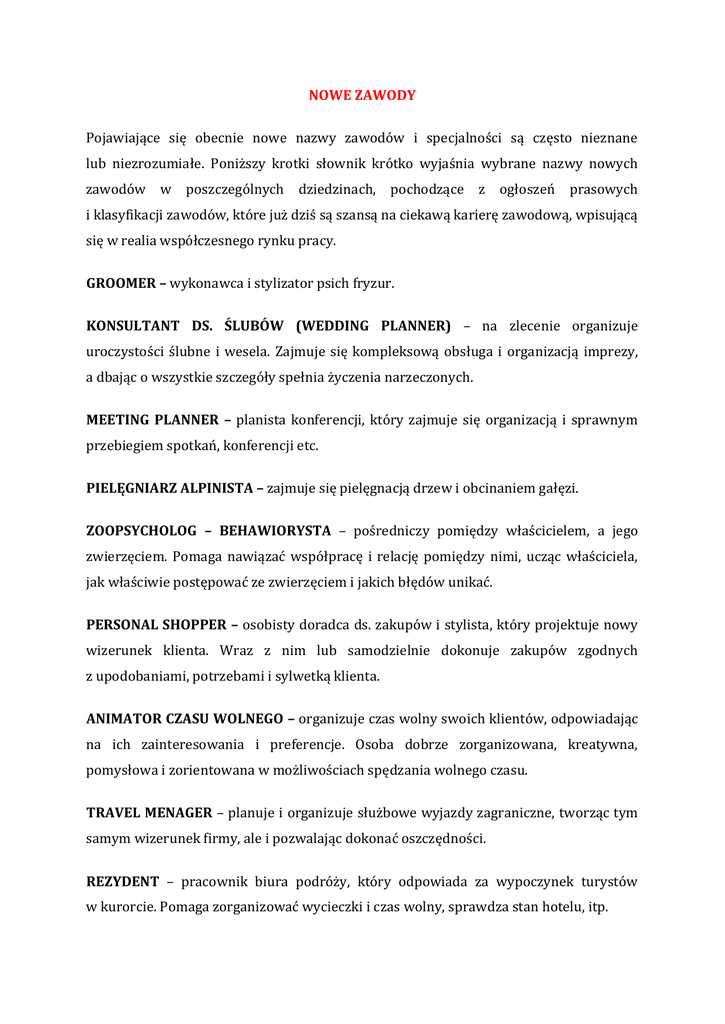 NOWE ZAWODY Pojawiające się obecnie nowe nazwy zawodów i specjalności są często nieznane lub niezrozumiałe. Poniższy krotki słownik krótko wyjaśnia wybrane nazwy nowych zawodów w poszczególnych dziedzinach, pochodzące z ogłoszeń prasowych i klasyfikacji zawodów, które już dziś są szansą na ciekawą karierę zawodową, wpisującą się w realia współczesnego rynku pracy. GROOMER – wykonawca i stylizator psich fryzur. KONSULTANT DS. ŚLUBÓW (WEDDING PLANNER) – na zlecenie organizuje uroczystości ślubne i wesela. Zajmuje się kompleksową obsługa i organizacją imprezy, a dbając o wszystkie szczegóły spełnia życzenia narzeczonych. MEETING PLANNER – planista konferencji, który zajmuje się organizacją i sprawnym przebiegiem spotkań, konferencji etc. PIELĘGNIARZ ALPINISTA – zajmuje się pielęgnacją drzew i obcinaniem gałęzi. ZOOPSYCHOLOG – BEHAWIORYSTA – pośredniczy pomiędzy właścicielem, a jego zwierzęciem. Pomaga nawiązać współpracę i relację pomiędzy nimi, ucząc właściciela, jak właściwie postępować ze zwierzęciem i jakich błędów unikać. PERSONAL SHOPPER – osobisty doradca ds. zakupów i stylista, który projektuje nowy wizerunek klienta. Wraz z nim lub samodzielnie dokonuje zakupów zgodnych z upodobaniami, potrzebami i sylwetką klienta. ANIMATOR CZASU WOLNEGO – organizuje czas wolny swoich klientów, odpowiadając na ich zainteresowania i preferencje. Osoba dobrze zorganizowana, kreatywna, pomysłowa i zorientowana w możliwościach spędzania wolnego czasu. TRAVEL MENAGER – planuje i organizuje służbowe wyjazdy zagraniczne, tworząc tym samym wizerunek firmy, ale i pozwalając dokonać oszczędności. REZYDENT – pracownik biura podróży, który odpowiada za wypoczynek turystów w kurorcie. Pomaga zorganizować wycieczki i czas wolny, sprawdza stan hotelu, itp. BARISTA – zajmuje się doborem, parzeniem i podawaniem kawy, co uatrakcyjnia wizyty w kawiarniach i restauracjach. EGZAMINATOR ONLINE – osoba zajmująca się przygotowywaniem, przeprowadzaniem i oceną testów i sprawdzianów wypełnianych przez osobę uczącą się za pośrednictwem np. internetowych platform edukacyjnych. Jeden z zawodów powstały w ramach e-learningu. TAKSATOR – rzeczoznawca, wyspecjalizowany w szacowaniu wartości nieruchomości. SPECJALISTA DS. TELEBANKINGU – nadzoruje i udoskonala sposób kontaktu między klientem a bankiem, głownie w obszarze internetowej obsługi kont. FUNDRAISER – zdobywa źródła finansowania dla organizacji pozarządowych (non-profit) i projektów przez nie realizowanych, pisze wnioski, pozyskuje fundusze, poszukuje sponsorów. DORADCA DO SPRAW ŻYWIENIA – przygotowuje klientowi dietę dopasowaną do jego potrzeb, stanu zdrowia oraz zasad zdrowego odżywiania, a także daje dodatkowe zalecenia odnośnie aktywności fizycznej ORTOPTYSTA – bada i diagnozuje wady wzroku, dostosowuje soczewki do indywidualnych potrzeb człowieka. TRENDSETTER – „żywa reklama” produktu lub marki. Osoba modna i charyzmatyczna, bywająca w miejscach spotkań potencjalnych odbiorców produktu, gdzie swoją osobą reklamuje towar. COOLHUNTER – osoba zawodowo zajmująca się obserwacją i wyłapywaniem nowych trendów w modzie i stylu życia, pojawiających się zwłaszcza wśród młodych grup klientów. Praca polega na przebywaniu wśród interesującej nas grupy i obserwowaniu ich zachowań. COPYWRITER – twórca haseł reklamowych, scenariuszy reklam, pomysłów promujących produkt lub usługę. SPECJALISTA DS. SOCIAL MEDIA – osoba kreująca wizerunek firmy, instytucji lub indywidualnego klienta w portalach społecznościowych, poprzez nadzór nad profilem. SPECJALISTA DS. MARKETINGU INTERNETOWEGO (INTERNET MARKETING SPECIALIST) - osoby promujący produkt i markę za pośrednictwem Internetu, wdrażający kampanie reklamowe za pośrednictwem dostępnych narzędzi, czyli: badań online, pozycjonowania stron (czyli umieszczaniem strony internetowej produktu wśród pierwszych wyników wyszukiwarki), tworzenia wizerunku w mediach społecznościowych, marketingu szeptanego, umieszczania notek prasowych, itp. SPECJALISTA DS. MARKETINGU SIECIOWEGO – tworzy sieć dystrybucji i sprzedaży internetowej, kontroluje transakcje. MERCHANDISER – dba o odpowiednią ekspozycję produktu, rozmieszczenie towarów w sklepie, zachowaniem porządku na pólkach i w magazynie. MYSTERY CLIENT (SHOPPER) – udając klienta oferowanych usług, ocenia i sprawdza jakość obsługi, uczciwość pracowników, po czym przesyła sprawozdanie do osoby, która go wynajęła. WEBMASTER – projektuje, wykonuje i instaluje Internecie strony WWW. ANALITYK SYSTEMÓW KOMPUTEROWYCH – ocenia i analizuje sprzęt oraz systemy komputerowe pod kątem konkretnych zastosowań. Usprawnia i obniża koszty przetwarzania danych. BROKER INFORMACJI (INFOBROKER lub RESEARCHER) – zajmuje się wyszukiwaniem informacji. Wie, gdzie i jak szukać oraz jak można wykorzystać i przedstawić informacje. DYDAKTYK APLIKACJI MEDIALNYCH/MEDIALNY (INSTRUCTIONAL DESIGNER) – tworzy programy umożliwiające naukę od wyboru materiału po jego przedstawienie, wykorzystując przy tym nowoczesne technologie jak nośniki informacji, Internet, platformy e-learningowe. MECHATRONIK – zawód łączący wiedzę z zakresu mechaniki, elektroniki i informatyki, polegający na poprawie funkcjonowania urządzeń i systemów technicznych poprzez nadzór nad wysokowyspecjalizowanym sprzętem i systemami mechatronicznymi. KIEROWNIK WSPARCIA TECHNICZNEGO (HELP DESK MANAGER) – koordynuje działania centrum informatycznego w dużych firmach, dzięki czemu sprawnie działają wszystkie systemy, sprzęty i oprogramowania komputerowe w firmie. ADMINISTRATOR SIECI KOMPUTEROWEJ (NETWORK ADMINISTRATOR) – zapewnia sprawne i efektywne funkcjonowanie sieci komputerowej w firmie lub urzędzie oraz wsparcie techniczne jej użytkowników. SCREENDESIGNER – projektuje układ e