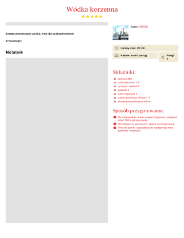 Wódka korzenna Autor: RENIZ Bardzo aromatyczna wódka, tylko dla osób pełnoletnich Smacznego! Łączny czas: 20 min. Notatnik Kalorie: kcal/1 porcję Porcji: 1 Składniki: spirytus 250 miód naturalny 100 cynamon laska 0,5 goździki 3 ziele angielskie 3 cukier wanilinowy Winiary 15 skórka pomarańczowa otarta 1 Sposób przygotowania: Do roztopionego miodu wsypać przyprawy, podgrzać, dolać 150ml gorącej wody. Wymieszać ze spirytusem i skórką pomarańczową. Wlać do butelki i pozostawić do następnego dnia, podawać na gorąco.