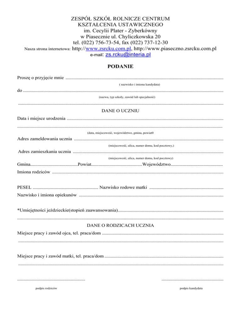 ZESPÓŁ SZKÓŁ ROLNICZE CENTRUM KSZTAŁCENIA USTAWICZNEGO im. Cecylii Plater - Zyberkówny w Piasecznie ul. Chyliczkowska 20 tel. (022) 756-73-54, fax (022) 737-12-30 Nasza strona internetowa: http://www.zsrcku.com.pl, http://www.piaseczno.zsrcku.com.pl e-mail: [email protected] PODANIE Proszę o przyjęcie mnie .................................................................................................................................. ( nazwisko i imiona kandydata) do ..................................................................................................................................................................... (nazwa, typ szkoły, zawód lub specjalność) ......................................................................................................................................................................... DANE O UCZNIU Data i miejsce urodzenia ................................................................................................................................. ......................................................................................................................................................................... (data, miejscowość, województwo, gmina, powiat0 Adres zameldowania ucznia ........................................................................................................................... (miejscowość, ulica, numer domu, kod pocztowy,) Adres zamieszkania ucznia ............................................................................................................................ (miejscowość, ulica, numer domu, kod pocztowy) Gmina.......................................Powiat..........................................Województwo........................................... Imiona rodziców ............................................................................................................................................. PESEL ...................................................... Nazwisko rodowe matki ............................................................. Nazwisko i imiona opiekunów ....................................................................................................................... *Umiejętności jeździeckie(stopień zaawansowania)....................................................................................... .......................................................................................................................................................................... DANE O RODZICACH UCZNIA Miejsce pracy i zawód ojca, tel. praca/dom .................................................................................................... ......................................................................................................................................................................... Miejsce pracy i zawód matki, tel. praca/dom .................................................................................................. ......................................................................................................................................................................... ........................................................ podpis rodziców ................................................... podpis kandydata *wypełniają kandydaci do Technikum Hodowli Koni Dyrekcja Gimnazjum w .......................................................................................................... stwierdza, że ............................................................................................................................. jest uczennicą klasy III-ej Przedmiot nauczania Zachowanie Oceny za I semestr kl. III .................................. Religia .................................. Język polski .................................. Język angielski .................................. Język ................... .................................. Matematyka .................................. Historia ................................... Geografia ................................... Biologia ................................... Fizyka ................................... Chemia ................................... Informatyka ................................... Plastyka – sztuka ................................... Muzyka ................................... Wychowanie fizyczne ................................... Wiedza o społeczeństwie ................................... .......................................... Osiągnięcia ............................................. ( wychowawca klasy) ( dyrektor szkoły ) DECYZJA ZESPOŁU KWALIFIKACYJNEGO Uczeń / Uczennica ......................................................................................................................... został / a/ przyjęty /a/ do klasy I-ej ................................................................................................................................. ( nazwa szkoły ) na podstawie : ................................................................................................................................................. Członkowie Zespołu ...................................... ...................................... Przewodniczący Zespołu