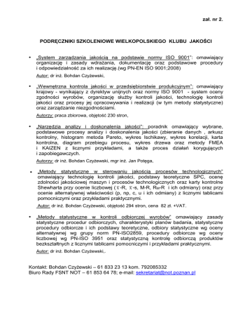 zał. nr 2. PODRĘCZNIKI SZKOLENIOWE WIELKOPOLSKIEGO KLUBU JAKOŚCI • „System zarządzania jakością na podstawie normy ISO 9001”: omawiający organizację i zasady wdrażania, dokumentację oraz podstawowe procedury i odpowiedzialność za ich realizację.(wg PN-EN ISO 9001;2008) Autor: dr inż. Bohdan Czyżewski, • „Wewnętrzna kontrola jakości w przedsiębiorstwie produkcyjnym”: omawiający krajowy - wynikający z dyrektyw unijnych oraz normy ISO 9001 - system oceny zgodności wyrobów, organizację służby kontroli jakości, technologię kontroli jakości oraz procesy jej opracowywania i realizacji (w tym metody statystyczne) oraz zarządzanie niezgodnościami. Autorzy: praca zbiorowa, objętość 230 stron, • „Narzędzia analizy i doskonalenia jakości”: poradnik omawiający wybrane, podstawowe procesy analizy i doskonalenia jakości (zbieranie danych , arkusz kontrolny, histogram metoda Pareto, wykres Ischikawy, wykres korelacji, karta kontrolna, diagram przebiegu procesu, wykres drzewa oraz metody FMEA i KAIZEN z licznymi przykładami, a także proces działań korygujących i zapobiegawczych. Autorzy: dr inż. Bohdan Czyżewski, mgr inż. Jan Potęga, „Metody statystyczne w sterowaniu jakością procesów technologicznych” omawiający technologię kontroli jakości, podstawy teoretyczne SPC, ocenę zdolności jakościowej maszyn i procesów technologicznych oraz karty kontrolne Shewharta przy ocenie liczbowej ( x -R, x -s, M-R, RM-R i ich odmiany) oraz przy ocenie alternatywnej właściwości (p, np, c, u i ich odmiany) z licznymi tablicami pomocniczymi oraz przykładami praktycznymi. Autor: dr inż. Bohdan Czyżewski, objętość 294 stron, cena 82 zł. +VAT. • „Metody statystyczne w kontroli odbiorczej wyrobów” omawiający zasady statystyczne procedur odbiorczych, charakterystyki planów badania, statystyczne procedury odbiorcze i ich podstawy teoretyczne, odbiory statystyczne wg oceny alternatywnej wg grupy norm PN-ISO2859, procedury odbiorcze wg oceny liczbowej wg PN-ISO 3951 oraz statystyczną kontrolę odbiorczą produktów bezkształtnych z licznymi tablicami pomocniczymi i przykładami praktycznymi. Autor: dr inż. Bohdan Czyżewski,. Kontakt: Bohdan Czyżewski – 61 833 23 13 kom. 792085332 Biuro Rady FSNT NOT – 61 853 64 78; e-mail: [email protected]