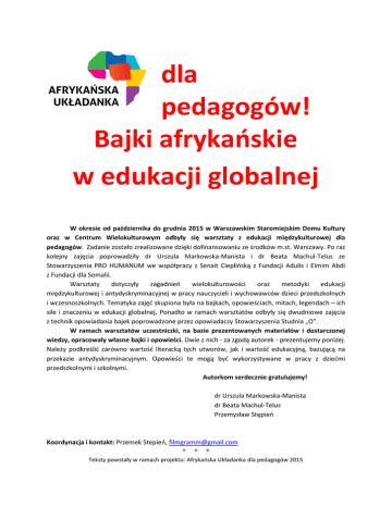 dla pedagogów! Bajki afrykańskie w edukacji globalnej W okresie od października do grudnia 2015 w Warszawskim Staromiejskim Domu Kultury oraz w Centrum Wielokulturowym odbyły się warsztaty z edukacji międzykulturowej dla pedagogów. Zadanie zostało zrealizowane dzięki dofinansowaniu ze środków m.st. Warszawy. Po raz kolejny zajęcia poprowadziły dr Urszula Markowska-Manista i dr Beata Machul-Telus ze Stowarzyszenia PRO HUMANUM we współpracy z Senait Cieplińską z Fundacji Adulis i Elmim Abdi z Fundacji dla Somalii. Warsztaty dotyczyły zagadnień wielokulturowości oraz metodyki edukacji międzykulturowej i antydyskryminacyjnej w pracy nauczycieli i wychowawców dzieci przedszkolnych i wczesnoszkolnych. Tematyka zajęć skupiona była na bajkach, opowieściach, mitach, legendach – ich sile i znaczeniu w edukacji globalnej. Ponadto w ramach warsztatów odbyły się dwudniowe zajęcia z technik opowiadania bajek poprowadzone przez opowiadaczy Stowarzyszenia Studnia „O”. W ramach warsztatów uczestniczki, na bazie prezentowanych materiałów i dostarczonej wiedzy, opracowały własne bajki i opowieści. Dwie z nich - za zgodą autorek - prezentujemy poniżej. Należy podkreślić zarówno wartość literacką tych utworów, jak i wartość edukacyjną, bazującą na przekazie antydyskryminacyjnym. Opowieści te mogą być wykorzystywane w pracy z dziećmi przedszkolnymi i szkolnymi. Autorkom serdecznie gratulujemy! dr Urszula Markowska-Manista dr Beata Machul-Telus Przemysław Stępień Koordynacja i kontakt: Przemek Stepień, [email protected] * * * Teksty powstały w ramach projektu: Afrykańska Układanka dla pedagogów 2015 Autorka: Maja Laskus Otieno Dawno temu, a może wcale nie tak dawno w niewielkiej wiosce żył chłopiec. Dom jego zbudowany był z nisko osadzonych desek okrytych kozimi skórami. Na niewielkiej powierzchni żyło 8 osób, rodzice chłopca i sześcioro dzieci. Otieno, bo tak miał na imię, pomagał rodzicom każdego dnia. Pewnego razu opiekunowie oznajmili, że musi chodzić do szkoły. Otieno był bardziej ciekawski niż strachliwy, więc chętnie, uległ woli rodziców. Radość jego nie trwała jednak długo. Uczniowie, wyśmiewali się z Otieno, z jego ubrania ze starego lnianego worka i butów z resztek opon, skórę miał zniszczoną od ciężkiej pracy, ostrego zboża i słońca, a jego słownictwo było ubogie. Okrutne dzieci podchwyciły to w oka mgnieniu, szykanowany i wyśmiewany chłopiec zrozpaczony wrócił do domu. Ojciec wysłuchał jego relacji z minionego dnia, lecz nie odwołał swojej decyzji „Masz chodzić do szkoły, aby pewnego dnia móc uwierzyć w siebie, dzięki mądrości i sile, żyć lepiej niż ja”. Chłopiec nie chciał zawieść oczekiwań ojca, więc wytrwale mimo niechęci kolegów, uczęszczał do szkoły każdego dnia. Między zajęciami inne dzieci spędzały czas, bawiąc się zabawkami kupionymi na bogatych targach, on konstruował zabawki z drewna i liści, wszystkiego co znalazło się pod ręką, tak powstawał samochód i lalka i piłka i dzida. Jego pomysłowość nie została doceniona lecz wyśmiana szyderczym rykiem zebranych wkoło dzieci. I nic nie działało, żadne szepty i prośby, ani jedno tłumaczenie nie dochodziło do przekonanych o swojej racji dzieci. „Zniszczyć biednego” wołały. Otieno niejednokrotnie wracał do domu sponiewierany, resztą sił z siniakami i guzami. Ojciec tłumaczył wciąż, że musi być silny i ponad to wszystko. Pewnego dnia Otieno wracał suchą doliną, korytem wyschniętej rzeki, w rękach trzymał swoje zniszczone przez uczniów zabawki. Gdy nagle przed sobą na brzegu koryta ujrzał Berko, (chłopca stojącego na czele szajki, która znęcała się nad nim podczas zajęć szkolnych), chłopiec stał nieruchomo, ani pisnął nawet wtedy, gdy ujrzał swojego wielkiego wroga jakim Otieno był w jego oczach. Ponad chłopcem niewielkiego wzrostu pojawiła się wielka Mamba. Otieno nie mógł uwierzyć własnym oczom, że ten chłopak, który nie miał litości, dla niego, sam teraz jest całkowicie bezbronny. Otieno cechowała wielka odwaga, dlatego nie zastanawiając się długo, ruszył na pomoc swojemu oprawcy, wykorzystując tak wielce wyśmianą własnoręcznie zrobioną dzidę. Powalił węża czterema równymi ciosami, tak że ten nie miał szans, ani przeżycia ani zrobienia krzywdy któremuś z nich. Berko całkowicie zdezorientowany i przerażony całą sytuacją wrzeszczał za chłopcem nie inaczej niż wtedy, gdy ten znajdował się w szkole. „Uciekaj biedaku, zniszczę Cię zobaczysz”. Otieno w swojej skromności nie oczekiwał niczego innego, dobiegł szybko do domu i ze zmęczenia zasnął. Jednak ani na drugi dzień, ni w kolejny i cztery następne nie wstał z posłania, ogarnęły go poty i wielka gorączka, którą matka starała się zwalczyć zimnymi okładami i parzoną we wrzątku roślinnością. Siódmego dnia na progu chałupy pojawiła się znana Otieno postać. Gdy doszło do niego kim jest chłopak przed jego oczami zaczął się z lękiem cofać w głąb posłania. Berko tym razem jednak nie powiedział, ani słowa położył koło niego niewielkie zawiniątko i wyszedł. Otieno wyzdrowiał. Wrócił do szkoły. Nie miał w niej przyjaciół. Ale wszyscy uczniowie zachowywali wobec niego dystans, który pozwolił mu wykształcić się i spełnić oczekiwania Ojca. Otieno, zapisując ostatnią kartę w szkole napisał „Uważaj z kogo szydzisz, bo nigdy do końca wiedzieć nie możesz, kto oprawcą Twoim, a kto wybawicielem”. Warszawa, grudzień 2015 Teksty powstały w ramach projektu: Afrykańska Układanka dla pedagogów 2015 Autorka: Jagoda Matwiejczuk Przygody pewnej Lalki… Dawno, dawno temu. Za siedmioma górami, za siedmioma lasami w małym Nigeryjskim miasteczku mieszkała 6-letnia Nneoma. Nneoma bardzo lubiła poznawać nowe rzeczy, bawić się z przyjaciółmi ale najbardziej lubiła bawić się swoją lalk