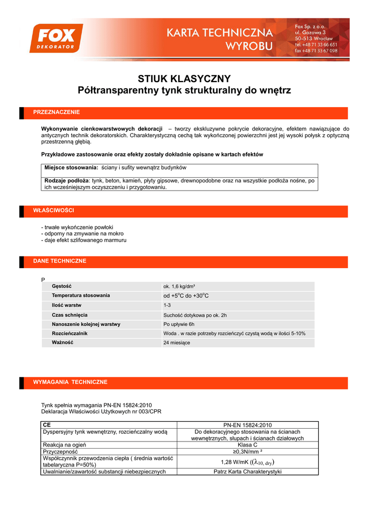 STIUK KLASYCZNY Półtransparentny tynk strukturalny do wnętrz PRZEZNACZENIE Wykonywanie cienkowarstwowych dekoracji – tworzy ekskluzywne pokrycie dekoracyjne, efektem nawiązujące do antycznych technik dekoratorskich. Charakterystyczną cechą tak wykończonej powierzchni jest jej wysoki połysk z optyczną przestrzenną głębią. Przykładowe zastosowanie oraz efekty zostały dokładnie opisane w kartach efektów Miejsce stosowania: ściany i sufity wewnątrz budynków Rodzaje podłoża: tynk, beton, kamień, płyty gipsowe, drewnopodobne oraz na wszystkie podłoża nośne, po ich wcześniejszym oczyszczeniu i przygotowaniu. WŁAŚCIWOŚCI - trwałe wykończenie powłoki - odporny na zmywanie na mokro - daje efekt szlifowanego marmuru DANE TECHNICZNE P Gęstość ok. 1,6 kg/dm³ Temperatura stosowania od +5 C do +30 C Ilość warstw 1-3 Czas schnięcia Suchość dotykowa po ok. 2h Nanoszenie kolejnej warstwy Po upływie 6h Rozcieńczalnik Woda . w razie potrzeby rozcieńczyć czystą wodą w ilości 5-10% Ważność 24 miesiące o o WYMAGANIA TECHNICZNE Tynk spełnia wymagania PN-EN 15824:2010 Deklaracja Właściwości Użytkowych nr 003/CPR CE Dyspersyjny tynk wewnętrzny, rozcieńczalny wodą Reakcja na ogień Przyczepność Współczynnik przewodzenia ciepła ( średnia wartość tabelaryczna P=50%) Uwalnianie/zawartość substancji niebezpiecznych PN-EN 15824:2010 Do dekoracyjnego stosowania na ścianach wewnętrznych, słupach i ścianach działowych Klasa C ≥0,3N/mm ² 1,28 W/mK ((λ10, dry) Patrz Karta Charakterystyki Posiada Atest Higieniczny PZH NAKŁADANIE Przygotowanie podłoża: Podłoże powinno być: dostatecznie nośne, wysezonowane do stanu powietrzno-suchego- przyjmuje się, że czas sezonowania podłoży wynosi odpowiednio ( w warunkach normalnych, czyli ok. 20 °C i 55 % wilgotności – w innych warunkach czas wysychania może się wydłużyć. - dla tynków gipsowych, cementowych i cementowo-wapiennych – min. 1 tydzień na każdy cm grubości, - dla ścian i stropów betonowych- co najmniej 28 dni, oczyszczone z warstw mogących osłabić przyczepność produktu, zwłaszcza z kurzu, brudu, wapna, olejów, tłuszczów, resztek farb i innych zagruntowane – GRUNTEM SCZEPNYM FOX DEKORATOR. Przygotowanie produktu : Produkt jest gotowy do użycia. Przed rozpoczęciem pracy należy całość dokładnie wymieszać. Barwienie: Przy użyciu pigmentów z tubkowego systemu kolorowania FOX DEKORATOR oraz w systemie NCS. Nakładanie: Przed przystąpieniem do pracy należy zaplanować kolejność i sposób nakładania warstw oraz sprawdzić ostateczny efekt na małej próbce! 1 warstwa: STIUK KLASYCZNY FOX DDEKORATOR należy nałożyć pacą ze stali nierdzewnej i wygładzić. Odpowiednie operowanie narzędziem umożliwia stworzenie „rysunku” dekorowanej powierzchni. Należy pamiętać, że „rysunek” pojawi się jako efekt przy wybłyszczaniu finalnej warstwy. 2 warstwa: Przed przystąpieniem do nakładania drugiej i trzeciej warstwy należy sprawdzić stan krawędzi pacy – muszą być idealne. Najlepiej przeszlifować je papierem ściernym 2000, aby były równe i ostre. Należy każdorazowo nabierać niewielką ilość materiału na krawędź pacy. Nakładać cienką warstwę produktu na niewielkie fragmenty powierzchni (metodą: nałożyć i zebrać), delikatnie przyciskając i przeciągając po nałożonej warstwie ostrym kantem pacy, zawsze zaczynając na suchej części i kończąc na mokrej (metoda ta pozwala uniknąć śladów po pacy). W ten sposób wykonać pracę na całej powierzchni. 3 warstwa: Jest podobna do drugiej, z tym, że po nałożeniu STIUKU, w czasie jego przesychania „wybłyszczamy” go. Należy w tym celu kilkakrotnie mocno przeciągać ostrym kantem pacy po dekorowanej powierzchni. Przy wybłyszczaniu konieczne jest utrzymywanie ostrza pacy w idealnej czystości (najlepiej usuwać jakiekolwiek ślady materiału za pomocą wilgotnej szmatki). Dla uzyskania efektów zdobniczych przy użyciu szablonów dekoratorskich, należy wykonać ich aplikacje przed wykonaniem pierwszej lub drugiej warstwy. Efekty pojawią się jako dekoracyjne przebarwienia w czasie wybłyszczania ostatecznej warstwy. Zabezpieczanie woskiem: WOSK DEKORACYJNY FOX DEKORATOR należy nanosić przy użyciu pacy na powierzchnię 0,5 do 0,7 m2 i równomiernie rozprowadzić cienką warstwę, a następnie wypolerować powierzchnię. Efekt dekoracyjny zależny jest w głównej mierze od inwencji dekorującego, a także narzędzi oraz technik użytych do stworzenia „rysunku”. Przed przystąpieniem do pracy należy zaplanować kolejność i sposób nakładania warstw. Zalecamy sprawdzenie ostatecznego efektu na małej próbce. Przykładowe techniki nakładania produktu zostały dokładnie opisane w kartach efektów, dostępnych na stronie www.fox-dekorator.pl ZUŻYCIE Średnio zużywa się 0,5-0,6 kg/m² na 1 warstwę (1kg produktu daje ok.2m2 dekoracji). Wydajność zależy od struktury i chłonności podłoża, od sposobu jego przygotowania, od zamierzonego efektu dekoracyjnego, od doświadczenia wykonawcy, od ilości warstw, od wybranej metody aplikacyjnej. WAŻNE INFORMACJE DODATKOWE Użyte narzędzia należy umyć wodą natychmiast po zakończeniu prac Chronić przed dziećmi . Unikać zanieczyszczenia oczu i skóry. Zanieczyszczone oczy przemyć natychmiast dużą ilością wody i zasięgnąć porady lekarza. Nosić odpowiednią odzież ochronną, rękawice ochronne i okulary lub ochronę twarzy. W razie połknięcia niezwłocznie zasięgnąć porady lekarza- pokazać opakowanie lub etykietkę. Postępować zgodnie z Kartą Charakterystyki. Przewozić i przechowywać w szczelnie zamkniętych opakowaniach, w warunkach suchych. Chronić przed przegrzaniem i o o przemrożeniem. Nakładać w temperaturze od +5 C do +30 C. Przy niskiej temperaturze i/lub podwyższonej wilgotności czas schnięcia wydłuża się W karcie informacyjnej niemożliwe jest opisanie wszystk