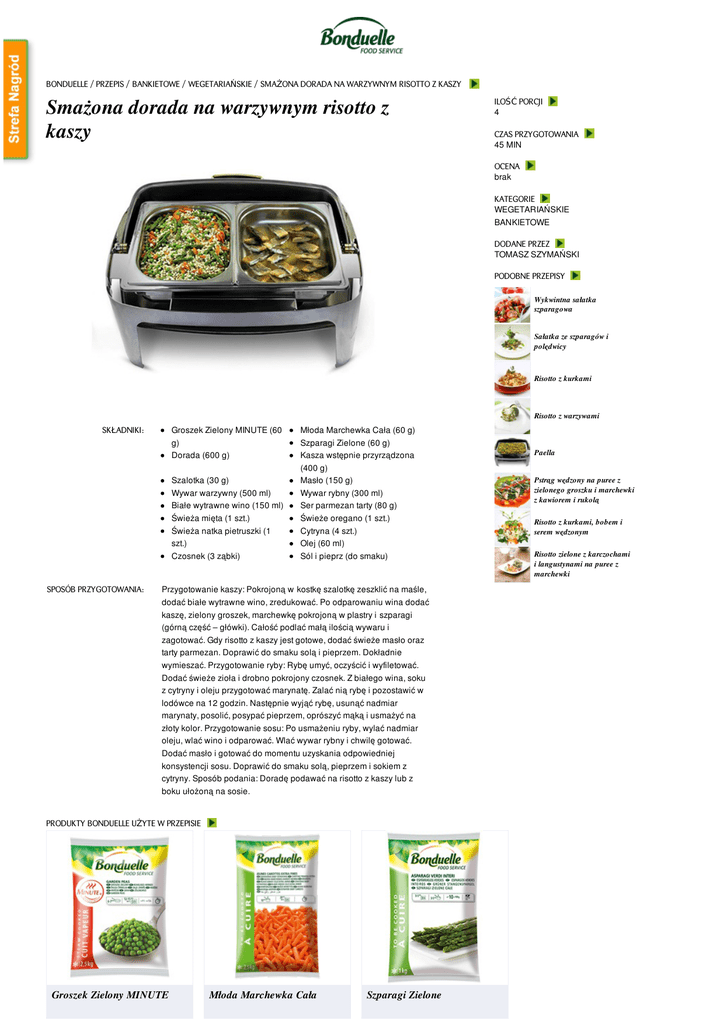 BONDUELLE / PRZEPIS / BANKIETOWE / WEGETARIAŃSKIE / SMAŻONA DORADA NA WARZYWNYM RISOTTO Z KASZY Smażona dorada na warzywnym risotto z kaszy ILOŚĆ PORCJI 4 CZAS PRZYGOTOWANIA 45 MIN OCENA brak KATEGORIE WEGETARIAŃSKIE BANKIETOWE DODANE PRZEZ TOMASZ SZYMAŃSKI PODOBNE PRZEPISY Wykwintna sałatka szparagowa Sałatka ze szparagów i polędwicy Risotto z kurkami Risotto z warzywami Groszek Zielony MINUTE (60 g) Dorada (600 g) SKŁADNIKI: Szalotka (30 g) Wywar warzywny (500 ml) Białe wytrawne wino (150 ml) Świeża mięta (1 szt.) Świeża natka pietruszki (1 szt.) Czosnek (3 ząbki) SPOSÓB PRZYGOTOWANIA: Młoda Marchewka Cała (60 g) Szparagi Zielone (60 g) Kasza wstępnie przyrządzona (400 g) Masło (150 g) Wywar rybny (300 ml) Ser parmezan tarty (80 g) Świeże oregano (1 szt.) Cytryna (4 szt.) Olej (60 ml) Sól i pieprz (do smaku) Przygotowanie kaszy: Pokrojoną w kostkę szalotkę zeszklić na maśle, dodać białe wytrawne wino, zredukować. Po odparowaniu wina dodać kaszę, zielony groszek, marchewkę pokrojoną w plastry i szparagi (górną część – główki). Całość podlać małą ilością wywaru i zagotować. Gdy risotto z kaszy jest gotowe, dodać świeże masło oraz tarty parmezan. Doprawić do smaku solą i pieprzem. Dokładnie wymieszać. Przygotowanie ryby: Rybę umyć, oczyścić i wyfiletować. Dodać świeże zioła i drobno pokrojony czosnek. Z białego wina, soku z cytryny i oleju przygotować marynatę. Zalać nią rybę i pozostawić w lodówce na 12 godzin. Następnie wyjąć rybę, usunąć nadmiar marynaty, posolić, posypać pieprzem, oprószyć mąką i usmażyć na złoty kolor. Przygotowanie sosu: Po usmażeniu ryby, wylać nadmiar oleju, wlać wino i odparować. Wlać wywar rybny i chwilę gotować. Dodać masło i gotować do momentu uzyskania odpowiedniej konsystencji sosu. Doprawić do smaku solą, pieprzem i sokiem z cytryny. Sposób podania: Doradę podawać na risotto z kaszy lub z boku ułożoną na sosie. PRODUKTY BONDUELLE UŻYTE W PRZEPISIE Groszek Zielony MINUTE Młoda Marchewka Cała Szparagi Zielone Paella Pstrąg wędzony na puree z zielonego groszku i marchewki z kawiorem i rukolą Risotto z kurkami, bobem i serem wędzonym Risotto zielone z karczochami i langustynami na puree z marchewki MASA NETTO: 2500 g MASA NETTO: 2500 g MASA NETTO: 1000 g All rights reserved projekt i realizacja Copyright © 2012-2015 Bonduelle Agencja Reklamowa 4 ALL
