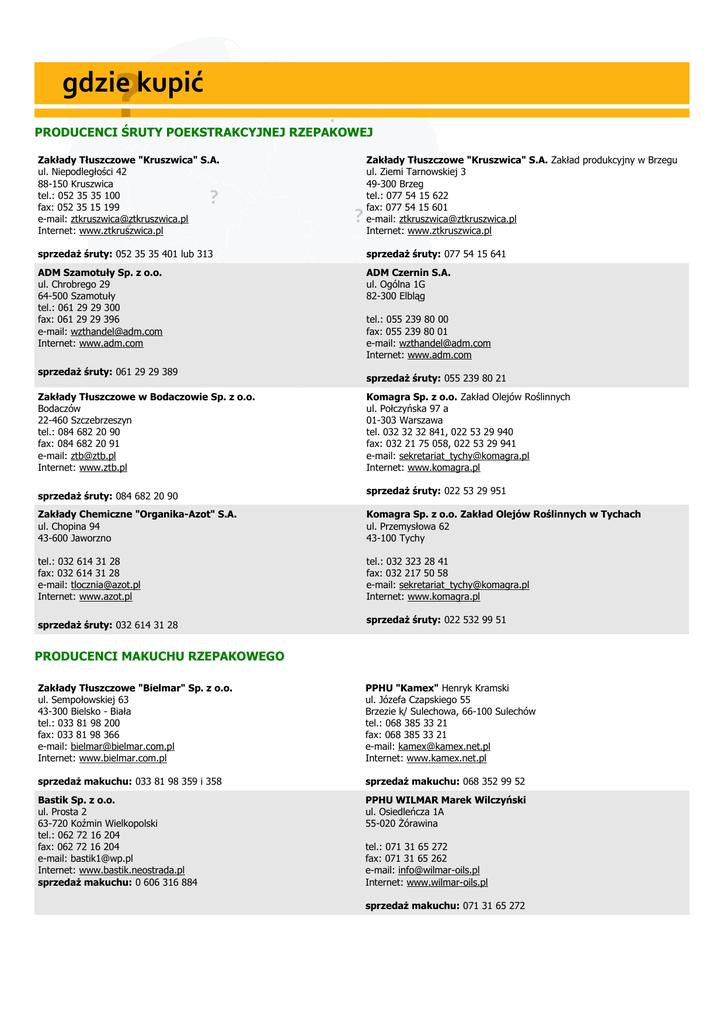 PRODUCENCI ŚRUTY POEKSTRAKCYJNEJ RZEPAKOWEJ Zakłady Tłuszczowe "Kruszwica" S.A. ul. Niepodległości 42 88-150 Kruszwica tel.: 052 35 35 100 fax: 052 35 15 199 e-mail: [email protected] Internet: www.ztkruszwica.pl Zakłady Tłuszczowe "Kruszwica" S.A. Zakład produkcyjny w Brzegu ul. Ziemi Tarnowskiej 3 49-300 Brzeg tel.: 077 54 15 622 fax: 077 54 15 601 e-mail: [email protected] Internet: www.ztkruszwica.pl sprzedaż śruty: 052 35 35 401 lub 313 sprzedaż śruty: 077 54 15 641 ADM Szamotuły Sp. z o.o. ul. Chrobrego 29 64-500 Szamotuły tel.: 061 29 29 300 fax: 061 29 29 396 e-mail: [email protected] Internet: www.adm.com ADM Czernin S.A. ul. Ogólna 1G 82-300 Elbląg sprzedaż śruty: 061 29 29 389 Zakłady Tłuszczowe w Bodaczowie Sp. z o.o. Bodaczów 22-460 Szczebrzeszyn tel.: 084 682 20 90 fax: 084 682 20 91 e-mail: [email protected] Internet: www.ztb.pl sprzedaż śruty: 084 682 20 90 tel.: 055 239 80 00 fax: 055 239 80 01 e-mail: [email protected] Internet: www.adm.com sprzedaż śruty: 055 239 80 21 Komagra Sp. z o.o. Zakład Olejów Roślinnych ul. Połczyńska 97 a 01-303 Warszawa tel. 032 32 32 841, 022 53 29 940 fax: 032 21 75 058, 022 53 29 941 e-mail: [email protected] Internet: www.komagra.pl sprzedaż śruty: 022 53 29 951 Zakłady Chemiczne "Organika-Azot" S.A. ul. Chopina 94 43-600 Jaworzno Komagra Sp. z o.o. Zakład Olejów Roślinnych w Tychach ul. Przemysłowa 62 43-100 Tychy tel.: 032 614 31 28 fax: 032 614 31 28 e-mail: [email protected] Internet: www.azot.pl tel.: 032 323 28 41 fax: 032 217 50 58 e-mail: [email protected] Internet: www.komagra.pl sprzedaż śruty: 032 614 31 28 sprzedaż śruty: 022 532 99 51 PRODUCENCI MAKUCHU RZEPAKOWEGO Zakłady Tłuszczowe "Bielmar" Sp. z o.o. ul. Sempołowskiej 63 43-300 Bielsko - Biała tel.: 033 81 98 200 fax: 033 81 98 366 e-mail: [email protected] Internet: www.bielmar.com.pl PPHU "Kamex" Henryk Kramski ul. Józefa Czapskiego 55 Brzezie k/ Sulechowa, 66-100 Sulechów tel.: 068 385 33 21 fax: 068 385 33 21 e-mail: [email protected] Internet: www.kamex.net.pl sprzedaż makuchu: 033 81 98 359 i 358 sprzedaż makuchu: 068 352 99 52 Bastik Sp. z o.o. ul. Prosta 2 63-720 Koźmin Wielkopolski tel.: 062 72 16 204 fax: 062 72 16 204 e-mail: [email protected] Internet: www.bastik.neostrada.pl sprzedaż makuchu: 0 606 316 884 PPHU WILMAR Marek Wilczyński ul. Osiedleńcza 1A 55-020 Żórawina tel.: 071 31 65 272 fax: 071 31 65 262 e-mail: [email protected] Internet: www.wilmar-oils.pl sprzedaż makuchu: 071 31 65 272
