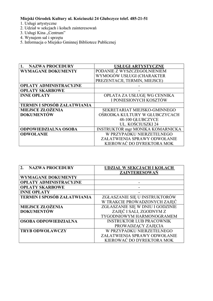Miejski Ośrodek Kultury ul. Kościuszki 24 Głubczyce telef. 485-21-51 1. Usługi artystyczne 2. Udział w sekcjach i kołach zainteresowań 3. Usługi Kina „Centrum” 4. Wynajem sal i sprzętu 5. Informacja o Miejsko Gminnej Bibliotece Publicznej 1. NAZWA PROCEDURY WYMAGANE DOKUMENTY OPŁATY ADMINISTRACYJNE OPŁATY SKARBOWE INNE OPŁATY TERMIN I SPOSÓB ZAŁATWIANIA MIEJSCE ZŁOŻENIA DOKUMENTÓW ODPOWIEDZIALNA OSOBA ODWOŁANIE 2. NAZWA PROCEDURY WYMAGANE DOKUMENTY OPŁATY ADMINISTRACYJNE OPŁATY SKARBOWE INNE OPŁATY TERMIN I SPOSÓB ZAŁATWIANIA MIEJSCE ZŁOŻENIA DOKUMENTÓW OSOBA ODPOWIEDZIALNA TRYB ODWOŁAWCZY USŁUGI ARTYSTYCZNE PODANIE Z WYSZCZEGÓLNIENIEM WYMOGÓW USŁUGI (CHARAKTER PREZENTACJI, TERMIN, MIEJSCE) OPŁATA ZA USŁUGĘ WG CENNIKA I PONIESIONYCH KOSZTÓW SEKRETARIAT MIEJSKO-GMINNEGO OŚRODKA KULTURY W GŁUBCZYCACH 48-100 GŁUBCZYCE UL. KOŚCIUSZKI 24 INSTRUKTOR mgr MONIKA KOMARNICKA W PRZYPADKU NIERZETELNEGO ZAŁATWIENIA SPRAWY ODWOŁANIE KIEROWAĆ DO DYREKTORA MOK UDZIAŁ W SEKCJACH I KOŁACH ZAINTERESOWAŃ ZGŁASZANIE SIĘ U INSTRUKTORÓW W TRAKCIE PROWADZONYCH ZAJĘĆ ZGŁASZANIE SIĘ W DNIU I GODZINIE ZAJĘĆ I SALI, ZGODNYM Z TYGODNIOWYM HARMONOGRAMEM INSTRUKTOR LUB PRACOWNIK PROWADZĄCY ZAJĘCIA W PRZYPADKU NIERZETELNEGO ZAŁATWIENIA SPRAWY ODWOŁANIE KIEROWAĆ DO DYREKTORA MOK 3. NAZWA PROCEDURY WYMAGANE DOKUMENTY OPŁATY ADMINISTRACYJNE OPŁATY SKARBOWE INNE OPŁATY TERMIN I SPOSÓB ZAŁATWIANIA MIEJSCE ZŁOŻENIA DOKUMENTÓW ODPOWIEDZIALNA OSOBA ODWOŁANIE USŁUGI KINA „CENTRUM” 1. ZAMÓWIENIE USŁUGI OPŁATA ZA USŁUGĘ ZGODNIE Z OBOWIĄZUJĄCĄ CENĄ BILETÓW SEKRETARIAT MIEJSKO-GMINNEGO OŚRODKA KULTURY W GŁUBCZYCACH 48-100 GŁUBCZYCE UL. KOŚCIUSZKI 24 INSTRUKTOR mgr TOMASZ MICHALEWSKI W PRZYPADKU NIERZETELNEGO ZAŁATWIENIA SPRAWY ODWOŁANIE KIEROWAĆ DO DYREKTORA MOK WYNAJEM SAL I SPRZĘTU 4. NAZWA PROCEDURY WYMAGANE DOKUMENTY OPŁATY ADMINISTRACYJNE OPŁATY SKARBOWE INNE OPŁATY TERMIN I SPOSÓB ZAŁATWIANIA MIEJSCE ZŁOŻENIA DOKUMENTÓW ODPOWIEDZIALNA OSOBA ODWOŁANIE 2. ZŁOŻENIE ZAMÓWIENIA 3. ZAWARCIE UMÓW OPŁATA ZA USŁUGĘ WG OBOWIĄZUJĄCEGO CENNIKA ZARZĄDZENIE DYREKTORA MOK SEKRETARIAT MIEJSKO-GMINNEGO OŚRODKA KULTURY W GŁUBCZYCACH 48-100 GŁUBCZYCE UL. KOŚCIUSZKI 24 STARSZY REFERENT RENATA STEC W PRZYPADKU NIERZETELNEGO ZAŁATWIENIA SPRAWY ODWOŁANIE KIEROWAĆ DO DYREKTORA MOK 2 Nazwa: Miejska i Gminna Biblioteka Publiczna Adres: 48-100 Głubczyce, ul. Olimpijska 1 e-mail: [email protected] Kontakt: tel./faks (077) 485 31 93, (077) 485 24 41 Agendy Biblioteki: * Wypożyczalnia dla Dorosłych * Czytelnia * Oddział dla Dzieci Godziny otwarcia: • poniedziałek – piątek 8 30 – 18 00 (Wypożyczalnia dla Dorosłych, Czytelnia) • poniedziałek – czwartek 11 00 – 18 00, piątek 8 00 – 15 00 (Oddział dla Dzieci) • 2 sobota miesiąca 8 00 – 14 00 Przedmiot działalności: • gromadzenie, opracowanie, przechowywanie i ochrona zbiorów bibliotecznych ze szczególnym uwzględnieniem materiałów dotyczących własnego regionu • udostępnianie zbiorów bibliotecznych na miejscu, wypożyczanie do domu oraz prowadzenie wypożyczeń międzybibliotecznych • prowadzenie działalności informacyjno – bibliograficznej • współdziałanie z bibliotekami samorządowymi województwa opolskiego, z bibliotekami innych sieci, instytucjami i organizacjami w rozwijaniu i zaspakajaniu potrzeb czytelniczych społeczeństwa lokalnego Księgozbiór: Liczy 47.225 woluminów; w tym literatura piękna dla dzieci - 10.806 woluminów, literatura piękna dla dorosłych - 20.396 woluminów, literatura popularnonaukowa - 16.023 woluminy. (dane na dzień 31 grudnia 2004 r.). Tematyka zgromadzonych zbiorów jest uniwersalna, ze wszystkich dziedzin wiedzy na poziomie podstawowym, średnim i wyższym. Posiadamy dzieła specjalistyczne i podręczniki akademickie. Biblioteka prenumeruje 36 tytułów czasopism. Układ książek na półkach według Uniwersalnej Klasyfikacji Dziesiętnej. Wolny dostęp do półek umożliwia czytelnikom samodzielny wybór książek. 3 Katalogi: Rejestrują na bieżąco dokumenty znajdujące się w posiadaniu Biblioteki. • katalog komputerowy (komputerowa baza zbiorów Biblioteki) • katalog alfabetyczny i rzeczowy • katalog tytułowy książek dla dzieci • kartoteka regionalna Usługi biblioteczne: Prawo do bezpłatnego korzystania z Biblioteki mają stali mieszkańcy powiatu głubczyckiego, powiatów ościennych (kędzierzyńsko-kozielskiego, krapkowickiego, prudnickiego i raciborskiego) oraz młodzież szkolna przebywająca czasowo w Głubczycach. Biblioteka wypożycza i udostępnia: • 4 książki jednorazowo na okres jednego miesiąca • informacje o regionie • informacje biblioteczne, bibliograficzne i faktograficzne • realizuje program „Ikonk@” W kwietniu 2004 roku Biblioteka przystąpiła do programu „Ikonk@” polegającym na uruchomieniu punktów dostępu do Internetu we wszystkich gminach w Polsce. Głównym celem „Ikonki” jest zapewnienie wszystkim mieszkańcom powszechnego i bezpłatnego dostępu do Internetu. Punkt taki (Czytelnia Internetowa) został otwarty w Czytelni Miejskiej i Gminnej Biblioteki Publicznej, a dostęp do Internetu możliwy jest od poniedziałku do piątku w godzinach 8 30 – 18 00 . W roku 2004 z „Ikonki” skorzystało 1.132 osób. Czytelnicy: W 2004 roku biblioteka zarejestrowała 3.164 czytelników: w tym do lat 15 - 922 osoby, od 16 do 19 lat 977 osób, od 20 do 24 lat - 584 osób, od 25 do 44 lat - 449 osób, od 45 do 60 lat -157 osób, powyżej 60 lat - 75 osób. Dzieci i młodzież ucząca się ( w tym studenci) stanowią 74.1% czytelników Biblioteki. 4