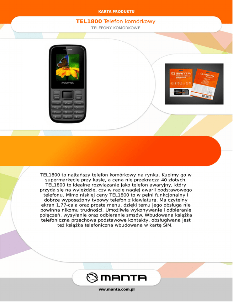 TEL1800Telefonkomórkowy TELEFONYKOMÓRKOWE TEL1800tonajtańszytelefonkomórkowynarynku.Kupimygow supermarkecieprzykasie,acenanieprzekracza40złotych. TEL1800toidealnerozwiązaniejakotelefonawaryjny,który przydasięnawyjeździe,czywrazienagłejawariipodstawowego telefonu.MimoniskiejcenyTEL1800towpełnifunkcjonalnyi dobrzewyposażonytypowytelefonzklawiaturą.Maczytelny ekran1,77-calaorazprostemenu,dziękitemujegoobsługanie powinnanikomutrudności.Umożliwiawykonywanieiodbieranie połączeń,wysyłanieorazodbieraniesmsów.Wbudowanaksiążka telefonicznaprzechowapodstawowekontakty,obsługiwanajest teżksiążkatelefonicznawbudowanawkartęSIM. TEL1800Telefonkomórkowy TELEFONYKOMÓRKOWE Specyfikacja TelefonTEL1800wyposażonyjestwfunkcjęDUAL SIM,dziękiktórejmożeobsługiwaćdwiekartySIM, matakżegniazdonakartępamięciMicroSD.Dzięki temuwprostysposóbmożnaprzekształcićgow odtwarzaczMP3.Wystarczyumieścićulubioną kolekcjęmuzykinakarciepamięci.Telefonma takżewbudowaneradioFM,jeśliwięc użytkownikowiznudzisięsłuchaniemuzykiMP3, możesłuchaćswojejulubionejstacjiradiowej. Przekątnaekranu 1,77" Rozdzielczość 160x128px Wymiary(SxWxG) 112x49x14mm Waga 62g Dual-SIM Tak Bluetooth Tak Aparat Tak Gniazdokartpamięci MicroSD Pojemnośćakumulatora 500mAh ObsługiwanepasmaGSM 900/1800MHz RadioFM Tak OdtwarzanieMP3 TAK Obsługamultimediów TAK http://www.manta.com.pl/pl/tel1800 EAN:5902510601751