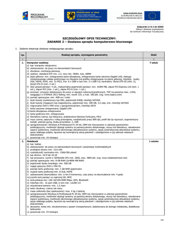 Załącznik nr 8.2 do SIWZ Zakup i dostawa wyposażenia do Centrum Informacji Turystycznej SZCZEGÓŁOWY OPIS TECHNICZNY: ZADANIE 2 – Dostawa sprzętu komputerowo-biurowego 1. Zadanie obejmuje dostawę następującego sprzętu: Lp. 1 Rodzaj sprzętu, wymagane parametry 2 Ilość 3 1. Komputer osobisty a) typ: komputer stacjonarny b) zastosowanie: do pracy na stanowiskach biurowych c) obudowa: orientacja pionowa, d) zasilacz: standard ATX min. 2.2, moc min. 450W, max. 600W e) płyta główna: min. zintegrowana karta dźwiękowa, zintegrowana karta sieciowa Gigabit LAN, obsługa zintegrowanego układu graficznego na chipsecie lub grafika zintegrowana na płycie głównej, interfejs: Audio, VGA, HDMI, RJ45, min. 1x PS/2, min. 6 x USB w tym min. 2 x USB 3.0, kontrolery: Serial ATA III (min. 2), Serial ATA II (min. 2 szt.) f) ilość gniazd pamięci: 4 szt., maksymalna pojemność pamięci: min. 16384 MB, złącze PCI-Express x16 (min. 1 szt.), złącze PCI (min. 1 szt.), złącze PCI-E (min. 1 szt.) g) procesor: procesor dedykowany do pracy w stacjach roboczych/graficznych, TDP na poziomie max. 125W, osiągający w SYSMark 2012 Rating, min. wynik 125, a max. 180 pkt. (wg. www.bapco.com) h) pamięć operacyjna: min. 4GB na 1 kości i) dysk twardy (systemowy) typ SSD, pojemność 64GB, interfejs SATAIII j) dysk twardy (magazyn) typ magnetyczny, pojemność min. 500 GB, 3,5 cala, min. Interfejs SATAIII k) nagrywarka DVD+/-RW wraz z oprogramowaniem, Interfejs SATA l) karta sieciowa zintegrowana, Gigabit LAN m) karta dźwiękowa zintegrowana n) karta graficzna min. zintegrowana o) klawiatura czarna, typ klasyczny, podstawowe klawisze funkcyjne, PS/2 p) mysz czarna, optyczna z rolką przewijania, rozdzielczość pracy 800 dpi, profil dla l/p ręcznych, ergonomiczny kształt, pokryta gumą, liczba przycisków: 3, USB q) oprogramowanie: Windows 8 Professional PL 64 bit, OEM lub równoważne w zakresie parametrów: polskojęzyczny, możliwość obsługi systemy za pomocą ekranu dotykowego, myszy lub klawiatury, wbudowana zapora systemowa, możliwość darmowego aktualizowania systemu, opcja automatycznej aktualizacji systemu, opcja zdalnego pulpitu, łączenia się wewnętrzną siecią placówki i udostępniania w jej zakresie własnych dokumentów r) gwarancja min. 24 miesiące 7 sztuk 2. Notebook a) typ: laptop b) zastosowanie: do pracy na stanowiskach biurowych i prezentacji multimedialnych c) przekątna ekranu min. 15,6 LED d) rozdzielczość nominalna min. 1366x768 pikseli e) typ ekranu: 16:9 lub 16:10 f) typ procesora: wynik w 3DMark06 CPU min. 3000, max. 3800 pkt. (wg. www.notebookcheck.net) g) pamięć operacyjna: min. 8 GB RAM (2x4096 MB RAM) h) pojemność dysku twardego: min. 500 GB i) napęd optyczny DVD+/-RW DL j) pamięć karty graficznej: min. 1 GB RAM pojemności k) wyjście karty graficznej min. D-Sub, HDMI l) zastosowanie akumulatora: min. Li-lon 6 komorowy, czas pracy na akumulatorze min. 4 godz. m) czytnik kart pamięci co najmniej SD, MMC n) komunikacja min. LAN 10/100/1000 Mbps, WiFi, Bluetooth o) Interfejs min. 3x port USB, w tym min. 1xUSB 3.0 p) wbudowana kamera: min. 1,3 mpix q) kolor obudowy: czarny lub szary r) masa całkowita (bez opakowania): max. 4 kg z baterią s) oprogramowanie Windows 8 Professional PL 64 bit, OEM lub równoważne w zakresie parametrów: polskojęzyczny, możliwość obsługi systemu za pomocą ekranu dotykowego, myszy lub klawiatury, wbudowana zapora systemowa, możliwość darmowego aktualizowania systemu, opcja automatycznej aktualizacji systemu, opcja zdalnego pulpitu, łączenia się wewnętrzną siecią placówki i udostępniania w jej zakresie własnych dokumentów t) akcesoria: torba min. dwukomorowa z pasem transportowym, dedykowana do danego notebooka, dodatkowa ładowarka u) gwarancja min. 24 miesiące 1 sztuka 1/6 3. Monitor a) zastosowanie: do pracy na stanowiskach biurowych b) przekątna: min. 21.5 cala c) rozdzielczość nominalna: min. 1920 x 1080 pikseli d) rodzaj wyświetlania: LED e) kontrast statyczny min. 1000:1, dynamiczny min. 5000000:1 f) jasność: min. 250cd/m² g) wielkość plamki: max. 0,282 mm h) kąt widzenia pionowego: min. 160° i) kąt widzenia poziomego: min. 170° j) regulacja kąta pochylenia k) ilość wyświetlanych kolorów: min. 16,7 mln l) znalogowe złącze D-Sub 15-pin m) cyfrowe złącze HDMI n) regulacja cyfrowa (OSD) o) kolor obudowy: czarny lub szary p) waga (z podstawą, bez opakowania): max. 4 kg q) załączone wyposażenie: przewód zasilający, przewód do złącza D-Sub i HDMI r) gwarancja min. 24 miesiące 7 sztuk 4. Oprogramowanie antywirusowe ESET EndPoint Smart Security Client lub równoważne następującymi parametrami: 8 sztuk a) zastosowanie: do pracy na stanowiskach biurowych b) docelowo do instalacji na sprzęcie przetargowym c) cechy produktu: antyspyware, firewall (zapora osobista), antyspam, system zapobiegania włamaniom HIPS, kontrola treści, kontrola urządzeń peryferyjnych, skuteczny silnik skanujący, kontrola treści, zaawansowana kontrola urządzeń, system zapobiegania włamaniom (HIPS), instalacja modułowa, przywracanie wcześniejszej wersji bazy sygnatur wirusów lub modułów programu, skanowanie komunikacji szyfrowanej, ochrona wielu systemów d) czas trwania licencji: 36 m-cy 5. Oprogramowanie biurowe Microsoft Office 2013 PL dla Użytkowników Domowych i Małych Firm lub równoważne następującymi parametrami: a) zastosowanie: do pracy na stanowiskach biurowych b) docelowo do instalacji na sprzęcie przetargowym c) aplikacje: edytor tekstu, arkusz kalkulacyjny, narzędzie do przygotowywania i prowadzenia prezentacji d) cechy interfejsu użytkownika: pełna polska wersja językowa z możliwością przełączania na język angielski, komunikaty i pomoc techniczna w języku polskim e) ogólne cechy produktu: prawidłowe odczytywanie i zapisywanie danych w dokumentach w formatach: DOC, DOCX, XLS, XLSX, PPT, PPTX, w tym obsługa formatowania, makr, formuł, formularzy 