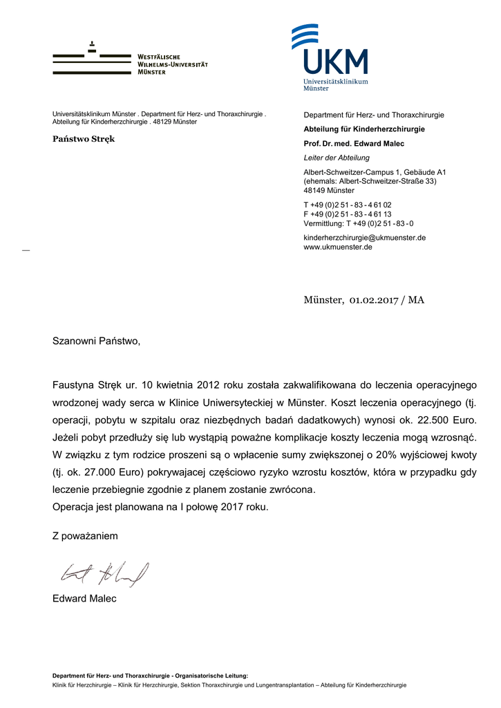 Universitätsklinikum Münster . Department für Herz- und Thoraxchirurgie . Abteilung für Kinderherzchirurgie . 48129 Münster Department für Herz- und Thoraxchirurgie Abteilung für Kinderherzchirurgie Państwo Stręk Prof. Dr. med. Edward Malec Leiter der Abteilung Albert-Schweitzer-Campus 1, Gebäude A1 (ehemals: Albert-Schweitzer-Straße 33) 48149 Münster T +49 (0)2 51 - 83 - 4 61 02 F +49 (0)2 51 - 83 - 4 61 13 Vermittlung: T +49 (0)2 51 - 83 - 0 [email protected] www.ukmuenster.de Münster, 01.02.2017 / MA Szanowni Państwo, Faustyna Stręk ur. 10 kwietnia 2012 roku została zakwalifikowana do leczenia operacyjnego wrodzonej wady serca w Klinice Uniwersyteckiej w Münster. Koszt leczenia operacyjnego (tj. operacji, pobytu w szpitalu oraz niezbędnych badań dadatkowych) wynosi ok. 22.500 Euro. Jeżeli pobyt przedłuży się lub wystąpią poważne komplikacje koszty leczenia mogą wzrosnąć. W związku z tym rodzice proszeni są o wpłacenie sumy zwiększonej o 20% wyjściowej kwoty (tj. ok. 27.000 Euro) pokrywajacej częściowo ryzyko wzrostu kosztów, która w przypadku gdy leczenie przebiegnie zgodnie z planem zostanie zwrócona. Operacja jest planowana na I połowę 2017 roku. Z poważaniem Edward Malec Department für Herz- und Thoraxchirurgie - Organisatorische Leitung: Klinik für Herzchirurgie – Klinik für Herzchirurgie, Sektion Thoraxchirurgie und Lungentransplantation – Abteilung für Kinderherzchirurgie