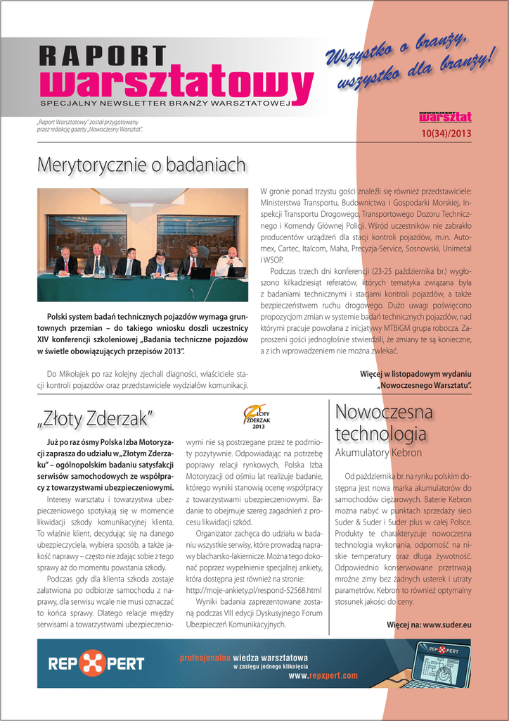 ży, n a r b o Wszystko dla branży! wszystko „Raport Warsztatowy” został przygotowany przez redakcję gazety „Nowoczesny Warsztat”. 10(34)/2013 Merytorycznie o badaniach Polski system badań technicznych pojazdów wymaga gruntownych przemian – do takiego wniosku doszli uczestnicy XIV konferencji szkoleniowej „Badania techniczne pojazdów w świetle obowiązujących przepisów 2013”. W gronie ponad trzystu gości znaleźli się również przedstawiciele: Ministerstwa Transportu, Budownictwa i Gospodarki Morskiej, Inspekcji Transportu Drogowego, Transportowego Dozoru Technicznego i Komendy Głównej Policji. Wśród uczestników nie zabrakło producentów urządzeń dla stacji kontroli pojazdów, m.in. Automex, Cartec, Italcom, Maha, Precyzja-Service, Sosnowski, Unimetal i WSOP. Podczas trzech dni konferencji (23-25 października br.) wygłoszono kilkadziesiąt referatów, których tematyka związana była z badaniami technicznymi i stacjami kontroli pojazdów, a także bezpieczeństwem ruchu drogowego. Dużo uwagi poświęcono propozycjom zmian w systemie badań technicznych pojazdów, nad którymi pracuje powołana z inicjatywy MTBiGM grupa robocza. Zaproszeni gości jednogłośnie stwierdzili, że zmiany te są konieczne, a z ich wprowadzeniem nie można zwlekać. Do Mikołajek po raz kolejny zjechali diagności, właściciele stacji kontroli pojazdów oraz przedstawiciele wydziałów komunikacji. Więcej w listopadowym wydaniu „Nowoczesnego Warsztatu”. „Złoty Zderzak” Już po raz ósmy Polska Izba Motoryzacji zaprasza do udziału w „Złotym Zderzaku” – ogólnopolskim badaniu satysfakcji serwisów samochodowych ze współpracy z towarzystwami ubezpieczeniowymi. Interesy warsztatu i towarzystwa ubezpieczeniowego spotykają się w momencie likwidacji szkody komunikacyjnej klienta. To właśnie klient, decydując się na danego ubezpieczyciela, wybiera sposób, a także jakość naprawy – często nie zdając sobie z tego sprawy aż do momentu powstania szkody. Podczas gdy dla klienta szkoda zostaje załatwiona po odbiorze samochodu z naprawy, dla serwisu wcale nie musi oznaczać to końca sprawy. Dlatego relacje między serwisami a towarzystwami ubezpieczenio- wymi nie są postrzegane przez te podmioty pozytywnie. Odpowiadając na potrzebę poprawy relacji rynkowych, Polska Izba Motoryzacji od ośmiu lat realizuje badanie, którego wyniki stanowią ocenę współpracy z towarzystwami ubezpieczeniowymi. Badanie to obejmuje szereg zagadnień z procesu likwidacji szkód. Organizator zachęca do udziału w badaniu wszystkie serwisy, które prowadzą naprawy blacharsko-lakiernicze. Można tego dokonać poprzez wypełnienie specjalnej ankiety, która dostępna jest również na stronie: http://moje-ankiety.pl/respond-52568.html Wyniki badania zaprezentowane zostaną podczas VIII edycji Dyskusyjnego Forum Ubezpieczeń Komunikacyjnych. Nowoczesna technologia Akumulatory Kebron Od października br. na rynku polskim dostępna jest nowa marka akumulatorów do samochodów ciężarowych. Baterie Kebron można nabyć w punktach sprzedaży sieci Suder & Suder i Suder plus w całej Polsce. Produkty te charakteryzuje nowoczesna technologia wykonania, odporność na niskie temperatury oraz długa żywotność. Odpowiednio konserwowane przetrwają mroźne zimy bez żadnych usterek i utraty parametrów. Kebron to również optymalny stosunek jakości do ceny. Więcej na: www.suder.eu Niedomagania rozrusznika motocyklowego Rozruszniki motocyklowe różnią się od samochodowych dużo mniejszymi wymiarami. Niektóre mają wbudowaną przekładnię planetarną. Małe wymiary rozruszników motocyklowych sprawiają, że małe są nie tylko wymiary obudowy, ale także małe są przekroje przewodów w uzwojeniach, małe są średnice łożysk i wymiary szczotek. Utrudnione jest także odprowadzenie ciepła. Wszystko to sprawia, że rozruszniki te działają nieco inaczej niż samochodowe. Oczywiście tak samo jak w samochodach rozrusznik napędza wał korbowy silnika, ale zwykle nie za pośrednictwem jednej, lecz kilku przekładni o bardzo dużych przełożeniach. Tylko w nielicznych motocyklach, takich jak dwuzaworowe BMW serii „R”, montowane są dość duże rozruszniki wyglądające i działające identycznie jak rozruszniki samochodowe. Pełna wersja artykułu dostępna w listopadowym wydaniu „NW” Rozmontowany rozrusznik motocykla Yamaha XV1000. Wpływ unijnej etykiety na decyzję o zakupie opon Etykieta na oponie jest dobrym punktem wyjścia, ale nie daje pełnego obrazu parametrów produktu – ostrzegają eksperci. Jak pokazują wyniki zleconego przez firmę Goodyear badania, ponad dwie trzecie konsumentów, którzy kupili opony w 2013 roku, brało pod uwagę informacje zaczerpnięte z unijnej etykiety. Aż 71% kupujących opony, którzy wiedzieli o etykiecie, przed dokonaniem wyboru wykorzystało zawarte w niej informacje. Dane pokazały również, że ponad połowa (54%) sprzedawców opon w Europie wykorzystuje etykietę jako przydatne narzędzie przy sprzedaży opon. Z badania wynika również, że system etykietowania opon ma coraz większy wpływ na decyzje zakupowe europejskich flot – nieco ponad połowa (54%) firm z tego segmentu stwierdziła, że etykieta wpływa na wybór opon, a dwie trzecie (66%) wskazało na efektywność paliwową jako najważniejszy parametr na etykiecie. W przypadku samochodów osobo- wych najważniejszym kryterium dla konsumentów jest przyczepność na mokrej nawierzchni – 52% respondentów wskazuje na ten parametr jako najważniejszy z trzech zawartych na etykiecie i branych pod uwagę przy podejmowaniu decyzji o zakupie opon. Efektywność paliwowa, która wynika z obniżonego oporu toczenia, była istotna dla 47% konsumentów, a poziom hałasu zewnętrznego – dla 41%. Wyniki badań zaprezentowano podczas debaty w Brukseli. Wydarzenie to zgromadziło najważniejszych interesariuszy i ekspertów branżowych, którzy omówili rozw