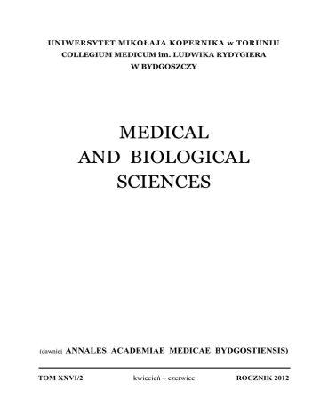 UNIWERSYTET MIKOŁAJA KOPERNIKA w TORUNIU COLLEGIUM MEDICUM im. LUDWIKA RYDYGIERA W BYDGOSZCZY MEDICAL AND BIOLOGICAL SCIENCES (dawniej ANNALES ACADEMIAE MEDICAE BYDGOSTIENSIS) TOM XXVI/2 kwiecień – czerwiec ROCZNIK 2012 REDAKTOR NACZELNY Editor-in-Chief Grażyna Odrowąż-Sypniewska ZASTĘPCA REDAKTORA NACZELNEGO Co-editor Jacek Manitius SEKRETARZ REDAKCJI Secretary Beata Augustyńska REDAKTORZY DZIAŁÓW Associate Editors Mieczysława Czerwionka-Szaflarska, Stanisław Betlejewski, Roman Junik, Józef Kałużny, Jacek Kubica, Wiesław Szymański KOMITET REDAKCYJNY Editorial Board Aleksander Araszkiewicz, Beata Augustyńska, Michał Caputa, Stanisław Dąbrowiecki, Gerard Drewa, Eugenia Gospodarek, Bronisław Grzegorzewski, Waldemar Halota, Olga Haus, Marek Jackowski, Henryk Kaźmierczak, Alicja Kędzia, Michał Komoszyński, Wiesław Kozak, Konrad Misiura, Ryszard Oliński, Danuta Rość, Karol Śliwka, Eugenia Tęgowska, Bogdana Wilczyńska, Zbigniew Wolski, Zdzisława Wrzosek, Mariusz Wysocki KOMITET DORADCZY Advisory Board Gerd Buntkowsky (Berlin, Germany), Giovanni Gambaro (Padova, Italy), Edward Johns (Cork, Ireland), Massimo Morandi (Chicago, USA), Vladimir Palička (Praha, Czech Republic) Adres redakcji Address of Editorial Office Redakcja Medical and Biological Sciences ul. Powstańców Wielkopolskich 44/22, 85-090 Bydgoszcz Polska – Poland e-mail: [email protected], [email protected] tel. (52) 585-3326 www.medical.cm.umk.pl Informacje w sprawie prenumeraty: tel. (52) 585-33 26 e-mail: [email protected], [email protected] ISSN 1734-591X UNIWERSYTET MIKOŁAJA KOPERNIKA W TORUNIU COLLEGIUM MEDICUM im. LUDWIKA RYDYGIERA BYDGOSZCZ 2012 Medical and Biological Sciences, 2012, 26/2 CONTENTS p. ORIGINAL ARTICLES Julia Feit, Edward Jacek Gorzelańczyk, Ewa Mrówczyńska, Ewelina N o w i ń s k a , K a t a r z y n a P a s g r e t a – Effect of a single dose of methadone on the functioning of visuo-spatial working memory in opiate dependent individuals with HIV(+) treated with methadone . . . . . . . . . . . . . . . . . . . . . . . . . . . . . . . . . . . . . . . . . . . . . . . . . . . . . . . . . . . . . . . 5 Elżbieta Grześk, Sylwia Kołtan, Grzegorz Grześk, Barbara Tejza, Robert Dębski, Andrzej Kołtan, Mariusz Wysocki, Aldona Katarzyna J a n k o w s k a , S ł a w o m i r M a n y s i a k , G r a ż y n a O d r o w ą ż - S y p n i e w s k a – Value of erythrocyte sedimentation rate, C-reactive protein and procalcitonin concentration versus multimarker strategy in management of bronchiolitis in pediatric emergency . . . . . . . . . . . . . . . . . . . . . 11 Magdalena Hagner-Derengowska, Michał Dylewski, Joanna Dawidziuk, W o j c i e c h H a g n e r – Changeability of spatial and temporal gait parameters measured on a treadmill with the use of a 3D ultrasound-based movement measuring system . . . . . . . . . . . . . . . . 19 Magdalena Hagner-Derengowska, Monika Dylewska, Michał Dylewski – Intrarater repeatability of manual testing of first muscle movement resistance . . . . . . . . . . . . . . . . . . 25 Bożenna Mazalska, Bożena Kiziewicz, Elżbieta Muszyńska, A n n a G o d l e w s k a , E w a Z d r o j k o w s k a – Fungi and straminipilous organisms found at bathing sites in the vicinity of Białystok . . . . . . . . . . . . . . . . . . . . . . . . . . . . . . . . . . . . . . . . . . . . . . . . 33 Katarzyna Strojek, Irena Bułatowicz, Agata Czechowska, Agnieszka Radzimińska, Urszula Kaźmierczak, Grzegorz Srokowski, Marcin S i e d l a c z e k – The assessment of influence of thermoplastic foot pads on the body stability in patients with foot dysfunctions – piloty study . . . . . . . . . . . . . . . . . . . . . . . . . . . . . . . . . . . . . . . . . . . 41 Beata Kuryło-Rafińska, Beata Kołodziej, Małgorzata Kubicka, Mariusz W y s o c k i , J a n S t y c z y ń s k i – Differential ex vivo drug resistance profile in first and subsequent relapsed childhood acute myeloid leukemia in comparison to initial diagnosis . . . . . . . . . . 47 A n e t a Z r e d a - P i k i e s , A n d r z e j K u r y l a k – Social functioning of children who have completed acute lymphoblastic leukemia treatment . . . . . . . . . . . . . . . . . . . . . . . . . . . . . . . . . . . . . . . . . 53 CASE REPORT Adrian Reśliński, Agnieszka Mikucka, Jakub Szmytkowski, Katarzyna Głowacka, Eugenia Gospodarek, Wojciech Szczęsny, Stanisław D ą b r o w i e c k i – Asymptomatic infection of a surgical mesh implant – a case report . . . . . . . . . . . . 59 Medical and Biological Sciences, 2012, 26/2 SPIS TREŚCI str. PRACE POGLĄDOWE Julia Feit, Edward Jacek Gorzelańczyk, Ewa Mrówczyńska, Ewelina N o w i ń s k a , K a t a r z y n a P a s g r e t a – Wpływ pojedynczej dawki metadonu na funkcjonowanie wzrokowo-przestrzennej pamięci operacyjnej osób HIV(+) uzależnionych od opioidów leczonych metadonem . . . . . . . . . . . . . . . . . . . . . . . . . . . . . . . . . . . . . . . . . . . . . . . . . . . . . . 5 Elżbieta Grześk, Sylwia Kołtan, Grzegorz Grześk, Barbara Tejza, Robert Dębski, Andrzej Kołtan, Mariusz Wysocki, Aldona Katarzyna Jankowska, Sławomir Manysiak, Grażyna Odrowąż-Sypniewska – Wartość diagnostyczna OB, CRP oraz stężenia prokalcytoniny w różnicowaniu infekcji bakteryjnych i wirusowych u dzieci z zapaleniem oskrzelików w pediatrycznej izbie przyjęć . . . . . . . . . . . . . . . . . . . 11 Magdalena Hagner-Derengowska, Michał Dylewski, Joanna Dawidziuk, W o j c i e c h H a g n e r – Zmienność przestrzennych i czasowych parametrów chodu mierzona na bieżni z użyciem systemu pomiaru ruchu 3-D USG . . . . . . . . . . . . . . . . . . . . . . . . . . . . . . . . . . . . . . 19 Magdalena Hagner-Derengowska, Monika Dylewska, Michał Dylewski – Powtarzalność intrarater manualnego badania oporu tkankowego dla mięśnia trójgłowego łydki . . . 25 Bożenna Mazalska, Bożena Kiziewicz, Elżbieta Muszyńska, A n n a G o d l e w s k