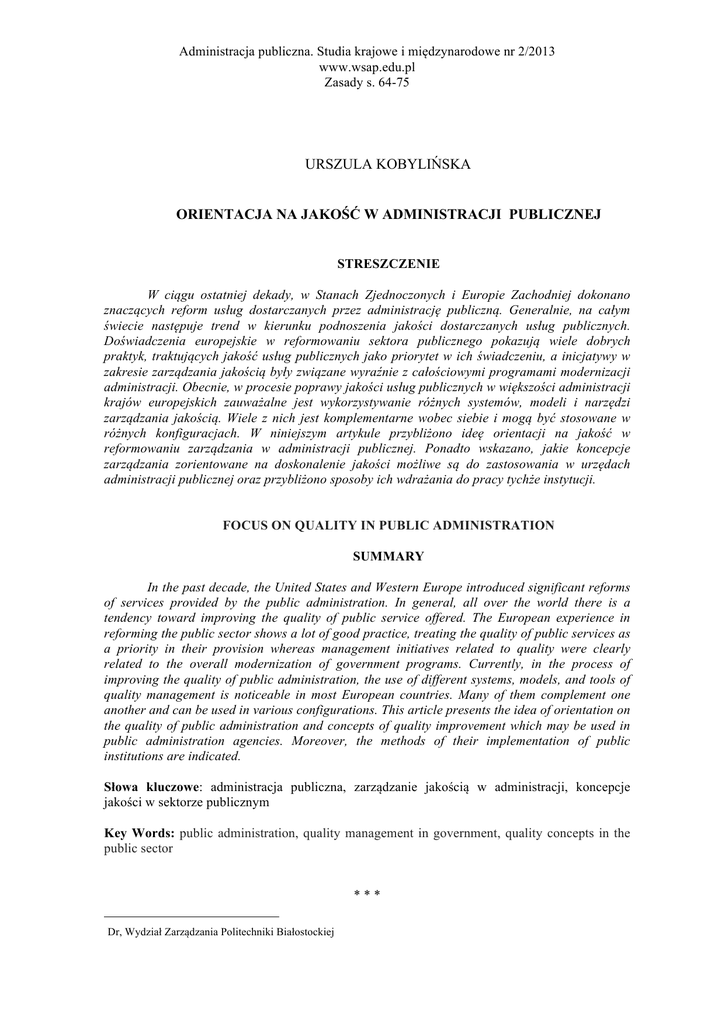 Administracja publiczna. Studia krajowe i międzynarodowe nr 2/2013 www.wsap.edu.pl Zasady s. 64-75 URSZULA KOBYLIŃSKA ORIENTACJA NA JAKOŚĆ W ADMINISTRACJI PUBLICZNEJ STRESZCZENIE W ciągu ostatniej dekady, w Stanach Zjednoczonych i Europie Zachodniej dokonano znaczących reform usług dostarczanych przez administrację publiczną. Generalnie, na całym świecie następuje trend w kierunku podnoszenia jakości dostarczanych usług publicznych. Doświadczenia europejskie w reformowaniu sektora publicznego pokazują wiele dobrych praktyk, traktujących jakość usług publicznych jako priorytet w ich świadczeniu, a inicjatywy w zakresie zarządzania jakością były związane wyraźnie z całościowymi programami modernizacji administracji. Obecnie, w procesie poprawy jakości usług publicznych w większości administracji krajów europejskich zauważalne jest wykorzystywanie różnych systemów, modeli i narzędzi zarządzania jakością. Wiele z nich jest komplementarne wobec siebie i mogą być stosowane w różnych konfiguracjach. W niniejszym artykule przybliżono ideę orientacji na jakość w reformowaniu zarządzania w administracji publicznej. Ponadto wskazano, jakie koncepcje zarządzania zorientowane na doskonalenie jakości możliwe są do zastosowania w urzędach administracji publicznej oraz przybliżono sposoby ich wdrażania do pracy tychże instytucji. FOCUS ON QUALITY IN PUBLIC ADMINISTRATION SUMMARY In the past decade, the United States and Western Europe introduced significant reforms of services provided by the public administration. In general, all over the world there is a tendency toward improving the quality of public service offered. The European experience in reforming the public sector shows a lot of good practice, treating the quality of public services as a priority in their provision whereas management initiatives related to quality were clearly related to the overall modernization of government programs. Currently, in the process of improving the quality of public administration, the use of different systems, models, and tools of quality management is noticeable in most European countries. Many of them complement one another and can be used in various configurations. This article presents the idea of orientation on the quality of public administration and concepts of quality improvement which may be used in public administration agencies. Moreover, the methods of their implementation of public institutions are indicated. Słowa kluczowe: administracja publiczna, zarządzanie jakością w administracji, koncepcje jakości w sektorze publicznym Key Words: public administration, quality management in government, quality concepts in the public sector *** Dr, Wydział Zarządzania Politechniki Białostockiej Administracja publiczna. Studia krajowe i międzynarodowe nr 2/2013 www.wsap.edu.pl Zasady s. 64-75 1. Wprowadzenie Pierwsze wzmianki o implementacji założeń zarządzania jakością do pracy urzędów administracji pojawiły się we wczesnych latach 90-tych XX wieku. Bazowały one na podstawach koncepcji sprawdzonych w praktyce przedsiębiorstw przemysłowych, ale stanowiły również ich pewną modyfikację. Odmienność kulturowych, społecznych i ekonomicznych uwarunkowań spowodowało zróżnicowanie popularności poszczególnych podejść do zarządzania jakością w administracji nie tylko pomiędzy kontynentami, ale także w ramach jednego kontynentu, np. Europy. Pomimo nasilających się procesów globalizacji i dążenia do ogólnoświatowej standaryzacji, można zauważyć różnice w popularności i sposobie implementacji różnych idei zorientowanych na poprawę jakości w organizacjach japońskich, amerykańskich czy zachodnioeuropejskich. Owe różnice, nawet w odmiennym sposobie definiowania jakości, mają jak najbardziej podłoże kulturowe. W Europie jakość najczęściej definiuje się jako charakterystykę techniczną, a w USA pojęcie jakości jest przybliżane poprzez wymagania klienta i oznacza stopień spełnienia oczekiwań. Zupełnie inne postrzeganie jakości można zaobserwować u Japończyków, dla których jakość jest kojarzona ze wszystkim co można poprawić. W administracji USA, Kanady i Japonii raczej dominuje koncepcja TQM, podczas gdy urzędy administracji większości krajów europejskich wdrażają znormalizowane systemy zarządzania jakością, zgodne z wymaganiami standardu ISO 9001 lub adoptują model doskonałości EFQM. Celem artykułu jest wykazanie, iż orientacja na jakość jest wiodącą wizją usprawniania zarządzania w jednostkach publicznych na świecie. Ponadto autorka przybliży, jakie systemy, metody i modele zarządzania jakością możliwe są do zastosowania w urzędach administracji publicznej oraz wskaże poziomy wdrażania koncepcji zorientowanych na jakość do instytucji publicznych. 2. Orientacja na jakość jako strategia działania w usługach publicznych Zasadniczym problemem organów administracji, zarówno na szczeblach krajowych, jak i lokalnych, jest zapewnienie sprawnej, skutecznej i efektywnej realizacji zadań publicznych. Rolą kierownictwa instytucji publicznych jest takie ukształtowanie ich struktury, aby jak najpełniej zaspokajać potrzeby obywateli oraz optymalizować wykorzystanie ograniczonych zasobów. Turbulentne otoczenie, w którym funkcjonują urzędy administracji, wymusza na nich działania doskonalące, dopasowujące ich funkcjonowanie do coraz wyższych wymagań społeczeństwa informacyjnego1. W ciągu ostatnich dwóch dekad można zauważyć powszechność reform w sektorze publicznym. Konieczność ich przeprowadzenia pojawiła się na przełomie lat 70 i 80 ubiegłego stulecia [Kettl, 2000, s. 1-4]. Czynniki sprawcze przemian opisywane były w licznych publikacjach [Pollit, Bouckaert, 2003, Nr 7; Hazlett, Hill, 2000, Nr 11; Farazmand 2005, Nr 5; Hartley 2005, Nr 1]. Najczęściej wskazywane przesłanki zmian spowodowane są m.in. globalizacją gospodarek