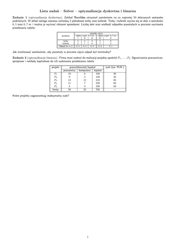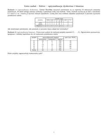 Lista zadań – Solver – optymalizacja dyskretna i binarna Zadanie 1 (optymalizacja dyskretna). Zakład Torebka otrzymał zamówienie na co najmniej 50 skórzanych zestawów podróżnych. W skład takiego zestawu wchodzą 2 jednakowe torby oraz kuferek. Torby i kuferek wycina się ze skór o szerokości 0, 5 oraz 0, 7 m. i można je wycinać różnymi sposobami. Liczbę skór oraz wielkość odpadów powstałych w procesie wycinania przedstawia tabela: produkty torba kuferek Odpad (w m.) sposoby skóra o szer. 0, 5 m. I II II 3 2 2 2 1 0 0, 3 0, 4 0, 2 cięcia skóra o szer. 0, 7 m. IV V 4 0 5 2 0, 2 0, 1 Jak zrealizować zamówienie, aby powstały w procesie cięcia odpad był minimalny? Zadanie 2 (optymalizacja binarna). Firma musi wybrać do realizacji projekty spośród P1 , . . . , P5 . Ograniczenia pracownicze, sprzętowe i nakłady kapitałowe do ich wykonania przedstawia tabela projekt P1 P2 P3 P4 P5 limity pracochłonność/kapitał pracownicy komputery kapitał 10 6 190 9 4 120 12 12 210 11 7 230 8 3 100 50 25 700 Które projekty zagwarantują maksymalny zysk? 1 zysk (tys. PLN ) 30 40 80 60 50 –