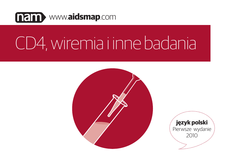 www.aidsmap.com CD4, wiremia i inne badania język polski Pierwsze wydanie 2010 Podziękowania Autor: Michael Carter Pierwsze polskie wydanie — 2010 Adaptowane z pierwszego brytyjskiego wydania — 2009 Podziękowania dla Sieci Plus za przetłumaczenie tej publikacji. Treść i projekt graficzny sfinansowany przez brytyjski NHS Pan-London HIV Prevention Programme oraz Brytyjski Departament Zdrowia Tłumaczenie sfinansowane przez Merck, Sharp and Dohme Aby obejrzeć tę broszurę w wersji PDF z większą czcionką, możesz odwiedzić naszą stronę internetową www.aidsmap.com Informacje zawarte w tej ulotce dotyczą rekomendowanych procedur leczenia i opieki osób żyjących z HIV w Europie. CD4, wiremia i inne badania Ta broszura zawiera informacje na temat badań, dzięki którym możesz monitorować swój stan zdrowia. Niektóre z badań wykonuje się, aby sprawdzić wpływ HIV na Twój organizm, inne zaś informują o ogólnym stanie zdrowia. Możliwe, że niektóre z tych badań będziesz wykonywać przy każdej wizycie kontrolnej u lekarza, podczas gdy pozostałe wykonuje się tylko w razie potrzeby. Informacje w tej broszurce nie zastąpią rozmowy z lekarzem o Twojej terapii antyretrowirusowej i innych kwestiach medycznych, jednak może Ci pomóc w skonstruowaniu pytań, które zechcesz zadać Twojemu lekarzowi. Treść Część pierwsza: Monitorowanie stanu zdrowia 1 Regularne kontrolowanie stanu zdrowia jest ważne 2 Rodzaje badań 3 Twoja pierwsza wizyta 4 Regularne wizyty kontrolne 6 Badanie cytologiczne szyjki macicy i odbytu 7 Część druga – Najczęstsze badania Badania krwi OOBadania krwi monitorujące zakażenie HIV – liczba komórek CD4 i wiremia Liczba komórek CD4 OOCo można stwierdzić na podstawie poziomu CD4 OOLiczba komórek CD4 wynosi 350 – czas zacząć leczenie ARV OOLiczba komórek CD4 wynosi 200 lub mniej – rozpoczęcie leczenia ARV oraz dodatkowych środków przeciwdziałających infekcjom OOTwoja liczba komórek CD4 w czasie leczenia ARV OOOdsetek komórek CD4 8 9 9 10 12 12 13 13 14 Wiremia OOTwoja wiremia, kiedy nie przyjmujesz leków antyretrowirusowych OOWiremia w czasie leczenia ARV OONiewykrywalna wiremia OODlaczego dobrze mieć niewykrywalną wiremię OOWykrywalna wiremia w czasie leczenia ARV OOTesty oporności OOBlipy wiremii OOWiremia a przenoszenie HIV drogą płciową OOWiremia a odmatczyne (wertykalne) zakażenia HIV Inne badania krwi OOBadanie biochemiczne krwi OOLipidy 14 15 16 16 17 17 18 18 19 19 20 21 22 Inne badania OOKości OOCukrzyca OOBadanie nerek OOBadanie wątroby OODalsze badania OOPróbki do analizy OORentgen, tomografia i USG OOInne procedury OOBronchoskopia OOKolonoskopia OOEndoskopia OOBiopsja 23 23 24 24 25 26 26 26 28 28 29 30 31 Podsumowanie 32 Słowniczek 34 Część pierwsza: Monitorowanie stanu zdrowia Regularne kontrolowanie stanu zdrowia jest ważne Regularne kontrolowanie stanu zdrowia jest ważne Nigdy perspektywy dla osób żyjących z HIV nie były tak dobre. Przy odpowiednim leczeniu i opiece medycznej, mają one szansę na długie i zdrowe życie. Aby upewnić się, że otrzymujesz najwłaściwsze leczenie i opiekę, powinieneś(aś) się poddawać regularnym badaniom. 2 Rodzaje badań Rodzaje badań Rentgen, tomografia, USG – w przypadku wystąpienia pewnych objawów może być potrzebne wykonanie takich badań, jak: zdjęcie rentgenowskie, tomografia komputerowa lub USG, które pozwolą lekarzowi obejrzeć Twoje narządy wewnętrzne. Istnieje kilka rodzajów badań, które możesz mieć zlecone. Najpowszechniejsze to: Badanie fizykalne – lekarz obejrzy Twoje ciało i zbada Cię pod kątem wszelkich nietypowych zmian czy objawów. Drobne zabiegi chirurgiczne – niekiedy może zaistnieć konieczność pobrania niewielkiej próbki tkanek do przebadania ich w laboratorium. Takie badanie to biopsja i na ogół wykonuje się je w znieczuleniu miejscowym. Badania krwi – pobiera się próbki krwi, w celu przebadania ich w laboratorium. Te badania wykonuje się w celu sprawdzenia, jak HIV wpływa na Twój organizm, czy terapia jest skuteczna oraz jaki jest Twój ogólny stan zdrowia. Często lekarz zleci Ci kilka różnych badań. Może Ci się wydawać, że potrzebna będzie do tego duża ilość krwi, ale tak naprawdę w jednej probówce znajduje się zaledwie pół łyżeczki krwi. 3 Twoja pierwsza wizyta Twoja pierwsza wizyta OOCzy u Ciebie lub w Twojej rodzinie występują pewne choroby, np.: choroby serca, cukrzyca, nadciśnienie, zaburzenia psychiczne i nowotwory. Twoja pierwsza wizyta u lekarza specjalizującego się w leczeniu HIV po zdiagnozowaniu zakażenia będzie się prawdopodobnie wiązała z wywiadem medycznym na temat Twojej historii przebytych przez Ciebie chorób, z badaniem fizykalnym i skierowaniem na badanie krwi. OOCzy przyjmujesz jakieś leki. Dotyczy to zarówno leków na receptę, jak i bez, środki ziołowe, homeopatyczne oraz narkotyki. OOCzy byłeś(aś) na coś szczepiony(a). Lekarz może Cię poprosić o podanie następujących informacji: OOCzy masz na coś alergię. OOCzy jesteś obecnie, lub byłeś(aś) w przeszłości, poważnie chory(a) na chorobę niezwiązaną z HIV. OOCzy palisz, stosujesz jakąś formę aktywności ruchowej oraz jak się odżywiasz. Pytania mogą również dotyczyć Twojego życia seksualnego, na przykład, czy masz stałego OOCzy wystąpiły u Ciebie jakiekolwiek objawy. 4 Twoja pierwsza wizyta partnera, ilu masz przypadkowych partnerów, jakiej płci są Twoi partnerzy, czy używasz prezerwatywy oraz czy chorowałeś(aś) na jakieś infekcje przenoszone drogą płciową. Te informacje ułatwią Twojemu lekarzowi w dostarczeniu Ci wskazówek, w jaki sposób możesz chronić swoje zdrowie I zdrowie innych ludzi. celu sprawdzenia, czy nie wyczuwa żadnych nietypowych zmian, a także wysłucha przez stetoskop Twój oddech i bicie serca. Lekarz może też zajrzeć do Twoich uszu, oczu, ust i gardła. Podczas pierwszej wizyty prawdopodobnie przejdzi