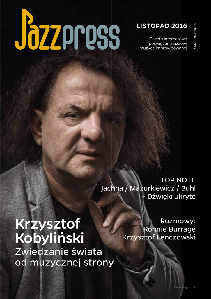 Gazeta internetowa poświęcona jazzowi i muzyce improwizowanej ISSN 2084-3143 LISTOPAD 2016 TOP NOTE Jachna / Mazurkiewicz / Buhl – Dźwięki ukryte Krzysztof Kobyliński Rozmowy: Ronnie Burrage Krzysztof Lenczowski Zwiedzanie świata od muzycznej strony fot. Kuba Majerczyk Od Redakcji redaktor naczelny Piotr Wickowski [email protected] „Jest tu miejsce na wycieczki w głąb tradycji, a także dalekie wyprawy w przyszłość. Jest muzyka folkowa, jest i klasyczna. Na jednej scenie spotykają się kultury z przeciwległych krańców świata”. O czym mowa? Taki jest jazz – według Cezarego Ścibiorskiego, który przybliża w tym numerze JazzPRESSu koto – instrument coraz częściej pojawiający się w zachodniej muzyce. Autor rubryki Wszystkie drogi prowadzą do Bitches Brew stawia przy okazji ważne pytania: o granice jazzu i czy w ogóle one istnieją. Z pewnością nie brakuje takich, dla których jazz mieści się w mniej lub bardziej określonych terytoriach. Dla nich każdy muzyk, który obszary graniczne przekracza, zapuszczając się dużo dalej, powinien ponieść przykładną karę. Tylko czy taka postawa nie przynosi gatunkowi więcej szkód niż korzyści? „Wprowadzenie do jazzu tak egzotycznego instrumentu – a koto zdecydowanie się do nich zalicza – sprawia, że jazz na tym korzysta. Tak jak i my wszyscy korzystamy w zetknięciu się z innymi, nawet bardzo odmiennymi, kulturami” – argumentuje Cezary Ścibiorski. Korzystajmy zatem i bądźmy „bezgranicznie jazzowi” – w myśl hasła, które codziennie można usłyszeć w audycjach RadioJAZZ.FM. Może jedyną granicą, przy której warto się zatrzymywać, jest tylko granica między muzyką dobrą i złą? Dobrą tak opisuje w listopadowej odsłonie rubryki Take 5 pianista i filozof muzyki Piotr Orzechowski: „Nie może być w niej miejsca na fałsz, na kopiowanie czyjegoś zamysłu, na podciąganie porażek do miana zamysłu artystycznego czy na zatracanie się. Wszystkie niedoskonałości lub też doskonałości nie mogą w takiej muzyce stanowić punktu docelowego, a najwyżej środek do jego osiągnięcia”. Miłej lektury! 4| SPIS TREŚCI 3 – Od Redakcji 4 – Spis treści 6 – Porterety improwizowane 7 – Take5, czyli 5 pytań do Piotra Orzechowskiego 9 – Wydarzenia Bob Dylan promuje Nobla, choć wcale tego nie chciał… 16 – Płyty 16 Pod naszym patronatem 20 Top Note Jachna / Mazurkiewicz / Buhl – Dźwięki ukryte 24Recenzje Łukasz Borowicki Quartet – Wandering Flecks The Forest Tuner – Tunes Marek Walarowski Trio, Wojciech Lichtański – Colours Of The Night Orange Trane, Soweto Kinch – Interpersonal Lines Katarzyna Borek – Space In Between Świętoński i Łuka – ChopinIN Damięcka, Bertazzo-Hart, Urowski, Allen – Monk’s Midnight The Bad Plus – It’s Hard Madeleine Peyroux – Secular Hymns Wadada Leo Smith – America’s National Parks Jukka Perko Avara – Invisible Man David Helbock Trio - Into the Mystic Michel Benita Ethics – River Silver Giovanni Guidi, Gianluca Petrella, Louis Sclavis, Gerald Cleaver – Ida Lupino Emile Parisien Quintet – Sfumato Mount Meander – Mount Meander Don Cherry, John Tchicai, Irène Schweizer, Léon Francioli, Pierre Favre – Musical Monsters Michael Wollny & Vincent Peirani – Tandem 59 – Koncerty 59 Przewodnik koncertowy 64 Morza szum, ptaków śpiew i… różnorodny bardzo jazz 68 73 75 77 80 84 Dżamborka A.D. 2016 – subiektywny przegląd Wielki Zderzacz Hadronów (Nie)przypadkowe spotkania Dwie strony wirtuozerii Jedna scena, kilka jazzowych pokoleń Jesienne niespodzianki 89 – Rozmowy 89 Krzysztof Kobyliński Zwiedzanie świata od muzycznej strony 99 Ronnie Burrage Nie jestem metronomem 108 Krzysztof Lenczowski Cały ten jazz! MEET! 118 – Słowo na jazzowo 118 Moja osobista szafa grająca Ciemna strona człowieka, czyli włóczęgi nocy 120 Złota Era Van Geldera Stanley Turrentine – A Bluish Bag Stanley Turrentine – The Return Of The Prodigal Son 123 Wszystkie drogi prowadzą do Bitches Brew Kęs egzotyki – koto 126 Kanon Jazzu Buckshot LeFonque – Buckshot LeFonque 128 My Favorite Things (or quite the opposite…) Listopad 130 – Pogranicze 130 Down the Backstreets Slum Village – Fantastic, vol. 2 132 Program zrekompensował wady 137 –Redakcja F L P a w w w.jazzpress.pl Po r ter e ty i m p r o w i z o wa n e rys. Jarosław Czaja 6| fot. Adam Golec JazzPRESS, listopad 2016 5 pytań do Piotra Orzechowskiego Profesjonalizm to wiara w swój przekaz Piotr Wickowski: Nad czym obecnie najintensywniej pracujesz? Piotr „Pianohooligan” Orzechowski: Nad moim nowym solowym albumem, który będzie niejako podsumowaniem tego, co do tej pory udało mi się osiągnąć w improwizacji fortepianowej, a zarazem wielkim otwarciem na przyszłe artystyczne kroki. Będzie to cykl 24 preludiów i improwizacji, opowiadających na różne sposoby o tym, co w jazzie wydaje mi się najważniejsze, a więc o szczerym wyborze, o odpowiedzialności w wolności, a także o tym wszystkim, co leży pomiędzy pojęciem spontaniczności a dojrzałości. Przygotowuję też nowy program Dziady, który zrealizujemy wspólnie z High Definition Quartet, Williamem Basinskim, Fenneszem, Robertem Richem i Krzysztofem Knittlem już 15 listopada w ICE Kraków. Kiedy zacząłeś uważać się za profesjonalnego muzyka? Tego profesjonalizmu długo się szuka – wypatruje się go gdzieś na zewnątrz, na przykład w tym jakiego sprzętu używasz, jak traktują cię inni lub, ile aktualnie zarabiasz. Tymczasem dla mnie prawdziwy profesjonalizm to wiara w swój przekaz, umocowana na własnym merytorycznym przygotowaniu i wewnętrznej gwarancji autentyczności swoich artystycznych posunięć. Gdy muzyk to ma, wtedy można zacząć mówić o profesjonalizmie. Kogoś takiego można bez problemu zapraszać wszędzie, może nawet grać na byle czym, wyglądać byle jak i nikomu to nie powinno przeszkadzać, bo to już jest muzyk zawodowy. J