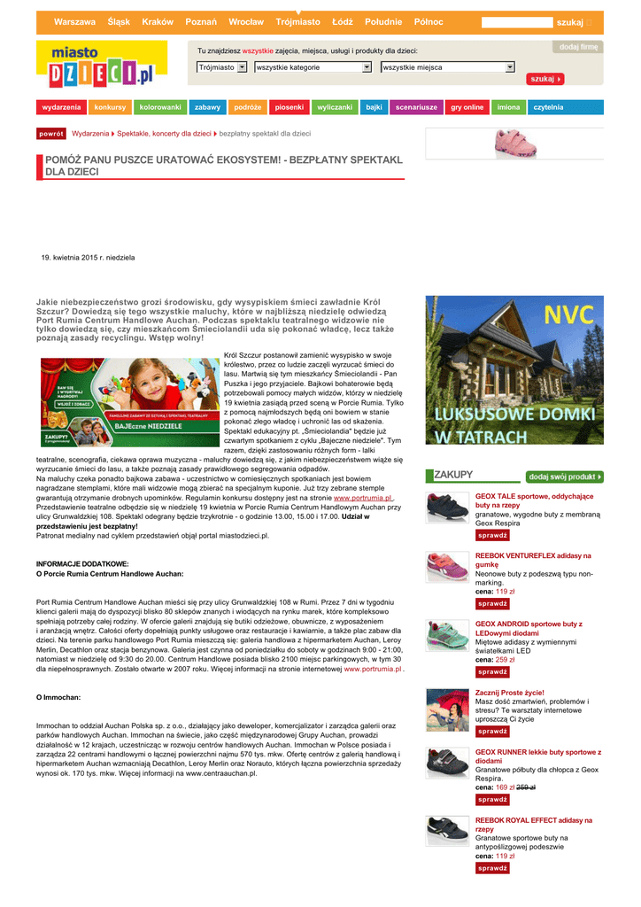 Warszawa Śląsk Kraków Poznań Wrocław Trójmiasto Łódź Południe Północ szukaj Tu znajdziesz wszystkie zajęcia, miejsca, usługi i produkty dla dzieci: Trójmiasto wydarzenia powrót konkursy kolorowanki zabawy wszystkie kategorie podróże piosenki wyliczanki wszystkie miejsca bajki scenariusze gry online imiona czytelnia Wydarzenia Spektakle, koncerty dla dzieci bezpłatny spektakl dla dzieci POMÓŻ PANU PUSZCE URATOWAĆ EKOSYSTEM! - BEZPŁATNY SPEKTAKL DLA DZIECI 19. kwietnia 2015 r. niedziela Jakie niebezpieczeństwo grozi środowisku, gdy wysypiskiem śmieci zawładnie Król Szczur? Dowiedzą się tego wszystkie maluchy, które w najbliższą niedzielę odwiedzą Port Rumia Centrum Handlowe Auchan. Podczas spektaklu teatralnego widzowie nie tylko dowiedzą się, czy mieszkańcom Śmieciolandii uda się pokonać władcę, lecz także poznają zasady recyclingu. Wstęp wolny! Król Szczur postanowił zamienić wysypisko w swoje królestwo, przez co ludzie zaczęli wyrzucać śmieci do lasu. Martwią się tym mieszkańcy Śmieciolandii - Pan Puszka i jego przyjaciele. Bajkowi bohaterowie będą potrzebowali pomocy małych widzów, którzy w niedzielę 19 kwietnia zasiądą przed sceną w Porcie Rumia. Tylko z pomocą najmłodszych będą oni bowiem w stanie pokonać złego władcę i uchronić las od skażenia. Spektakl edukacyjny pt. „Śmieciolandia" będzie już czwartym spotkaniem z cyklu „Bajeczne niedziele". Tym razem, dzięki zastosowaniu różnych form - lalki teatralne, scenografia, ciekawa oprawa muzyczna - maluchy dowiedzą się, z jakim niebezpieczeństwem wiąże się wyrzucanie śmieci do lasu, a także poznają zasady prawidłowego segregowania odpadów. Na maluchy czeka ponadto bajkowa zabawa - uczestnictwo w comiesięcznych spotkaniach jest bowiem nagradzane stemplami, które mali widzowie mogą zbierać na specjalnym kuponie. Już trzy zebrane stemple gwarantują otrzymanie drobnych upominków. Regulamin konkursu dostępny jest na stronie www.portrumia.pl . Przedstawienie teatralne odbędzie się w niedzielę 19 kwietnia w Porcie Rumia Centrum Handlowym Auchan przy ulicy Grunwaldzkiej 108. Spektakl odegrany będzie trzykrotnie - o godzinie 13.00, 15.00 i 17.00. Udział w przedstawieniu jest bezpłatny! Patronat medialny nad cyklem przedstawień objął portal miastodzieci.pl. INFORMACJE DODATKOWE: O Porcie Rumia Centrum Handlowe Auchan: Port Rumia Centrum Handlowe Auchan mieści się przy ulicy Grunwaldzkiej 108 w Rumi. Przez 7 dni w tygodniu klienci galerii mają do dyspozycji blisko 80 sklepów znanych i wiodących na rynku marek, które kompleksowo spełniają potrzeby całej rodziny. W ofercie galerii znajdują się butiki odzieżowe, obuwnicze, z wyposażeniem i aranżacją wnętrz. Całości oferty dopełniają punkty usługowe oraz restauracje i kawiarnie, a także plac zabaw dla dzieci. Na terenie parku handlowego Port Rumia mieszczą się: galeria handlowa z hipermarketem Auchan, Leroy Merlin, Decathlon oraz stacja benzynowa. Galeria jest czynna od poniedziałku do soboty w godzinach 9:00 - 21:00, natomiast w niedzielę od 9:30 do 20.00. Centrum Handlowe posiada blisko 2100 miejsc parkingowych, w tym 30 dla niepełnosprawnych. Zostało otwarte w 2007 roku. Więcej informacji na stronie internetowej www.portrumia.pl . O Immochan: Immochan to oddział Auchan Polska sp. z o.o., działający jako deweloper, komercjalizator i zarządca galerii oraz parków handlowych Auchan. Immochan na świecie, jako część międzynarodowej Grupy Auchan, prowadzi działalność w 12 krajach, uczestnicząc w rozwoju centrów handlowych Auchan. Immochan w Polsce posiada i zarządza 22 centrami handlowymi o łącznej powierzchni najmu 570 tys. mkw. Ofertę centrów z galerią handlową i hipermarketem Auchan wzmacniają Decathlon, Leroy Merlin oraz Norauto, których łączna powierzchnia sprzedaży wynosi ok. 170 tys. mkw. Więcej informacji na www.centraauchan.pl. ZAKUPY GEOX TALE sportowe, oddychające buty na rzepy granatowe, wygodne buty z membraną Geox Respira sprawdź REEBOK VENTUREFLEX adidasy na gumkę Neonowe buty z podeszwą typu nonmarking. cena: 119 zł sprawdź GEOX ANDROID sportowe buty z LEDowymi diodami Miętowe adidasy z wymiennymi światełkami LED cena: 259 zł sprawdź Zacznij Proste życie! Masz dość zmartwień, problemów i stresu? Te warsztaty internetowe uproszczą Ci życie sprawdź GEOX RUNNER lekkie buty sportowe z diodami Granatowe półbuty dla chłopca z Geox Respira. cena: 169 zł 259 zł sprawdź REEBOK ROYAL EFFECT adidasy na rzepy Granatowe sportowe buty na antypoślizgowej podeszwie cena: 119 zł sprawdź REKLAMA ZOSTAW KOMENTARZ Przeładuj Twoje imię lub nick Przepisz kod z obrazka Twój komentarz Wyślij komentarz KOMENTARZE Brak komentarzy W każdy czwartek wysyłamy najświeższe wiadomości o imprezach dla dzieci, pomysłach na zabawy i konkursach z atrakcyjnymi nagrodami. Wśród czytelników losujemy bezpłatne zaproszenia! Zapisz się - to nic nie kosztuje! zobacz, jak wygląda newsletter ZABAWY DLA DZIECI wybierz region: Trójmiasto wpisz email: akceptuję politykę prywatności zapisz się na newsletter DZIŚ POLECAMY Króliczek - nie tylko wielkanocny NA KAŻDĄ OKAZJĘ... Świnka Skarbonka. Recykling wybierz kategorię wybierz typ wybierz wiek Wiosenny Kotek Wiosenny Kotek wybierz materiał Wiosenne Ciasteczka Biedroneczki Są W Kropeczki więcej KALENDARZ WYDARZEŃ kwiecień dzisiaj Pn Wt śr Cz Pt So 1 2 3 4 5 6 7 8 9 10 11 12 13 14 15 16 17 18 19 20 21 22 23 24 25 26 27 28 29 30 NASI EKSPERCI Wojciech Eichelberger Psycholog, psychoterapeuta, współtwórca Instytutu Psychoimmunologii Aneta Strelau Dietetyk kliniczny z wieloletnim doświadczeniem zadaj pytanie Reklama Nd Zareklamuj się w tym miejscu - prosto i skutecznie! WYDARZENIA NA WEEKEND • Teatralny piątek w Projektorni GAK • Bajkowe Spotkania • Od slimaka do spirali • Sowoty - pomysł na weekend • Sobota w muzeum • Warsztaty Rodzinne - Niezwyk