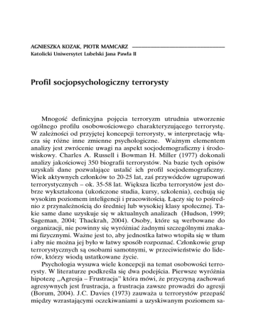 AGNIESZKA KOZAK, PIOTR MAMCARZ Katolicki Uniwersytet Lubelski Jana Paw³a II Profil socjopsychologiczny terrorysty MnogosÂc definicyjna pojeÎcia terroryzm utrudnia utworzenie ogoÂlnego profilu osobowosÂciowego charakteryzujaÎcego terrorysteÎ. W zalezÇnosÂci od przyjeÎtej koncepcji terrorysty, w interpretacjeÎ wøaÎcza sieÎ roÂzÇne inne zmienne psychologiczne. WazÇnym elementem analizy jest zwroÂcenie uwagi na aspekt socjodemograficzny i sÂrodowiskowy. Charles A. Russell i Bowman H. Miller (1977) dokonali analizy jakosÂciowej 350 biografii terrorystoÂw. Na bazie tych opisoÂw uzyskali dane pozwalajaÎce ustalic ich profil socjodemograficzny. Wiek aktywnych czøonkoÂw to 20-25 lat, zas przywoÂdcoÂw ugrupowan terrorystycznych ± ok. 35-58 lat. WieÎksza liczba terrorystoÂw jest dobrze wyksztaøcona (ukonÂczone studia, kursy, szkolenia), cechujaÎ sieÎ wysokim poziomem inteligencji i pracowitosÂciaÎ. èaÎczy sieÎ to posÂrednio z przynalezÇnosÂciaÎ do sÂredniej lub wysokiej klasy spoøecznej. Takie same dane uzyskuje sieÎ w aktualnych analizach (Hudson, 1999; Sageman, 2004; Thackrah, 2004). Osoby, ktoÂre saÎ werbowane do organizacji, nie powinny sieÎ wyroÂzÇniac zÇadnymi szczegoÂlnymi znakami fizycznymi. WazÇne jest to, aby jednostka øatwo wtopiøa sieÎ w tøum i aby nie mozÇna jej byøo w øatwy sposoÂb rozpoznacÂ. Czøonkowie grup terrorystycznych saÎ osobami samotnymi, w przeciwienÂstwie do lideroÂw, ktoÂrzy wiodaÎ ustatkowane zÇycie. Psychologia wysuwa wiele koncepcji na temat osobowosÂci terrorysty. W literaturze podkresÂla sieÎ dwa podejsÂcia. Pierwsze wyroÂzÇnia hipotezeÎ ¹Agresja ± Frustracjaº ktoÂra moÂwi, zÇe przyczynaÎ zachowan agresywnych jest frustracja, a frustracja zawsze prowadzi do agresji (Borum, 2004). J.C. Davies (1973) zauwazÇa u terrorystoÂw przepasÂc mieÎdzy wzrastajaÎcymi oczekiwaniami a uzyskiwanym poziomem sa- 260 Agnieszka Kozak, Piotr Mamcarz tysfakcji. Zas J. Margolin (1977) twierdzi, zÇe wieÎkszosÂc zachowan terrorystoÂw jest reakcjaÎ na frustracjeÎ zwiaÎzanaÎ z niezaspokojonymi potrzebami politycznymi, ekonomicznymi lub osobistymi. Drugie ujeÎcie koncentruje sieÎ na hipotezie ¹Narcystycznego gniewuº. JezÇeli pierwotny narcyzm w formie ¹wielkiego jaº nie zostanie zneutralizowany przez kontakt z rzeczywistosÂciaÎ, tworzy sieÎ osobowosÂc socjopatyczna (arogancka, nieliczaÎca sieÎ z innymi). To ¹wyidealizowane egoº mozÇe doprowadzic do powstania bezradnosÂci, ktoÂra przeksztaøcajaÎc sieÎ w nieopanowany gniew, daÎzÇy do zniszczenia zÂroÂdøa narcystycznego urazu (Crayton 1983; Post, 1990; Pearlstein, 1991). Sullwold (1981) przypisuje terrorysÂcie ekstrawertyzm, czyli niestabilnosÂcÂ, brak zahamowanÂ, nieliczenie sieÎ z innymi, szukanie wrazÇenÂ. Ponadto zwraca uwageÎ na neurotycznosÂcÂ, ktoÂra przybiera postac negatywnego nastawienia do sÂwiata, braku tolerancji na krytykeÎ, podejrzliwosÂcÂ, agresjeÎ i zajmowanie pozycji obronnej w stosunku do ludzi. Franco Ferracuti dokonaø analizy pochwyconych terrorystoÂw. Efektem badan byøo wyodreÎbnienie cech osobowosÂciowych wspoÂlnych dla schwytanych osoÂb. Takim czynnikiem byø niepokoÂj, zbyt duzÇa wrazÇliwosÂc wzgleÎdem siebie i otaczajaÎcej rzeczywistosÂci. Ponadto zauwazÇono wewneÎtrznaÎ niezgodnosÂc pomieÎdzy emocjonalnymi a poznawczymi systemami. Kolejnym elementem wspoÂlnym byøa søabosÂc zasad moralnych oraz brak zasad etycznych wzgleÎdem innych (Hudson, 1999). CzeÎsto w mediach podkresÂla sieÎ, zÇe osoby beÎdaÎce w grupie terrorystycznej saÎ chore psychicznie lub nawet uposÂledzone. Nie znaleziono jednak zwiaÎzku potwierdzajaÎcego takaÎ tezeÎ. WyroÂzÇnia sieÎ natomiast dwa stanowiska dotyczaÎce osobowosÂci terrorysty. Jedno przypisuje czøonkowi grupy terrorystycznej specyficznaÎ konstelacjeÎ cech, majaÎcych wpøywa na decyzjeÎ o wstaÎpieniu do ugrupowania. PodkresÂla sieÎ bowiem, zÇe terrorysta to osoba cierpiaÎca na kompleks nizÇszosÂci, pozbawiona jest poczucia niezalezÇnosÂci, asertywnosÂci, poczucia wøasnej wartosÂci. Czuje sieÎ søabsza, upokorzona, brakuje jej empatycznych uczucÂ, trawi jaÎ poczucie winy, a czeÎsto takzÇe samotnosÂc (por. Ardila, 2002; Goertzel, 2002; Lawal, 2002). Profil socjopsychologiczny terrorysty Drugie stanowisko nie dopatruje sieÎ u jednostki terrorystycznej patologicznych cech. Liczba zaburzen wysteÎpuje w grupie terrorystycznej tak samo czeÎsto jak w populacji. Badacze wierzaÎ w to, zÇe taka osoba ma prawidøowo funkcjonujaÎcaÎ osobowosÂcÂ. NalezÇy pamieÎtacÂ, zÇe terrorysÂci to w wieÎkszosÂci møodzi ludzie, dobrze wyksztaøceni. CharakteryzujaÎ sieÎ silnym emocjonalnym przywiaÎzaniem do przekonan i grupy do ktoÂrej przynalezÇaÎ. Organizacja daje im poczucie przynalezÇnosÂci, nadaje sens ich zÇyciu i wypeønia wewneÎtrznaÎ pustkeÎ (por. McCauly i Segal, 1987; Hudson, 1999; Reid, 2002; Sageman, 2004). Z drugiej jednak strony przejawiajaÎ cechy zachowan socjopatycznych i psychopatycznych, wynikajaÎcych z kontekstu politycznego, spoøecznego, ekonomicznego lub religijnego. ZauwazÇa sieÎ, zÇe majaÎ trudnosÂci w relacji do wøasnej tozÇsamosÂci oraz emocji, co prowadzi do aktoÂw przemocy (Trackrah, 2004), jednak nie sÂwiadczy o chorobie psychicznej. WazÇnym elementem osobowosÂciowym jest sÂwiadomosÂc dokonywanych czynoÂw i podejmowanych wyboroÂw. Analizy wskazujaÎ, zÇe terrorysÂci saÎ w peøni sÂwiadomi swoich dziaøan i zachowanÂ. MozÇna ze stanowczosÂciaÎ odrzucic tezeÎ o niepoczytalnosÂci. TerrorysÂci spostrzegajaÎ rzeczywistosÂc przez filtr wøasnych przekonan i wierzenÂ. Nie potrafiaÎ wyjsÂc poza nabyte schematy. Moc schematu polega na tym, zÇe czøowiek proÂbuje podtrzymac spoÂjnosÂc struktur poznawczych przez wyszukiwanie informacji zgodnych z posiadanymi juzÇ postawami i odrzucanie informacji, ktoÂre mog