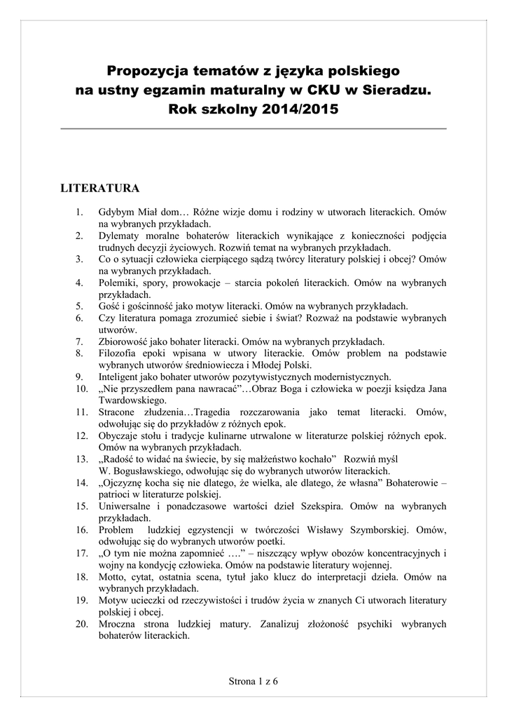 Propozycja tematów z języka polskiego na ustny egzamin maturalny w CKU w Sieradzu. Rok szkolny 2014/2015 LITERATURA 1. 2. 3. 4. 5. 6. 7. 8. 9. 10. 11. 12. 13. 14. 15. 16. 17. 18. 19. 20. Gdybym Miał dom… Różne wizje domu i rodziny w utworach literackich. Omów na wybranych przykładach. Dylematy moralne bohaterów literackich wynikające z konieczności podjęcia trudnych decyzji życiowych. Rozwiń temat na wybranych przykładach. Co o sytuacji człowieka cierpiącego sądzą twórcy literatury polskiej i obcej? Omów na wybranych przykładach. Polemiki, spory, prowokacje – starcia pokoleń literackich. Omów na wybranych przykładach. Gość i gościnność jako motyw literacki. Omów na wybranych przykładach. Czy literatura pomaga zrozumieć siebie i świat? Rozważ na podstawie wybranych utworów. Zbiorowość jako bohater literacki. Omów na wybranych przykładach. Filozofia epoki wpisana w utwory literackie. Omów problem na podstawie wybranych utworów średniowiecza i Młodej Polski. Inteligent jako bohater utworów pozytywistycznych modernistycznych. „Nie przyszedłem pana nawracać”…Obraz Boga i człowieka w poezji księdza Jana Twardowskiego. Stracone złudzenia…Tragedia rozczarowania jako temat literacki. Omów, odwołując się do przykładów z różnych epok. Obyczaje stołu i tradycje kulinarne utrwalone w literaturze polskiej różnych epok. Omów na wybranych przykładach. „Radość to widać na świecie, by się małżeństwo kochało” Rozwiń myśl W. Bogusławskiego, odwołując się do wybranych utworów literackich. „Ojczyznę kocha się nie dlatego, że wielka, ale dlatego, że własna” Bohaterowie – patrioci w literaturze polskiej. Uniwersalne i ponadczasowe wartości dzieł Szekspira. Omów na wybranych przykładach. Problem ludzkiej egzystencji w twórczości Wisławy Szymborskiej. Omów, odwołując się do wybranych utworów poetki. „O tym nie można zapomnieć ….” – niszczący wpływ obozów koncentracyjnych i wojny na kondycję człowieka. Omów na podstawie literatury wojennej. Motto, cytat, ostatnia scena, tytuł jako klucz do interpretacji dzieła. Omów na wybranych przykładach. Motyw ucieczki od rzeczywistości i trudów życia w znanych Ci utworach literatury polskiej i obcej. Mroczna strona ludzkiej matury. Zanalizuj złożoność psychiki wybranych bohaterów literackich. Strona 1 z 6 21. 22. 23. 24. 25. 26. 27. 28. 29. 30. 31. 32. 33. 34. 35. 36. 37. 38. 39. 40. 41. 42. 43. 44. 45. 46. 47. Od Krasickiego do Młynarskiego. Polska literatura satyryczna w walce z wadami Polaków. Świat ludowych wierzeń i wartości oraz jego rola w literaturze. Omów na przykładzie wybranych tekstów literackich. Jak „rodzą się” zbrodniarze ? Na podstawie wybranych lektur wykaż, że literatura jest źródłem wiedzy o wpływie różnych czynników na degradację jednostki. Młodzi gniewni wśród twórców i bohaterów literackich. Zaprezentuj swoje przemyślenia na temat przyczyn i sensu ich buntu i ofiary. Archetyp Don Kichota w wybranych dziełach literatury polskiej i obcej. Powstaniec, organicznik, dekadent – Twoja ocena różnych postaw wykreowanych przez literaturę XIX w. Funkcje motywów biblijnych i aluzji literackich w powieści M. Bułhakowa „Mistrz i Małgorzata”. Obłąkani i szaleni jako bohaterowie utworów literackich. Omów na wybranych przykładach z różnych epok. Duchowni jako bohaterowie utworów literackich. Omów na wybranych przykładach z różnych epok. Sport jako temat utworów literackich. Przedstaw na wybranych przykładach. Kolęda polska od Karpińskiego po czasy współczesne. Przedstaw dzieje i rozwój gatunku na podstawie wybranych kolęd. Różnorodność i uniwersalność twórczości S. Lema na przykładzie wybranych utworów artysty. Motyw poświęcenia jednostki w imię wyższych idei na przykładzie literatury fantastyczno-naukowej i fantasy. Problem nienawiści i nietolerancji rasowej w świecie powieści A. Sapkowskiego. „Pieniądz rządzi światem” – omów zagadnienie odwołując się do wybranych utworów literackich. Jan Paweł II – pielgrzym, patriota, poeta … Dlaczego Ojca Świętego nazywamy reformatorem XX wieku. Postacie z mitologii greckiej i ich zachowania jako wzorce oraz inspiracja dla ludzkości. Przedstaw na wybranych przykładach. Literackie wizje szczęścia. Na wybranych przykładach przedstaw różne ujęcia motywu. Magia miejsc. Mity, legendy, opowieści Twojego miasta (regionu) jako tworzywo literackie. Przedstaw różne ujęcia na wybranych przykładach. Cierpienie jako doświadczenie bohaterów literackich. Wskaż różne ujęcia i funkcje tego motywu na przykładzie wybranych utworów. Sposoby i funkcje kreowania buntowniczych postaw młodych. Porównaj je, odwołując się do wybranych utworów literackich różnych epok. „Błądzi człowiek póki dąży”…(J W. Goethe). Odwołując się do wybranych dzieł literackich, przedstaw życiowe cele, sukcesy i błędy ich bohaterów. Sposób i cel prezentowania rzeczywistości w reportażu. Omów na wybranych przykładach. Przedstaw motyw przemijania i jego funkcji w literaturze różnych epok. Omów na wybranych przykładach. Literackie portrety bohaterów skazanych na samotność i samotnych z wyboru. Omów na wybranych przykładach. Tragizm i jego obraz dramaturgiczny w teatrze autycznym i szekspirowskim. Przemiana wewnętrzna jako motyw literacki i element określający osobowość bohatera literackiego. Strona 2 z 6 48. 49. 50. 51. 52. 53. 54. 55. 56. 57. 58. 59. 60. 61. 62. 63. 64. 65. 66. 67. 68. 69. 70. 71. 72. 73. 74. 75. 76. Konflikt pokoleń jako problem obecny w literaturze. Dramat człowieka uwikłanego w historię i los zbiorowy jako ważny problem w literaturze współczesnej.. Zaprezentuj różne sposoby pokazywania człowieka jako marionetki w teatrze świata. Dokonaj prezentacji utworów z różnych epok literackich. Dzienniki, pamiętniki jako sposób utrwalania własnych 