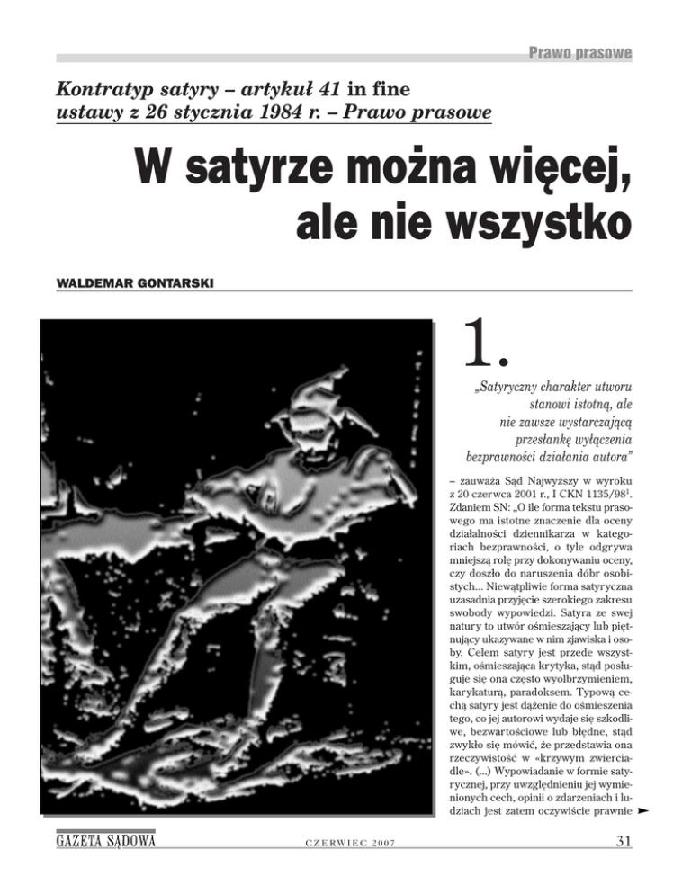 Prawo prasowe Kontratyp satyry – artykuł 41 in fine ustawy z 26 stycznia 1984 r. – Prawo prasowe W satyrze można więcej, ale nie wszystko WALDEMAR GONTARSKI 1. „Satyryczny charakter utworu stanowi istotną, ale nie zawsze wystarczającą przesłankę wyłączenia bezprawności działania autora” – zauważa Sąd Najwyższy w wyroku z 20 czerwca 2001 r., I CKN 1135/981. Zdaniem SN: „O ile forma tekstu praso− wego ma istotne znaczenie dla oceny działalności dziennikarza w katego− riach bezprawności, o tyle odgrywa mniejszą rolę przy dokonywaniu oceny, czy doszło do naruszenia dóbr osobi− stych... Niewątpliwie forma satyryczna uzasadnia przyjęcie szerokiego zakresu swobody wypowiedzi. Satyra ze swej natury to utwór ośmieszający lub pięt− nujący ukazywane w nim zjawiska i oso− by. Celem satyry jest przede wszyst− kim, ośmieszająca krytyka, stąd posłu− guje się ona często wyolbrzymieniem, karykaturą, paradoksem. Typową ce− chą satyry jest dążenie do ośmieszenia tego, co jej autorowi wydaje się szkodli− we, bezwartościowe lub błędne, stąd zwykło się mówić, że przedstawia ona rzeczywistość w «krzywym zwiercia− dle». (...) Wypowiadanie w formie saty− rycznej, przy uwzględnieniu jej wymie− nionych cech, opinii o zdarzeniach i lu− dziach jest zatem oczywiście prawnie C Z E RW I E C 2 0 0 7 31 Prawo prasowe dozwolone i mieści się, co do zasady, w granicach konstytucyjnej wolności słowa. To wszystko jednak nie «ozna− cza», że satyra jest całkowicie poza «kontrolą», że nie dotyczą jej kryteria oceny stosowane do innych wypowie− dzi publicznych, z tym jednym zastrze− żeniem, iż granice swobody wypowie− dzi wyznaczyć tu należy szeroko”. W związku z tym orzeczeniem dok− tr yna stwierdza, że „brak podstaw do założenia, że satyr yczny charakter utworu niejako z góry wyłącza bez− prawność autora”2. Innymi słowy, w przypadku satyr y, w przeciwień− stwie do zwykłej kr ytyki, można wię− cej, ale nie wszystko; przez satyrę3 rozumiemy utwór ośmieszający i zali− cza się do niej też karykaturę – utwór rysunkowy4. 2. Na konieczność uwzględnienia ga− tunku (formy) wypowiedzi przy doko− nywaniu kwalifikacji prawnej, zwraca uwagę też orzecznictwo strasburskie. „Artyści i osoby, które promują ich prace z pewnością nie są zwolnieni z możliwości zastosowania wobec nich ograniczeń wynikających z ust. 2 art. 10 Konwencji. Każda osoba, która ko− rzysta ze swobody wypowiedzi bierze na siebie, zgodnie z wyraźnym brze− mieniem tego ustępu, obowiązki i od− powiedzialność. Ich zakres jest uza− leżniony od sytuacji i użytych środ− ków (podkreślenie moje – W.G.). Przy ocenie, czy kara była konieczna w de− mokratycznym społeczeństwie, Trybu− nał nie mógł tego pominąć” – orzecze− nie Europejskiego Trybunału Praw Człowieka w Strasburgu (ETPCz) z 24 maja 1988 r., Müller i inni przeciwko Szwajcarii (swoboda wypowiedzi arty− stycznej). W tym kontekście należy też odczytywać następującą tezę: „Swo− boda wypowiedzi jest jedną z głównych podstaw demokratycznego społeczeń− stwa, warunkiem jego rozwoju i samo− realizacji. Z zastrzeżeniem ust. 2 art. 10, nie może ograniczyć się do infor− 32 macji i poglądów, które są odbierane przychylnie albo postrzegane jako nie− szkodliwe lub obojętne, lecz odnosi się w równym stopniu do takich, które obrażają, oburzają lub wprowadzają nie− pokój w państwie lub w jakiejś grupie społeczeństwa. Takie są wymagania pluralizmu, tolerancji i otwartości na inne poglądy, bez których demokra− tyczne społeczeństwo nie istnieje” – orzeczenie ETPCz z 17 grudnia 1976 r. w sprawie Handyside przeciwko Wielkiej Brytanii (zajęcie i konfiskata książki uznanej za obsceniczną i ukaranie wy− dawcy grzywną). Słowem, również według orzecznic− twa strasburskiego, formę (charakter) ekspresji – użyte środki ekspresyjne – należy brać pod uwagę przy ustalaniu zakresy wolności wypowiedzi, w tym przy ustalaniu prawnie dopuszczalnego obrażania, oburzania lub wprowadza− nia niepokoju. W przypadku wypowie− dzi cechujących subiektywizm, a więc w przypadku wypowiedzi artystycz− nych i satyrycznych, ta wolność jest stosunkowo duża. Na gruncie systemu krajowego na tym polega odpowiednie zastosowanie kontratypu krytyki do sa− tyry – art. 41 in fine ustawy z 26 stycz− nia 1984 r. – Prawo prasowe5. 3. Sąd Najwyższy w przywołanym na wstępie wyroku z 20 czerwca 2001 r., I CKN 1135/98 – formułuje dwa teksty wyłączenia bezprawności satyry: l satyra nie może wykraczać poza rzeczywiste potrzeby i poniżać godności osobistej „dotkniętej” nią osoby; l istotnym elementem jest waga problemów lub zjawisk będą− cych przedmiotem satyrycznej wypowiedzi. W sumie mamy tutaj trzy testy: na− kaz proporcjonalności (nie wykraczać poza rzeczywiste potrzeby, np. zakaz pogardliwego przedstawiania znaku towarowego firmy, z której ironizu− jemy), zakaz atakowania czci wewnę− C Z E RW I E C 2 0 0 7 trznej, czyli zakaz atakowania ad perso− nam (dotyczący wyłącznie osób fi− zycznych) oraz ciężar gatunkowy (wa− ga problemów lub zjawisk będących przedmiotem satyr ycznej wypowie− dzi). Pier wszy i trzeci test wyprowa− dzić możemy z zasad współżycia spo− łecznego, a drugi – z zapisanego w art. 41 p.p. przedmiotowego charakteru sformułowanego w tym przepisie kon− tratypu. Do tych trzech testów legal− ności satyr y dodajmy jeszcze jeden, wynikający z klauzuli generalnej „rze− telność”, też występującej w art. 41 p.p. – chodzi o to, że satyra jako ujemna ocena choć przejaskrawiona, to powin− na być wnioskiem wyprowadzonym z faktów, czyli satyra powinna mieć za− kotwiczenie w rzeczywistości. Powinna być krzywym zwierciadłem właśnie rzeczywistości (a nie kłamstwa) rek
