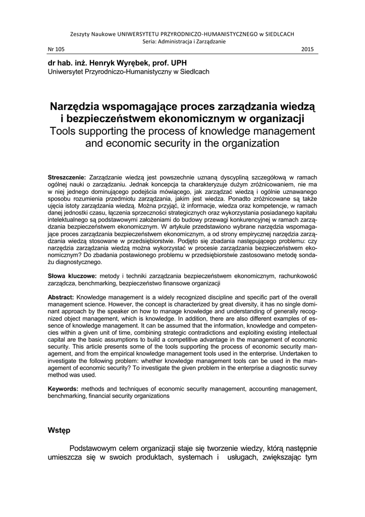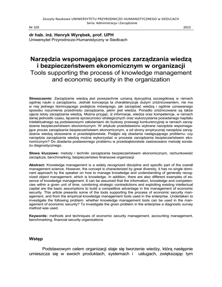 Zeszyty Naukowe UNIWERSYTETU PRZYRODNICZO-HUMANISTYCZNEGO w SIEDLCACH Seria: Administracja i Zarządzanie Nr 105 2015 dr hab. inż. Henryk Wyrębek, prof. UPH Uniwersytet Przyrodniczo-Humanistyczny w Siedlcach Narzędzia wspomagające proces zarządzania wiedzą i bezpieczeństwem ekonomicznym w organizacji Tools supporting the process of knowledge management and economic security in the organization Streszczenie: Zarządzanie wiedzą jest powszechnie uznaną dyscypliną szczegółową w ramach ogólnej nauki o zarządzaniu. Jednak koncepcja ta charakteryzuje dużym zróżnicowaniem, nie ma w niej jednego dominującego podejścia mówiącego, jak zarządzać wiedzą i ogólnie uznawanego sposobu rozumienia przedmiotu zarządzania, jakim jest wiedza. Ponadto zróżnicowane są także ujęcia istoty zarządzania wiedzą. Można przyjąć, iż informacje, wiedza oraz kompetencje, w ramach danej jednostki czasu, łączenia sprzeczności strategicznych oraz wykorzystania posiadanego kapitału intelektualnego są podstawowymi założeniami do budowy przewagi konkurencyjnej w ramach zarządzania bezpieczeństwem ekonomicznym. W artykule przedstawiono wybrane narzędzia wspomagające proces zarządzania bezpieczeństwem ekonomicznym, a od strony empirycznej narzędzia zarządzania wiedzą stosowane w przedsiębiorstwie. Podjęto się zbadania następującego problemu: czy narzędzia zarządzania wiedzą można wykorzystać w procesie zarządzania bezpieczeństwem ekonomicznym? Do zbadania postawionego problemu w przedsiębiorstwie zastosowano metodę sondażu diagnostycznego. Słowa kluczowe: metody i techniki zarządzania bezpieczeństwem ekonomicznym, rachunkowość zarządcza, benchmarking, bezpieczeństwo finansowe organizacji Abstract: Knowledge management is a widely recognized discipline and specific part of the overall management science. However, the concept is characterized by great diversity, it has no single dominant approach by the speaker on how to manage knowledge and understanding of generally recognized object management, which is knowledge. In addition, there are also different examples of essence of knowledge management. It can be assumed that the information, knowledge and competencies within a given unit of time, combining strategic contradictions and exploiting existing intellectual capital are the basic assumptions to build a competitive advantage in the management of economic security. This article presents some of the tools supporting the process of economic security management, and from the empirical knowledge management tools used in the enterprise. Undertaken to investigate the following problem: whether knowledge management tools can be used in the management of economic security? To investigate the given problem in the enterprise a diagnostic survey method was used. Keywords: methods and techniques of economic security management, accounting management, benchmarking, financial security organizations Wstęp Podstawowym celem organizacji staje się tworzenie wiedzy, którą następnie umieszcza się w swoich produktach, systemach i usługach, zwiększając tym 228 H. Wyrębek 1 samym ich wartość, co przyczynia się do wzrostu zysku danej organizacji i zapewnienia i utrzymania bezpieczeństwa ekonomicznego organizacji. Zarządzanie wiedzą przedsiębiorstwa pociąga za sobą oficjalne nadzorowanie zasobów wiedzy w celu ułatwienia dostępu i ponownego wykorzystania 2 wiedzy, zwykle przez używanie rozwiniętych technologii informatycznych . Wiedza jest sklasyfikowana i podzielona na kategorie według wcześniej wyszczególnionych ontologii w uporządkowane lub częściowo uporządkowane bazy i banki wiedzy. Nadrzędnym celem zarządzania wiedzą jest udostępnienie wiedzy przedsiębiorstwu do ponownego wykorzystania. Źródła wiedzy różnią się dla poszczególnych przemysłów i zastosowań, ale generalnie obejmują podręczniki, listy, streszczenia odpowiedzi klientów, wiadomości i informacje o klientach, konkurencji i wiedzę wywodzącą się z procesów składających się na funkcjonowanie organizacji. Zarządzanie wiedzą to suma wszystkich inicjatyw, metod i narzędzi stosowanych w ramach interdyscyplinarnego podejścia zmierzającego do zlokalizo3 wania, pozyskania, rozwijania, zachowania, wykorzystania i dzielenia się wiedzą . Tworzenie wiedzy w organizacji odbywa się na poziomie grupy, pod warunkiem iż organizacja zapewni swoim pracownikom odpowiednie narzędzia wspomaga4 jące . Można przyjąć, iż informacje, wiedza oraz kompetencje, w ramach danej jednostki czasu, łączenia sprzeczności strategicznych oraz wykorzystania posiadanego kapitału intelektualnego są podstawowymi założeniami do budowy przewagi konkurencyjnej w ramach zarządzania bezpieczeństwem ekonomicznym, które winno obejmować: a) sztukę prewencyjnego rozpoznawania zagrożeń: − w gospodarce światowej i narodowej, − w działalności przedsiębiorstw (cały obrót gospodarczy), − w społeczno-ekonomicznym funkcjonowaniu gospodarstw domowych, b) sprawne wprowadzanie działań zabezpieczających przed stanem nierównowagi ekonomicznej (operacyjne i taktyczne zabezpieczenia aktywów oraz racjonalizacja wydatków), c) strategiczną zdolność osiągania zamierzonych celów (w ramach wyprzedzającego planowania oraz projektowania przyszłości, podatnej na zmienne trendy), d) umiejętność porządkowania chaosu w ekonomicznych sytuacjach kryzyso5 wych . 1 E. Skrzypek, Wpływ wiedzy i innowacyjności na sukces organizacji w warunkach GOW – kierunki usprawnień, [w:] Jarosław S. Kardas (red.), Zarządzanie kapitałem ludzkim, Wydawnictwo Studio Emka, Warszawa 2014, s. 146. 2 M. Staniewski, Zarządzanie wiedzą: od koncepcji do praktyki działania. „Organizacja i Kierowanie”, 2002 nr 3 s. 11-27. 3 K. Raczkowski, Zarządzanie wiedzą w administracji celnej w systemie bezpieczeństwa ekonomicznospołecznego, Difin, Warszawa 2010, s. 76. 4 H. Wyrębek, Koncepcja orga