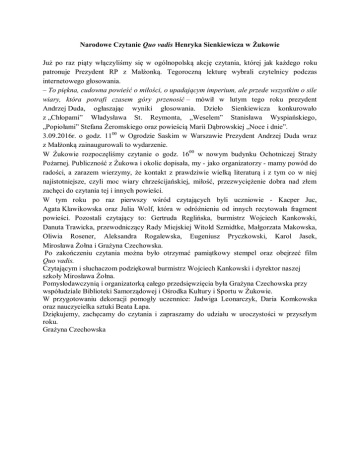 Narodowe Czytanie Quo vadis Henryka Sienkiewicza w Żukowie Już po raz piąty włączyliśmy się w ogólnopolską akcję czytania, której jak każdego roku patronuje Prezydent RP z Małżonką. Tegoroczną lekturę wybrali czytelnicy podczas internetowego głosowania. – To piękna, cudowna powieść o miłości, o upadającym imperium, ale przede wszystkim o sile wiary, która potrafi czasem góry przenosić – mówił w lutym tego roku prezydent Andrzej Duda, ogłaszając wyniki głosowania. Dzieło Sienkiewicza konkurowało z „Chłopami” Władysława St. Reymonta, „Weselem” Stanisława Wyspiańskiego, „Popiołami” Stefana Żeromskiego oraz powieścią Marii Dąbrowskiej „Noce i dnie”. 3.09.2016r. o godz. 1100 w Ogrodzie Saskim w Warszawie Prezydent Andrzej Duda wraz z Małżonką zainaugurowali to wydarzenie. W Żukowie rozpoczęliśmy czytanie o godz. 1600 w nowym budynku Ochotniczej Straży Pożarnej. Publiczność z Żukowa i okolic dopisała, my - jako organizatorzy - mamy powód do radości, a zarazem wierzymy, że kontakt z prawdziwie wielką literaturą i z tym co w niej najistotniejsze, czyli moc wiary chrześcijańskiej, miłość, przezwyciężenie dobra nad złem zachęci do czytania tej i innych powieści. W tym roku po raz pierwszy wśród czytających byli uczniowie - Kacper Juc, Agata Klawikowska oraz Julia Wolf, która w odróżnieniu od innych recytowała fragment powieści. Pozostali czytający to: Gertruda Reglińska, burmistrz Wojciech Kankowski, Danuta Trawicka, przewodniczący Rady Miejskiej Witold Szmidtke, Małgorzata Makowska, Oliwia Rosener, Aleksandra Rogalewska, Eugeniusz Pryczkowski, Karol Jasek, Mirosława Żołna i Grażyna Czechowska. Po zakończeniu czytania można było otrzymać pamiątkowy stempel oraz obejrzeć film Quo vadis. Czytającym i słuchaczom podziękował burmistrz Wojciech Kankowski i dyrektor naszej szkoły Mirosława Żołna. Pomysłodawczynią i organizatorką całego przedsięwzięcia była Grażyna Czechowska przy współudziale Biblioteki Samorządowej i Ośrodka Kultury i Sportu w Żukowie. W przygotowaniu dekoracji pomogły uczennice: Jadwiga Leonarczyk, Daria Komkowska oraz nauczycielka sztuki Beata Łapa. Dziękujemy, zachęcamy do czytania i zapraszamy do udziału w uroczystości w przyszłym roku. Grażyna Czechowska