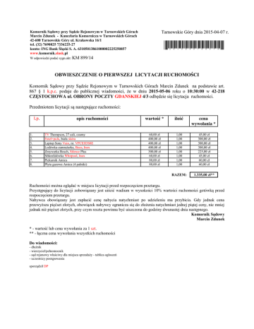 Tarnowskie Góry dnia 2015-04-07 r. Komornik Sądowy przy Sądzie Rejonowym w Tarnowskich Górach Marcin Zdunek - Kancelaria Komornicza w Tarnowskich Górach 42-600 Tarnowskie Góry ul. Krakowska 16/1 tel. (32) 7690825 7336225-27 konto: ING Bank Śląski S. A. 63105013861000002225250857 www.komornik.slask.pl W odpowiedzi podać sygn.akt: KM *2015040700574* 899/14 OBWIESZCZENIE O PIERWSZEJ LICYTACJI RUCHOMOŚCI Komornik Sądowy przy Sądzie Rejonowym w Tarnowskich Górach Marcin Zdunek na podstawie art. 867 § 1 k.p.c. podaje do publicznej wiadomości, że w dniu 2015-05-06 roku o 10:30:00 w 42-218 CZĘSTOCHOWA ul. OBRONY POCZTY GDANSKIEJ 4/3 odbędzie się licytacja ruchomości. Przedmiotem licytacji są następujące ruchomości: opis ruchomości l.p. 1. 2. 3. 4. 5. 6. 7. 8. TV Thompson, 27 cali, czarny Fotel+pufa, biała skóra Laptop Sony Vaio, nr. VPCEH3S8E Lodówka-zamrażarka, Beco, Inox Zmywarka Bosch, Silence Plus Mikrofalówka Whirpool, Inox Piekarnik Amica Płyta gazowa Amica (4 palniki) wartość * ilość cena wywołania * 60,00 zł 400,00 zł 400,00 zł 400,00 zł 300,00 zł 60,00 zł 80,00 zł 80,00 zł 1,00 1,00 1,00 1,00 1,00 1,00 1,00 1,00 45,00 zł 300,00 zł 300,00 zł 300,00 zł 225,00 zł 45,00 zł 60,00 zł 60,00 zł RAZEM: 1.335,00 zł** Ruchomości można oglądać w miejscu licytacji przed rozpoczęciem przetargu. Przystępujący do licytacji zobowiązany jest uiścić wadium w wysokości 10% wartości ruchomości gotówką przed rozpoczęciem przetargu. Nabywca obowiązany jest zapłacić cenę nabycia natychmiast po udzieleniu mu przybicia. Gdy jednak cena przewyższa pięćset złotych, obowiązek nabywcy ogranicza się do złożenia natychmiast jednej piątej ceny, nie mniej jednak niż pięćset złotych, przy czym reszta powinna być uiszczona do godziny dwunastej dnia następnego. Komornik Sądowy Marcin Zdunek * - wartość lub cena wywołania za 1 szt. ** - łączna cena wywołania wszystkich ruchomości Do wiadomości: - dłużnik - wierzyciel/pełnomocnik - sąd rejonowy właściwy dla miejsca sprzedaży - tablica ogłoszeń - uczestnicy postępowania sporządził DP