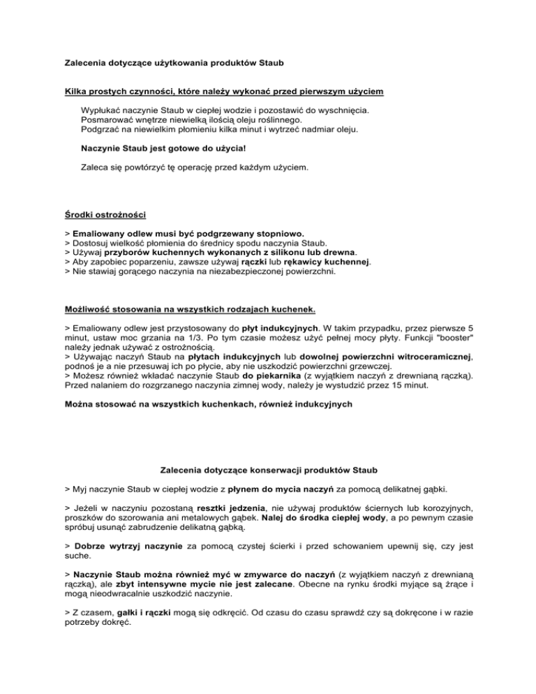 Zalecenia dotyczące użytkowania produktów Staub Kilka prostych czynności, które należy wykonać przed pierwszym użyciem Wypłukać naczynie Staub w ciepłej wodzie i pozostawić do wyschnięcia. Posmarować wnętrze niewielką ilością oleju roślinnego. Podgrzać na niewielkim płomieniu kilka minut i wytrzeć nadmiar oleju. Naczynie Staub jest gotowe do użycia! Zaleca się powtórzyć tę operację przed każdym użyciem. Środki ostrożności > Emaliowany odlew musi być podgrzewany stopniowo. > Dostosuj wielkość płomienia do średnicy spodu naczynia Staub. > Używaj przyborów kuchennych wykonanych z silikonu lub drewna. > Aby zapobiec poparzeniu, zawsze używaj rączki lub rękawicy kuchennej. > Nie stawiaj gorącego naczynia na niezabezpieczonej powierzchni. Możliwość stosowania na wszystkich rodzajach kuchenek. > Emaliowany odlew jest przystosowany do płyt indukcyjnych. W takim przypadku, przez pierwsze 5 minut, ustaw moc grzania na 1/3. Po tym czasie możesz użyć pełnej mocy płyty. Funkcji "booster" należy jednak używać z ostrożnością. > Używając naczyń Staub na płytach indukcyjnych lub dowolnej powierzchni witroceramicznej, podnoś je a nie przesuwaj ich po płycie, aby nie uszkodzić powierzchni grzewczej. > Możesz również wkładać naczynie Staub do piekarnika (z wyjątkiem naczyń z drewnianą rączką). Przed nalaniem do rozgrzanego naczynia zimnej wody, należy je wystudzić przez 15 minut. Można stosować na wszystkich kuchenkach, również indukcyjnych Zalecenia dotyczące konserwacji produktów Staub > Myj naczynie Staub w ciepłej wodzie z płynem do mycia naczyń za pomocą delikatnej gąbki. > Jeżeli w naczyniu pozostaną resztki jedzenia, nie używaj produktów ściernych lub korozyjnych, proszków do szorowania ani metalowych gąbek. Nalej do środka ciepłej wody, a po pewnym czasie spróbuj usunąć zabrudzenie delikatną gąbką. > Dobrze wytrzyj naczynie za pomocą czystej ścierki i przed schowaniem upewnij się, czy jest suche. > Naczynie Staub można również myć w zmywarce do naczyń (z wyjątkiem naczyń z drewnianą rączką), ale zbyt intensywne mycie nie jest zalecane. Obecne na rynku środki myjące są żrące i mogą nieodwracalnie uszkodzić naczynie. > Z czasem, gałki i rączki mogą się odkręcić. Od czasu do czasu sprawdź czy są dokręcone i w razie potrzeby dokręć.