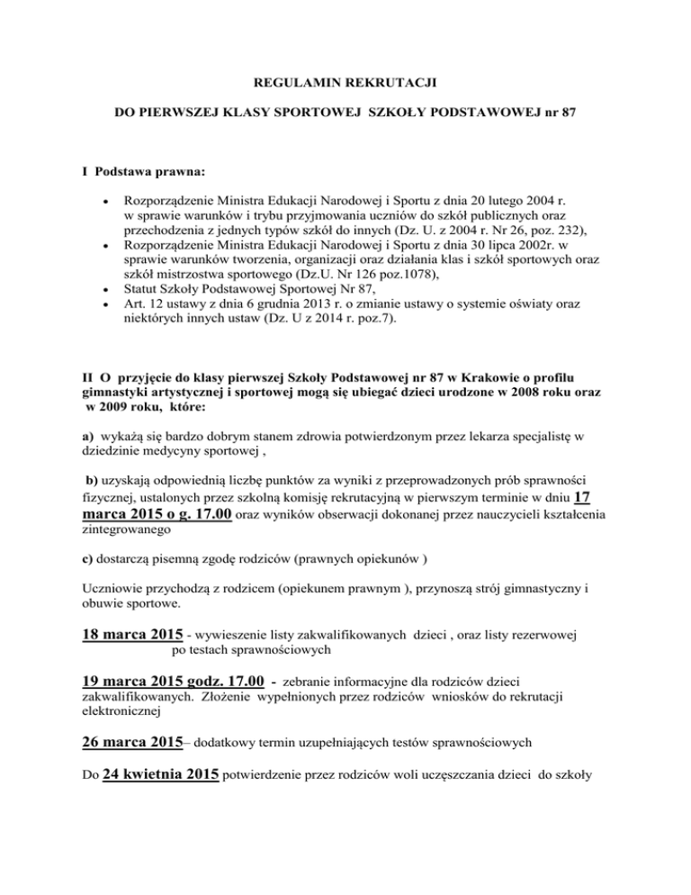 REGULAMIN REKRUTACJI DO PIERWSZEJ KLASY SPORTOWEJ SZKOŁY PODSTAWOWEJ nr 87 I Podstawa prawna: Rozporządzenie Ministra Edukacji Narodowej i Sportu z dnia 20 lutego 2004 r. w sprawie warunków i trybu przyjmowania uczniów do szkół publicznych oraz przechodzenia z jednych typów szkół do innych (Dz. U. z 2004 r. Nr 26, poz. 232), Rozporządzenie Ministra Edukacji Narodowej i Sportu z dnia 30 lipca 2002r. w sprawie warunków tworzenia, organizacji oraz działania klas i szkół sportowych oraz szkół mistrzostwa sportowego (Dz.U. Nr 126 poz.1078), Statut Szkoły Podstawowej Sportowej Nr 87, Art. 12 ustawy z dnia 6 grudnia 2013 r. o zmianie ustawy o systemie oświaty oraz niektórych innych ustaw (Dz. U z 2014 r. poz.7). II O przyjęcie do klasy pierwszej Szkoły Podstawowej nr 87 w Krakowie o profilu gimnastyki artystycznej i sportowej mogą się ubiegać dzieci urodzone w 2008 roku oraz w 2009 roku, które: a) wykażą się bardzo dobrym stanem zdrowia potwierdzonym przez lekarza specjalistę w dziedzinie medycyny sportowej , b) uzyskają odpowiednią liczbę punktów za wyniki z przeprowadzonych prób sprawności fizycznej, ustalonych przez szkolną komisję rekrutacyjną w pierwszym terminie w dniu 17 marca 2015 o g. 17.00 oraz wyników obserwacji dokonanej przez nauczycieli kształcenia zintegrowanego c) dostarczą pisemną zgodę rodziców (prawnych opiekunów ) Uczniowie przychodzą z rodzicem (opiekunem prawnym ), przynoszą strój gimnastyczny i obuwie sportowe. 18 marca 2015 - wywieszenie listy zakwalifikowanych dzieci , oraz listy rezerwowej po testach sprawnościowych 19 marca 2015 godz. 17.00 - zebranie informacyjne dla rodziców dzieci zakwalifikowanych. Złożenie wypełnionych przez rodziców wniosków do rekrutacji elektronicznej 26 marca 2015– dodatkowy termin uzupełniających testów sprawnościowych Do 24 kwietnia 2015 potwierdzenie przez rodziców woli uczęszczania dzieci do szkoły 27 kwietnia 2015 - ogłoszenie listy przyjętych uczniów na rok szkolny 2015/2016, w rekrutacji elektronicznej od 28 kwietnia 2015 – rekrutacja uzupełniająca III Wymagane dokumenty: a) karta zapisu dziecka do samorządowych szkół podstawowych na rok szkolny 2015/2016 b) zaświadczenie lekarskie o stanie zdrowia dziecka (po przyjęciu do szkoły ) IV Szkolna Komisja Rekrutacyjno-Kwalifikacyjna , której skład ustala Dyrektor Szkoły -prowadzi postępowanie kwalifikacyjne według zasad opracowanego testu sprawnościowego oraz przeprowadza te testy, -ustala listę kandydatów do klasy sportowej, -sporządza protokół z postępowania kwalifikacyjnego V Rodzaj testów sprawności ogólnej i specjalnej TESTY DLA CHŁOPCÓW 1. 2. 3. 4. 5. 6. Skok w dal z miejsca Bieg wahadłowy 4x10 m Zwis o ramionach zgiętych na drążku Siady z leżenia w ciągu 30 s Skłon w przód o nogach złączonych Szpagaty 3 rodzaje , mostek , ruchomość w stawach barkowych TESTY DLA DZIEWCZĄT Test gibkości, na który składa się: 1. Wykonanie 3 szpagatów 2. Wykonanie ,,mostka” z leżenia oraz ,,foczki” 3. Wykonanie skłonu w przód o nogach złączonych i w rozkroku Testy siły, na który składa się: 1. Siady z leżenia w czasie 30 s 2. Zwis o ramionach zgiętych na drążku Testy koordynacji: 1. Przeskoki przez skakankę 2. Wykonanie ruchu ósemki ze skakanką 3. Wykonanie prostej manipulacji skakanką Uwaga : Nie wyklucza się przesunięcia ucznia do szkoły rejonowej w ciągu roku szkolnego z przyczyn zdrowotnych , wychowawczych lub organizacyjnych lub w związku z brakiem postępu w rozwijaniu umiejętności sportowych. Szkoła zastrzega sobie prawo do umieszczenia dziecka na liście rezerwowej bez konieczności przyjęcia do klasy. Szkoła zastrzega sobie prawo do odesłania dziecka do Poradni PedagogicznoPsychologicznej w celu przeprowadzenia badań psychologicznych. VI Listę kandydatów przyjętych do klasy sportowej zatwierdza dyrektor szkoły. VII Liczebność uczniów w klasie sportowej jest zgodna z obowiązującymi przepisami oświatowymi
