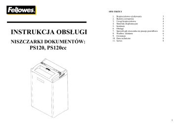 SPIS TREŚCI INSTRUKCJA OBSŁUGI NISZCZARKI DOKUMENTÓW: 1. 2. 3. 4. 5. 6. 7. 8. 9. 10. 11. Bezpieczeństwo użytkowania Budowa zewnętrzna Uwagi bezpieczeństwa Materiały eksploatacyjne Instalacja Obsługa Sprawdź gdy niszczarka nie pracuje prawidłowo Wadliwe działanie Gwarancja Dane techniczne Serwis 3 4 4 5 5 5 6 6 7 8 8 PS120, PS120cc 2 1. BEZPIECZEŃSTWO UŻYTKOWNIKA • • • • • • • • • • • • • • Przeczytaj całą instrukcję przed użyciem urządzenia. Zachowaj tę instrukcję do późniejszego użytku. Przestrzegaj ostrzeżeń i uwag umieszczonych na produkcie. Wyjmij wtyczkę z gniazdka ściennego przed czyszczeniem. Obudowa może być czyszczona ściereczką zamoczoną w wodzie z niewielkim dodatkiem mydła (nie używaj proszków ścierających, benzyny, nafty i innych rozpuszczalników). Umieść urządzenie jak najbliżej gniazda ściennego, by można je było szybko i łatwo rozłączyć. Nie stawiaj urządzenia blisko wody. Nigdy nie stawiaj urządzenia w pobliżu grzejnika lub innego źródła ciepła. Używaj zasilania zgodnego z tabliczką znamionową. Jeżeli masz wątpliwości, co do typu zasilania skontaktuj się ze swoim zakładem energetycznym. Nie kładź nic na kabel zasilający. Nie umieszczaj niszczarki w miejscu, gdzie ktokolwiek mógłby chodzić po kablu. Nie jest zalecane używanie przedłużacza. Jeżeli jednak został użyty, sprawdź czy suma wskaźników ilości amperów urządzeń podłączonych do przedłużacza nie przekracza ogólnego wskaźnika dopuszczalnej ilości amperów przedłużacza. Upewnij się, że łącznie podłączone urządzenia nie przekraczają 15 A (w zależności od typu gniazda sieciowego). Nie dokonuj napraw samodzielnie. Otwarcie lub zdjęcie obudowy może narazić cię na zetknięcie z niebezpiecznymi częściami ruchomymi i innym ryzykiem. Odłącz urządzenie ze ściennego gniazda sieciowego i zwróć się o pomoc do wykwalifikowanego serwisu w przypadku: - gdy kabel zasilający lub wtyczka jest uszkodzona lub zapieczona, - jeżeli został rozlany płyn na urządzenie, - jeżeli urządzenie przebywało pozostawione na deszczu, - jeżeli urządzenie nie pracuje prawidłowo, gdy postępujemy zgodnie z instrukcją, - jeżeli urządzenie zostało upuszczone lub obudowa została uszkodzona. Trzymaj urządzenie z dala od dzieci. Niszczarka ta powinna być użytkowana zgodnie z instrukcją obsługi. 2. BUDOWA ZEWNĘTRZNA 1 8 2 7 3 4 6 5 1. Włącznik trójpozycyjny 2. Głowica 3. Numer seryjny 4. Tabliczka z uwagami bezpieczeństwa 5. Obudowa szafkowa 6. Kosz 7. Szczelina wejściowa 8. Auto stop/start - mikrowłącznik 3. UWAGI BEZPIECZEŃSTWA PAMIĘTAJ!!! Nigdy nie wkładaj ręki, palców i innych niewłaściwych przedmiotów do otworu szczeliny wejściowej. MOŻESZ ZOSTAĆ POWAŻNIE ZRANIONY. Trzymaj wszystkie luźne części ubrania (krawat, długie włosy, biżuterię etc. z daleka od otworu wejściowego. MOŻESZ ZOSTAĆ POWAŻNIE ZRANIONY. Zawsze wyłączaj wtyczkę z kontaktu przed przesuwaniem, konserwacją, myciem lub inną czynnością niż normalna obsługa. MOŻESZ ZOSTAĆ POWAŻNIE ZRANIONY. 3 4 4. MATERIAŁY EKSPLOATACYJNE - torby na ścinki, pakowane po 100 szt. w rolce lub złożone w zależności od rozmiaru. Aby dowiedzieć się jakiej pojemności powinny być torby sprawdź informacje umieszczone na etykiecie na niszczarce. Jeżeli etykieta uległa zaginięciu lub uszkodzeniu skontaktuj się z firmą Fellowes lub twoim lokalnym dostawcą. - olej do niszczarek typu cross-cut, nr katalogowy Fellowes 35250. 5. INSTALACJA - Niszczarka jest dostarczana przygotowana do użytkowania. - Używaj wyłącznie źródła zasilania zgodnego z zaznaczonym na wyrobie. - Zainstaluj niszczarkę tak, żeby wtyk sieciowy był łatwo dostępy. - Niszczarka może być użytkowana wyłącznie w pozycji pionowej. - Ustaw niszczarkę tak, aby otwory wentylacyjne nie były zasłonięte. Aby zabezpieczyć prawidłową wentylację powinna być zachowana minimalna odległość 10 cm od ścian i mebli. 7. SPRAWDŹ GDY NISZCZARKA NIE PRACUJE PRAWIDŁOWO Jeżeli urządzenie nie pracuje prawidłowo sprawdź, postępując jak poniżej: - czy wtyk zasilający jest włączony do gniazdka? - czy włącznik główny jest włączony? - czy kosz nie jest pełen? – opróżnij zawartość - czy papier nie zakleszczył się w niszczarce? - czy silnik nie jest przegrzany? Wyłącz urządzenie i pozwól na ostygnięcie przez 15-20 min. Jeżeli żadna z powyższych czynności nie uruchomiła urządzenia zwróć się do naszego serwisu. Numery telefoniczne i adres znajdziesz na końcu instrukcji. 8. WADLIWE DZIAŁANIE Zakleszczenie papieru 6. OBSŁUGA Przeczytaj instrukcję obsługi przed rozpoczęciem pracy niszczarki. • wciśnij włącznik do pozycji centralnej (2), aby zatrzymać mechanizm tnący, Włącz wtyk do gniazda sieciowego. • wciśnij i przytrzymaj włącznik w poz. (3) i wyjmij papier z powrotem, UWAGA! Nie naciskaj włącznika jednocześnie do przodu/tyłu w poz. (1 i 3) Włącz zasilanie ON - Wciśnij przełącznik do poz. 1 • przełącznik pozostaje w poz. 1 • urządzenie znajduje się w pozycji – gotowość • zmniejsz ilość niszczonego papieru, • wciśnij przełącznik do pozycji ON (1) i kontynuuj niszczenie w mniejszych ilościach, aby nie powodować zakleszczenia urządzenia papierem. - Wsuń papier. • Proces niszczenia włącza mikrowłącznik umieszczony w szczelinie wejściowej, niszczenie rozpoczyna się automatycznie. • Gdy niszczenie jest skończone mechanizm tnący zatrzyma się po około 3 sekundach. Wyłącz zasilanie OFF - Wciśnij przełącznik do poz. 3 • Włącznik zatrzyma się w centralnym położeniu i urządzenie wyłączy się. 5 1 6 Włącznik prawidłowego włożenia kosza • niszczarka wyłącza się automatycznie, • wciśnij przełącznik do poz. 2 • sprawdź czy kosz na ścinki jest prawidłowo włożony do szafki • wciśnij przełącznik do poz. 1 i kontynuuj