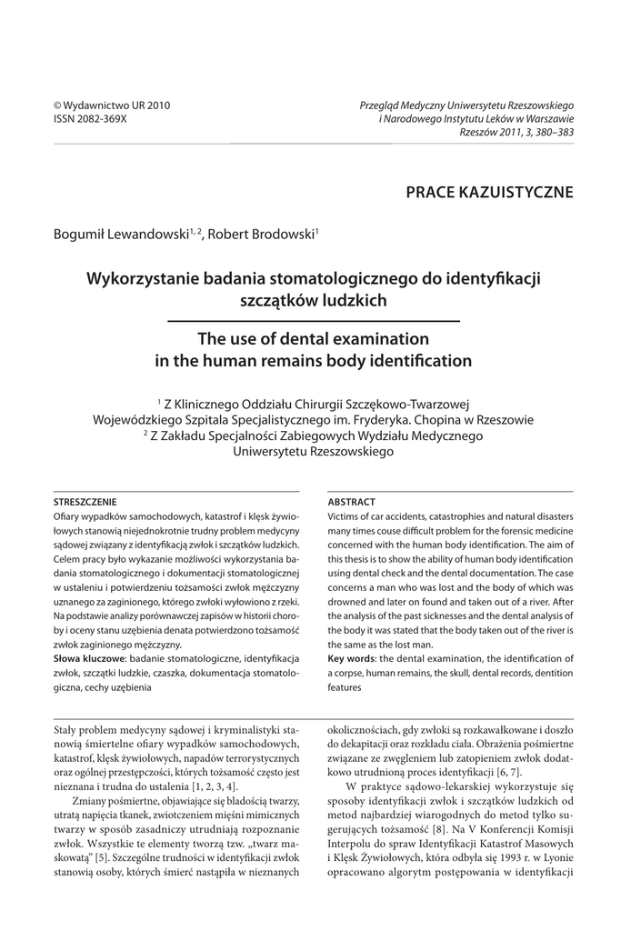 380 Przegląd Medyczny Uniwersytetu Rzeszowskiego i Narodowego Instytutu Leków w Warszawie, 2011, 3, 380–383 © Wydawnictwo UR 2010 ISSN 2082-369X Przegląd Medyczny Uniwersytetu Rzeszowskiego i Narodowego Instytutu Leków w Warszawie Rzeszów 2011, 3, 380–383 PRACE KAZUISTYCZNE Bogumił Lewandowski1, 2, Robert Brodowski1 Wykorzystanie badania stomatologicznego do identyfikacji szczątków ludzkich The use of dental examination in the human remains body identification Z Klinicznego Oddziału Chirurgii Szczękowo-Twarzowej Wojewódzkiego Szpitala Specjalistycznego im. Fryderyka. Chopina w Rzeszowie 2 Z Zakładu Specjalności Zabiegowych Wydziału Medycznego Uniwersytetu Rzeszowskiego 1 STRESZCZENIE Ofiary wypadków samochodowych, katastrof i klęsk żywiołowych stanowią niejednokrotnie trudny problem medycyny sądowej związany z identyfikacją zwłok i szczątków ludzkich. Celem pracy było wykazanie możliwości wykorzystania badania stomatologicznego i dokumentacji stomatologicznej w ustaleniu i potwierdzeniu tożsamości zwłok mężczyzny uznanego za zaginionego, którego zwłoki wyłowiono z rzeki. Na podstawie analizy porównawczej zapisów w historii choroby i oceny stanu uzębienia denata potwierdzono tożsamość zwłok zaginionego mężczyzny. Słowa kluczowe: badanie stomatologiczne, identyfikacja zwłok, szczątki ludzkie, czaszka, dokumentacja stomatologiczna, cechy uzębienia ABSTRACT Victims of car accidents, catastrophies and natural disasters many times couse difficult problem for the forensic medicine concerned with the human body identification. The aim of this thesis is to show the ability of human body identification using dental check and the dental documentation. The case concerns a man who was lost and the body of which was drowned and later on found and taken out of a river. After the analysis of the past sicknesses and the dental analysis of the body it was stated that the body taken out of the river is the same as the lost man. Key words: the dental examination, the identification of a corpse, human remains, the skull, dental records, dentition features Stały problem medycyny sądowej i kryminalistyki stanowią śmiertelne ofiary wypadków samochodowych, katastrof, klęsk żywiołowych, napadów terrorystycznych oraz ogólnej przestępczości, których tożsamość często jest nieznana i trudna do ustalenia [1, 2, 3, 4]. Zmiany pośmiertne, objawiające się bladością twarzy, utratą napięcia tkanek, zwiotczeniem mięśni mimicznych twarzy w sposób zasadniczy utrudniają rozpoznanie zwłok. Wszystkie te elementy tworzą tzw. „twarz maskowatą” [5]. Szczególne trudności w identyfikacji zwłok stanowią osoby, których śmierć nastąpiła w nieznanych okolicznościach, gdy zwłoki są rozkawałkowane i doszło do dekapitacji oraz rozkładu ciała. Obrażenia pośmiertne związane ze zwęgleniem lub zatopieniem zwłok dodatkowo utrudnioną proces identyfikacji [6, 7]. W praktyce sądowo-lekarskiej wykorzystuje się sposoby identyfikacji zwłok i szczątków ludzkich od metod najbardziej wiarogodnych do metod tylko sugerujących tożsamość [8]. Na V Konferencji Komisji Interpolu do spraw Identyfikacji Katastrof Masowych i Klęsk Żywiołowych, która odbyła się 1993 r. w Lyonie opracowano algorytm postępowania w identyfikacji Lewandowski, Brodowski Wykorzystanie badania stomatologicznego do identyfikacji szczątków ludzkich zwłok. Za najbardziej wiarygodne metody uznano: badanie profilu genetycznego DNA [9, 10, 11], porównanie odcisków palców [12] oraz badania uzębienia i inne dane antropologiczno-stomatologiczne łącznie z badaniem radiologicznym [13, 14]. W dalszej kolejności zalecono porównanie danych dotyczących przebytych zabiegów chirurgicznych i procedur leczniczych, znaków szczególnych: tj. amputacje części ciała, blizny, tatuaże. Identyfikacja na podstawie dokumentów znalezionych przy zwłokach, w oparciu o rzeczy osobiste, odzież, biżuterię oraz danych uzyskanych od członków rodziny, znajomych też powinna być uwzględniana podczas badania sekcyjno-identyfikacyjnego [ 15, 16]. Z przeglądu piśmiennictwa specjalistycznego wynika, że badanie stomatologiczne jest powszechnie uznaną metodą identyfikacji zwłok i szczątków ludzkich i polega na ocenie morfologicznych cech jamy ustnej, uzębienia i kości szczękowych w porównaniu z dostępnymi zażyciowymi danymi, zapisanymi w kartach przebiegu leczenia stomatologicznego osoby identyfikowanej [17]. Szczególnie istotne znaczenie mogą mieć nieprawidłowości budowy anatomicznej kości czaszki twarzowej i uzębienia, wady zgryzu oraz inne zaburzenia w układzie stomatognatycznym, tj. obecność zębów dodatkowych, zębów zatrzymanych, ubytków pooperacyjnych kości i przebytych złamań. Dodatkowo, przebieg leczenia ortodontycznego, modele gipsowe zębów, dokumentacja zabiegów protetycznych mogą wnosić ważne informacje rozpoznawcze. Niekiedy decydujące znaczenie mają zdjęcia radiologiczne kości szczęk i zębów [18, 19, 20]. Ocenę należy rozpocząć od szczegółowej analizy rodzaju i liczby zachowanych zębów, z uwzględnieniem indywidualnych cech zgryzu. Kształt i wielkość zębów, ich rozmieszczenie i ustawienie w łuku zębowym oraz dodatkowe szczegóły, takie jak liczba wypełnień w poszczególnych zębach, umiejscowienie ich na poszczególnych powierzchniach zębów oraz rodzaj materiału, z którego wykonano wypełnienia składają się na całościową ocenę stomatologiczną. Istotne znaczenie dla potrzeb identyfikacji mają również uzupełnienia protetyczne, tj. korony protetyczne, mosty oraz częściowe lub całkowite protezy zębowe. W ostatnich latach także obecność implantów [21, 22, 23]. Uzębienie można uznać za cechę wysoce indywidualną, odgrywającą w identyfikacji zwłok rolę porównywalną z badaniem DNA lub odciskami palców. Niektórzy autorzy podkreślają nawet wyższość badania stomatologicznego i