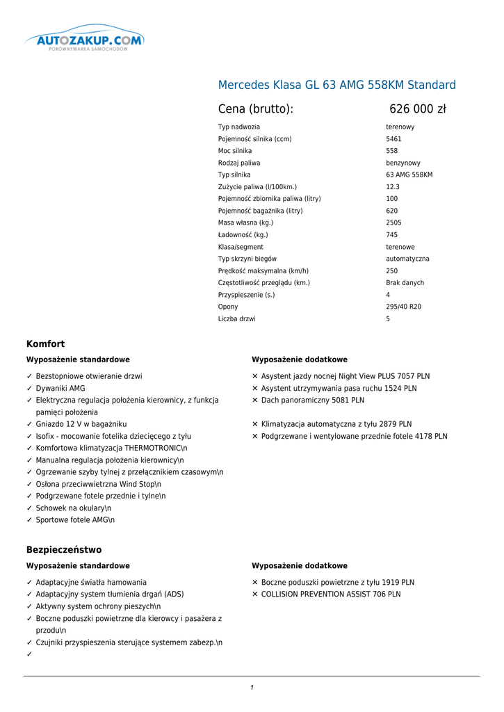 Mercedes Klasa GL 63 AMG 558KM Standard Cena (brutto): 626 000 zł Typ nadwozia terenowy Pojemność silnika (ccm) 5461 Moc silnika 558 Rodzaj paliwa benzynowy Typ silnika 63 AMG 558KM Zużycie paliwa (l/100km.) 12.3 Pojemność zbiornika paliwa (litry) 100 Pojemność bagażnika (litry) 620 Masa własna (kg.) 2505 Ładowność (kg.) 745 Klasa/segment terenowe Typ skrzyni biegów automatyczna Prędkość maksymalna (km/h) 250 Częstotliwość przeglądu (km.) Brak danych Przyspieszenie (s.) 4 Opony 295/40 R20 Liczba drzwi 5 Komfort Wyposażenie standardowe Wyposażenie dodatkowe ✓ Bezstopniowe otwieranie drzwi ✕ Asystent jazdy nocnej Night View PLUS 7057 PLN ✓ Dywaniki AMG ✕ Asystent utrzymywania pasa ruchu 1524 PLN ✓ Elektryczna regulacja położenia kierownicy, z funkcja ✕ Dach panoramiczny 5081 PLN pamięci położenia ✓ Gniazdo 12 V w bagażniku ✕ Klimatyzacja automatyczna z tyłu 2879 PLN ✓ Isofix - mocowanie fotelika dziecięcego z tyłu ✕ Podgrzewane i wentylowane przednie fotele 4178 PLN ✓ Komfortowa klimatyzacja THERMOTRONIC\n ✓ Manualna regulacja położenia kierownicy\n ✓ Ogrzewanie szyby tylnej z przełącznikiem czasowym\n ✓ Osłona przeciwwietrzna Wind Stop\n ✓ Podgrzewane fotele przednie i tylne\n ✓ Schowek na okulary\n ✓ Sportowe fotele AMG\n Bezpieczeństwo Wyposażenie standardowe Wyposażenie dodatkowe ✓ Adaptacyjne światła hamowania ✕ Boczne poduszki powietrzne z tyłu 1919 PLN ✓ Adaptacyjny system tłumienia drgań (ADS) ✕ COLLISION PREVENTION ASSIST 706 PLN ✓ Aktywny system ochrony pieszych\n ✓ Boczne poduszki powietrzne dla kierowcy i pasażera z przodu\n ✓ Czujniki przyspieszenia sterujące systemem zabezp.\n ✓ 1 Dodatkowa blokada zamków drzwi\n 2 ✓ Electronic Stability Program (ESP)\n ✓ ILS - Inteligentne reflektory bi-ksenonowe\n ✓ Kontrola ciśnienia w oponach (RDK)\n ✓ Regulacja prędkości zjazdu (DSR)\n ✓ Światła ostrzegawcze w klapie bagażnika\n ✓ System elektr. kontroli trakcji i hamowania (ETS)\n ✓ Trójkąt ostrzegawczy\n ✓ Układ antypoślizgowy (ASR)\n ✓ Układ hamulcowy AMG\n ✓ Wskaźnik zapięcia pasów na tylnych fotelach\n ✓ Wzmocnienia boczne\n ✓ Zabezpieczenie wnętrza pojazdu\n Dodatki Wyposażenie standardowe Wyposażenie dodatkowe ✓ 3-pkt. pasy bezpieczeństwa (x4) ✕ Automatyczne domykanie drzwi 3105 PLN ✓ ABS - system zapobiegający blokadzie kół podczas ✕ Becker Map Pilot - nawigacja 4516 PLN hamowania ✓ Active Curve System ✕ Becker Map Pilot - przygotowanie 1694 PLN ✓ ADAPTIVE BRAKE z funkcją HOLD ✕ Beliki poprzeczne do mocowania bagażnika dachowego ✓ AIRMATIC ✕ Chromowane wloty powietrza na pokrywie silnika 734 PLN ✓ Alarm antywłamaniowy (EDW) ✕ COMAND Online 14961 PLN ✓ AMG SPEEDSHIFT PLUS 7G-TRONIC ✕ COMAND Online ze zmieniarką 16654 PLN ✓ AMG Sport - parametr. przekładnia układu kierowniczego ✕ Funkcja EASY-ENTRY dla siedzeń tylnej kanapy 2258 PLN ✓ Apteczka ✕ Gumowo-plastikowa mata bagażnika z wysokimi rantami 367 Alustyle 988 PLN PLN ✓ Asystent prowadzenia STEERCONTROL ✕ Hak holowniczy 5137 PLN ✓ Automatyczna regulacja położenia reflektorów ✕ Kamera cofania 2258 PLN ✓ Centralny zamek ✕ Karbonowa obudowa silnika AMG 8486 PLN ✓ Chromowany kluczyk ✕ Kierownica AMG Performance 2258 PLN ✓ Ciśnieniowe spryskiwacze reflektorów ✕ Kierownica w drewnie i skórze 3331 PLN ✓ Dach szklany ✕ Koło dojazdowe 508 PLN ✓ Dodatkowe oświetlenie w pokrywie bagażnika ✕ Moduł telefoniczny Bluetooth SAP 2484 PLN ✓ EASY-PACK - elektrycznie sterowana tylna klapa ✕ Oświetlenie AMBIENTE 1976 PLN ✓ EASY-PACK - osłona przestrzeni bagażowej ✕ Otwór do przewożenia długich przedmiotów (tylna kanapa) 1073 PLN ✓ Ergonomiczne sportowe koło kierownicy AMG ✕ Pilot zdalnego sterowania systemem COMAND 677 PLN ✓ Fotel kierowcy regulowany elektrycznie z pamięcią ✕ Podwójne osłony przeciwsłoneczne 536 PLN ustawienia ✓ Fotel pasażera regulowany elektrycznie z pamięcią położenia ✕ Przygotowanie do montażu systemu multimedialnego 932 PLN ✓ Funkcja ECO start/stop ✕ Przygotowanie do montażu telefonu komórkowego 2202 PLN ✓ Górna część deski rozdzielczej obszyta ARTICO ✕ Radio Audio 20 ze zmieniarką 1694 PLN ✓ Hamulec postojowy elektron. komfortowy ✕ Schowek pod podłogą bagażnika 621 PLN ✓ Immobilizer ✕ Składane rolety przeciwsłoneczne w tylnych drzwiach 1524 PLN ✓ 3 KEYLESS-GO ✕ 4 Śruby przeciwkradzieżowe do felg aluminiowych 226 PLN 5 ✓ Laminowane szyby poprawiające bezpieczeństwo ✕ System dźwiękowy Harman/Kardon Logic7 4742 PLN ✓ Listwy progowe z napisem AMG ✕ System multimedialny dla pasażerów tylnej kanapy 11009 ✓ Lusterka zewnętrzne podgrzewane, regulowane elektrycznie ✕ System nagłaśniający Bang & Olufsen BeoSound AMG ✓ Mocowanie ładunku w przestrzeni bagażowej ✕ System organizowania przestrzeni Cargo 677 PLN ✓ Osłona przeciwsłoneczna z lusterkiem kosmetycznym ✕ Tuner telewizyjny do odbioru sygnału cyfrowego i PLN 23429 PLN analogowego 5589 PLN ✓ Ozdobna listwa przyokienna, czarny, z połyskiem ✕ Tylne szyby przyciemniane 2202 PLN ✓ Pakiet pamięci ✕ Zabezpieczenie transportowe 141 PLN ✓ Pakiet przeciwkradzieżowy ✕ Zaciski hamulcowe lakierowane na czerwono 3387 PLN ✓ Parametryczna przekładnia układu kierowniczego ✕ Zamykany schowek pod podłogą bagażnika 395 PLN ✓ Poduszka powietrzna kierowcy i pasażera ✕ Zdalne otwieranie drzwi garażowych 1270 PLN ✓ Podłokietnik z tyłu z uchwytami na napoje ✕ Złącze multimedialne 1242 PLN ✓ Podłokietnik ze schowkiem\n ✓ Poszerzony rozstaw kół dla AMG\n ✓ Przednie siedzenia z funkcją EASY-ENTRY\n ✓ Przełączniki DIRECT SELECT\n ✓ Radio Audio 20 CD\n ✓ Schowek przed fotelem pasażera\n ✓ Schowki\n ✓ Siatka bagażowa w oparciach foteli przednich\n ✓ Siatka bagażowa z boku przestrzeni bagażowej\n ✓ Siatka na bagaż w kol
