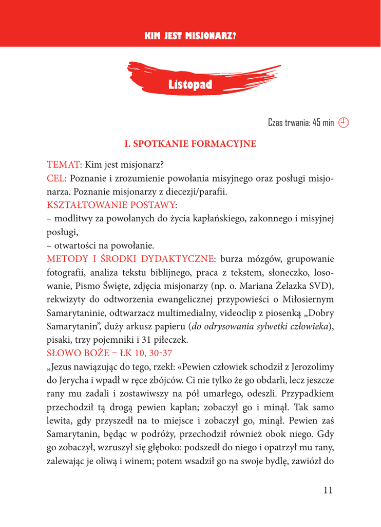 Kim jest misjonarz? Listopad Czas trwania: 45 min I. SPOTKANIE FORMACYJNE Temat: Kim jest misjonarz? Cel: Poznanie i zrozumienie powołania misyjnego oraz posługi misjonarza. Poznanie misjonarzy z diecezji/parafii. Kształtowanie postawy: – modlitwy za powołanych do życia kapłańskiego, zakonnego i misyjnej posługi, – otwartości na powołanie. Metody i środki dydaktyczne: burza mózgów, grupowanie fotografii, analiza tekstu biblijnego, praca z tekstem, słoneczko, losowanie, Pismo Święte, zdjęcia misjonarzy (np. o. Mariana Żelazka SVD), rekwizyty do odtworzenia ewangelicznej przypowieści o Miłosiernym Samarytaninie, odtwarzacz multimedialny, videoclip z piosenką „Dobry Samarytanin”, duży arkusz papieru (do odrysowania sylwetki człowieka), pisaki, trzy pojemniki i 31 piłeczek. Słowo Boże – Łk 10, 30-37 „Jezus nawiązując do tego, rzekł: «Pewien człowiek schodził z Jerozolimy do Jerycha i wpadł w ręce zbójców. Ci nie tylko że go obdarli, lecz jeszcze rany mu zadali i zostawiwszy na pół umarłego, odeszli. Przypadkiem przechodził tą drogą pewien kapłan; zobaczył go i minął. Tak samo lewita, gdy przyszedł na to miejsce i zobaczył go, minął. Pewien zaś Samarytanin, będąc w podróży, przechodził również obok niego. Gdy go zobaczył, wzruszył się głęboko: podszedł do niego i opatrzył mu rany, zalewając je oliwą i winem; potem wsadził go na swoje bydlę, zawiózł do 11 Kim jest misjonarz? gospody i pielęgnował go. Następnego zaś dnia wyjął dwa denary, dał gospodarzowi i rzekł: «Miej o nim staranie, a jeśli co więcej wydasz, ja oddam tobie, gdy będę wracał». Któryż z tych trzech okazał się, według twego zdania, bliźnim tego, który wpadł w ręce zbójców?» On odpowiedział: «Ten, który mu okazał miłosierdzie». Jezus mu rzekł: «Idź, i ty czyń podobnie»”. Postać: o. Marian Żelazek SVD 1. Wprowadzenie Spotkanie rozpoczynamy piosenką Dobry Samarytanin z cyklu Domek na skale (https://www.youtube.com/watch?v=xv5zQU_6dO8) 2. Rozwinięcie a. Rozpoznaję: Ćwiczenie: Zapraszamy dzieci do odegrania biblijnej przypowieści o Miłosiernym Samarytaninie (losujemy role). Podsumowujemy doświadczenie, rozmawiając o towarzyszących im emocjach związanych z rolą, która im przypadła. Następnie wyjaśniamy sens przypowieści z odniesieniem do naszego życia i postawy właściwej misjonarzowi. Samarytanin nie był człowiekiem, który by się kojarzył z moralną doskonałością, a jednak to jego Pan Jezus kazał nam naśladować. Ani pobożność, ani wykształcenie nie będzie Bogu miłe, jeśli w sercu człowieka nie będzie miłosierdzia dla bliźniego. Do których z tych postaci podobny jest misjonarz? Oczywiście, do Samarytanina. A czy znacie misjonarzy, który postępują jak ów ewangeliczny Samarytanin? Ćwiczenie: Z pomocą zdjęć lub filmu prezentujemy postać o. Mariana Żelazka SVD, misjonarza, który pracował wśród trędowatych, lub inną wybraną przez siebie postać misjonarza. Ćwiczenie: Metodą słoneczka dzieci wypisują podobieństwa pracy misjonarza do uczynku Samarytanina z ewangelicznej przypowieści (dostrzega 12 Kim jest misjonarz? potrzebujących, nie jest obojętny na cierpienie, leczy, pociesza, organizuje pomoc, opiekuje się, troszczy się, nie liczy na zarobek lub wdzięczność, poświęca czas, ryzykuje, nie boi się zarazić chorobą, itp.). A w jaki sposób my możemy postępować jak Samarytanin? Czasem wystarczy okazać odrobinę zainteresowania i życzliwości, podać rękę, zatrzymać się przy kimś, porozmawiać, podnieść na duchu. b. Przyjmuję: – W jaki sposób przygotowujecie się do wyjazdu na wycieczkę, kolonie lub w inną podróż? Kto wam w tym pomaga? Kiedy misjonarz wyrusza na misje, musi być do tego dobrze przygotowany. A co ma zabrać ze sobą? Pomóżmy mu spakować walizki. Ćwiczenie – Walizki i kosz. Przygotowujemy 3 pojemniki, kartki z napisami lub numerami na ich oznaczenie oraz piłeczki do rzucania. Na środku stawiamy pojemniki z napisami: 1. Walizka niezbędna, 2.Walizka przydatna i 3. Kosz. W pewnej odległości od nich układamy piłeczki. Odczytujemy jeden wybrany losowo element wyposażenia. Zadaniem dziecka będzie wrzucenie piłki do odpowiedniego pojemnika. Wyposażenie: (1) Biblia, świętość, miłość, znajomość języka, zdrowie, wiedza, dary Ducha Świętego, wsparcie wspólnoty, wytrwałość, pokora, lekarstwa, szacunek, cierpliwość, poczucie humoru, zaradność, (2) książki, gitara, komputer, kompas, zegarek, prawo jazdy, umiejętność gry na gitarze, umiejętność spawania, (3) PlayStation, zabawki, ukochany pies, uprzedzenia, drogie ubrania, ukochane ferrari, zły humor, pretensje. W niezbędniku misjonarza znalazły się przede wszystkim wartości duchowe, zdrowie, wiedza oraz znajomość języków. Jest tam także nasze wsparcie – duchowe i materialne. Bez tego bowiem misjonarz nie mógłby pracować. W walizce „przyda się” znalazły się różnego rodzaju talenty i przedmioty, które dobrze mieć, ale nie są najważniejsze. Natomiast w koszu umieściliśmy rzeczy i cechy niepotrzebne lub takie, które byłyby tylko przeszkodą. Czy coś zaskoczyło was w tym ćwiczeniu? 13 Kim jest misjonarz? c. Dzielę się: Teraz zapraszam was do tańca w rytm piosenki: Chrześcijanin tańczy (głowa, oczy, uszy, ramiona, dłonie, łokcie, kolana, stopy). Mówiliśmy już, że u misjonarza najważniejsza jest jego postawa. Spróbujcie dopasować różne części ciała do postawy, którą misjonarz wyraża podczas pracy misyjnej, np. mądra głowa, pracowite ręce, otwarte ramiona, wierne serce, wytrwałe stopy itp. Głowa – mądra (ma dary Ducha Świętego) Oczy – miłosierne (dostrzega potrzebujących) Uszy – dobrze nastawione (nasłuchuje Ewangelii, dobra w ludziach i napomnień Anioła Stróża) Usta – prawdomówne i pełne szacunku (błogosławi, dziękuje, prosi, przeprasza) Ramiona – o