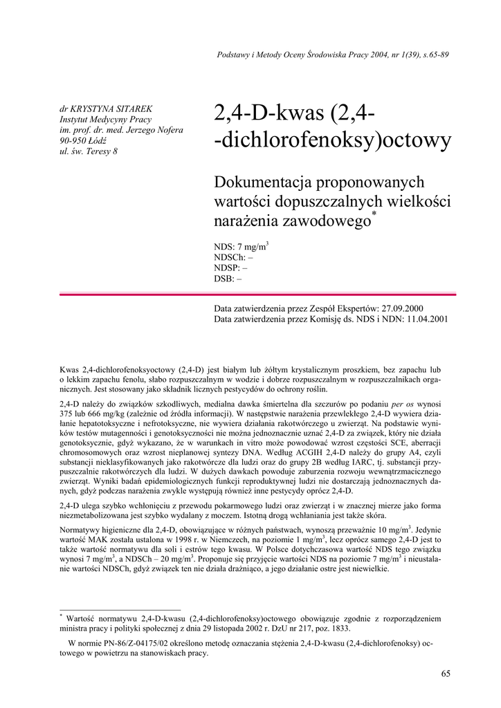 Podstawy i Metody Oceny Środowiska Pracy 2004, nr 1(39), s.65-89 dr KRYSTYNA SITAREK Instytut Medycyny Pracy im. prof. dr. med. Jerzego Nofera 90-950 Łódź ul. św. Teresy 8 2,4-D-kwas (2,4-dichlorofenoksy)octowy Dokumentacja proponowanych wartości dopuszczalnych wielkości narażenia zawodowego* NDS: 7 mg/m3 NDSCh: – NDSP: – DSB: – Data zatwierdzenia przez Zespół Ekspertów: 27.09.2000 Data zatwierdzenia przez Komisję ds. NDS i NDN: 11.04.2001 Kwas 2,4-dichlorofenoksyoctowy (2,4-D) jest białym lub żółtym krystalicznym proszkiem, bez zapachu lub o lekkim zapachu fenolu, słabo rozpuszczalnym w wodzie i dobrze rozpuszczalnym w rozpuszczalnikach organicznych. Jest stosowany jako składnik licznych pestycydów do ochrony roślin. 2,4-D należy do związków szkodliwych, medialna dawka śmiertelna dla szczurów po podaniu per os wynosi 375 lub 666 mg/kg (zależnie od źródła informacji). W następstwie narażenia przewlekłego 2,4-D wywiera działanie hepatotoksyczne i nefrotoksyczne, nie wywiera działania rakotwórczego u zwierząt. Na podstawie wyników testów mutagenności i genotoksyczności nie można jednoznacznie uznać 2,4-D za związek, który nie działa genotoksycznie, gdyż wykazano, że w warunkach in vitro może powodować wzrost częstości SCE, aberracji chromosomowych oraz wzrost nieplanowej syntezy DNA. Według ACGIH 2,4-D należy do grupy A4, czyli substancji nieklasyfikowanych jako rakotwórcze dla ludzi oraz do grupy 2B według IARC, tj. substancji przypuszczalnie rakotwórczych dla ludzi. W dużych dawkach powoduje zaburzenia rozwoju wewnątrzmacicznego zwierząt. Wyniki badań epidemiologicznych funkcji reproduktywnej ludzi nie dostarczają jednoznacznych danych, gdyż podczas narażenia zwykle występują również inne pestycydy oprócz 2,4-D. 2,4-D ulega szybko wchłonięciu z przewodu pokarmowego ludzi oraz zwierząt i w znacznej mierze jako forma niezmetabolizowana jest szybko wydalany z moczem. Istotną drogą wchłaniania jest także skóra. Normatywy higieniczne dla 2,4-D, obowiązujące w różnych państwach, wynoszą przeważnie 10 mg/m3. Jedynie wartość MAK została ustalona w 1998 r. w Niemczech, na poziomie 1 mg/m3, lecz oprócz samego 2,4-D jest to także wartość normatywu dla soli i estrów tego kwasu. W Polsce dotychczasowa wartość NDS tego związku wynosi 7 mg/m3, a NDSCh – 20 mg/m3. Proponuje się przyjęcie wartości NDS na poziomie 7 mg/m3 i nieustalanie wartości NDSCh, gdyż związek ten nie działa drażniąco, a jego działanie ostre jest niewielkie. * Wartość normatywu 2,4-D-kwasu (2,4-dichlorofenoksy)octowego obowiązuje zgodnie z rozporządzeniem ministra pracy i polityki społecznej z dnia 29 listopada 2002 r. DzU nr 217, poz. 1833. W normie PN-86/Z-04175/02 określono metodę oznaczania stężenia 2,4-D-kwasu (2,4-dichlorofenoksy) octowego w powietrzu na stanowiskach pracy. 65 CHARAKTERYSTYKA SUBSTANCJI, ZASTOSOWANIE, NARAŻENIE ZAWODOWE Ogólna charakterystyka substancji (RTECS 1999; WHO 1984): – wzór sumaryczny – wzór strukturalny C8 H6 Cl2 O3 Cl Cl – – – – nazwa wg IUPAC nazwa chemiczna wg CAS numer w rejestrze CAS synonimy i niektóre nazwy preparatów: OCH2CO2H 2,4-dichlorophenoxyacetic acid 2,4-dichlorophenoxyacetic acid, (2,4-D) 94-75-7 acide 2,4-dichloro phenoxyacetique (Francja); acido (2,4-dicloro-fenossi)-acetico (Włochy); Acme LV 4; Agrotect; Amidox; Amoxone; Aqua-Kleen; Barrage; BH 2,4-D; Brush-rhap; B-Selektonon; Chipco turf herbicide „D”; Chloroxone; Citrus fix; Crop rider; 2,4-D (USAACGIH, OSHA); 2,4-D acid; Debroussaillant 600; Deherban; (2,4-dichloor-fenoxy)-azijnzuur (Dania); dichlorophenoxyacetic acid; 2,4-dichlorophenoxyacetic acid; dichlorophenoxyacetic acid (USA – OSHA); 2,4-dichlorphenoxyacetic acid; (2,4-dichlor-phenoxy)-essigsaeure (Niemcy); Dicopur; DMA-4; Dormone; 2,4-dichlorofenoksyoctowy kwas (Polska); Emulsamine BK; Emulsamine E-3; ENT 8,538; Envert 171; Envert DT; Estone; Farmco; Fernimine; Fernoxone; Ferxone; Foredex 75; Hedonal (herbicyd); Herbidal; Hivol-44; Ipaner; kwas 2,4-dichlorofenoksyoctowy (Polska); kyselina 2,4-dichlorofenoxyoctova (Czechy); Lawn-keep; Macrondray; Miracle; Moxone; Netagrone; Netagrone 600; NSC 423; Pennamine; Pennamine D; Phenox; Pielik i Plantgard. Właściwości fizykochemiczne (HSDB 1999): – – – – – – 66 postać zapach masa cząsteczkowa temperatura topnienia temperatura wrzenia masa właściwa biały lub żółty krystaliczny proszek bez zapachu lub z lekkim zapachem fenolu 221,04 138 oC 160 oC (ciśn. 0,53 hPa) 1,416 – rozpuszczalność – prężność par klasyfikacja i znakowanie substancji – numer indeksowy – klasyfikacja substancji – znakowanie substancji słabo rozpuszczalny w wodzie, dobrze rozpuszczalny w rozpuszczalnikach organicznych praktycznie 0 Pa w temp. 20 oC zgodnie z klasyfikacją i znakowaniem wg Unii Europejskiej (Rozporządzenie MZiOS, 1997)** 607-039-00-8 Xn; R22, Xi; R36/37/38; Xn – substancja szkodliwa; Xi – substancja drażniąca; R22 – działa szkodliwie w przypadku spożycia; R36/37/38 – działa drażniąco na oczy, układ oddechowy i skórę Xn, R: 22-36/37/38, S: (2-)36/37. Produkcja, zastosowanie, narażenie zawodowe Kwas 2,4-dichlorofenylooctowy (2,4-D) jest stosowany jako herbicyd od ponad 60 lat; otrzymuje się go na skalę przemysłową w reakcji chlorowania fenolu do 2,4-dichlorofenolu, a następnie reakcji z kwasem monochlorooctowym (HSDB 1999). 2,4-D należy do powszechnie stosowanych herbicydów. Stosowany jest jako składnik bardzo licznych preparatów ochrony roślin. Obecnie jest zarejestrowanych na świecie około 1500 preparatów, zawierających 2,4-D (HSDB 1999). 2,4-D znajduje się w wykazie środków ochrony roślin dopuszczonych do obrotu i stosowania w Polsce (DzU MRiGŹ 1998, nr 4, poz. 6). W naszym kraju używa się ponad 40 preparatów, których składnikiem są sole sodowe, dimetyloaminowe i dietyloaminowe tego kwasu. 2,4-D występuje w formie est