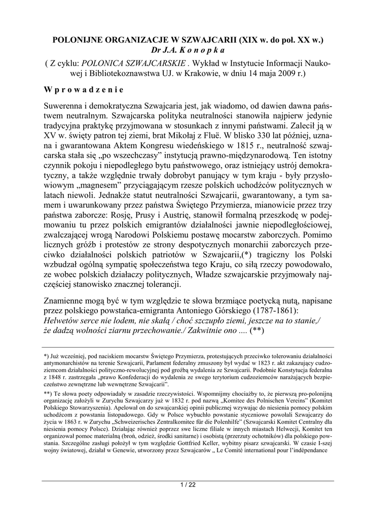 POLONIJNE ORGANIZACJE W SZWAJCARII (XIX w. do poł. XX w.) Dr J.A. K o n o p k a ( Z cyklu: POLONICA SZWAJCARSKIE . Wykład w Instytucie Informacji Naukowej i Bibliotekoznawstwa UJ. w Krakowie, w dniu 14 maja 2009 r.) Wprowadzenie Suwerenna i demokratyczna Szwajcaria jest, jak wiadomo, od dawien dawna państwem neutralnym. Szwajcarska polityka neutralności stanowiła najpierw jedynie tradycyjna praktykę przyjmowana w stosunkach z innymi państwami. Zalecił ją w XV w. święty patron tej ziemi, brat Mikołaj z Fluë. W blisko 330 lat później, uznana i gwarantowana Aktem Kongresu wiedeńskiego w 1815 r., neutralność szwajcarska stała się „po wszechczasy” instytucją prawno-międzynarodową. Ten istotny czynnik pokoju i niepodległego bytu państwowego, oraz istniejący ustrój demokratyczny, a takŜe względnie trwały dobrobyt panujący w tym kraju - były przysłowiowym „magnesem” przyciągającym rzesze polskich uchodźców politycznych w latach niewoli. JednakŜe statut neutralności Szwajcarii, gwarantowany, a tym samem i uwarunkowany przez państwa Świętego Przymierza, mianowicie przez trzy państwa zaborcze: Rosję, Prusy i Austrię, stanowił formalną przeszkodę w podejmowaniu tu przez polskich emigrantów działalności jawnie niepodległościowej, zwalczającej wrogą Narodowi Polskiemu postawę mocarstw zaborczych. Pomimo licznych gróźb i protestów ze strony despotycznych monarchii zaborczych przeciwko działalności polskich patriotów w Szwajcarii,(*) tragiczny los Polski wzbudzał ogólną sympatię społeczeństwa tego Kraju, co siłą rzeczy powodowało, ze wobec polskich działaczy politycznych, Władze szwajcarskie przyjmowały najczęściej stanowisko znacznej tolerancji. Znamienne mogą być w tym względzie te słowa brzmiące poetycką nutą, napisane przez polskiego powstańca-emigranta Antoniego Górskiego (1787-1861): Helwetów serce nie lodem, nie skałą / choć szczupło ziemi, jeszcze na to stanie,/ Ŝe dadzą wolności ziarnu przechowanie./ Zakwitnie ono .... (**) *) JuŜ wcześniej, pod naciskiem mocarstw Świętego Przymierza, protestujących przeciwko tolerowaniu działalności antymonarchistów na terenie Szwajcarii, Parlament federalny zmuszony był wydać w 1823 r. akt zakazujący cudzoziemcom działalności polityczno-rewolucyjnej pod groźbą wydalenia ze Szwajcarii. Podobnie Konstytucja federalna z 1848 r. zastrzegała „prawo Konfederacji do wydalenia ze swego terytorium cudzoziemców naraŜających bezpieczeństwo zewnętrzne lub wewnętrzne Szwajcarii”. **) Te słowa poety odpowiadały w zasadzie rzeczywistości. Wspomnijmy chociaŜby to, Ŝe pierwszą pro-polonijną organizację załoŜyli w Zurychu Szwajcarzy juŜ w 1832 r. pod nazwą „Komitee des Polnischen Vereins” (Komitet Polskiego Stowarzyszenia). Apelował on do szwajcarskiej opinii publicznej wzywając do niesienia pomocy polskim uchodźcom z powstania listopadowego. Gdy w Polsce wybuchło powstanie styczniowe powołali Szwajcarzy do Ŝycia w 1863 r. w Zurychu „Schweizerisches Zentralkomitee für die Polenhilfe” (Szwajcarski Komitet Centralny dla niesienia pomocy Polsce). Działając równieŜ poprzez swe liczne filiale w innych miastach Helwecji, Komitet ten organizował pomoc materialną (broń, odzieŜ, środki sanitarne) i osobistą (przerzuty ochotników) dla polskiego powstania. Szczególne zasługi połoŜył w tym względzie Gottfried Keller, wybitny pisarz szwajcarski. W czasie I-szej wojny światowej, działał w Genewie, utworzony przez Szwajcarów „ Le Comité international pour l’indépendance 1 / 22 I. C z ę ś ć o g ó l n a W omawianym tu okresie, a w szczególności na przestrzeni 117 lat tj. od roku 1833 do roku 1950 włącznie, moŜna by naliczyć sto kilkadziesiąt róŜnych organizacji polonijnych utworzonych przez polskich emigrantów na terenie Szwajcarii. Trudno tu byłoby mówić bliŜej o wszystkich, zarówno z braku czasu, jak i - w wielu wypadkach – wskutek braku dziś szczegółowej dokumentacji archiwalnej. Ponadto wspomnieć naleŜy, Ŝe niekiedy organizacje polityczne zatajały swe istnienie, a przynajmniej swe rzeczywiste programy walki narodowo-wyzwoleńczej, czy klasowo-rewolucyjnej, co równieŜ utrudnia znalezienie pełnych materiałów dokumentacyjnych. Niekiedy teŜ chodziło jedynie o formę akcji polityczno-publicystycznej (np. wydawanie odezw, czy czasopism) kierowanej przez odpowiednie organizacje zagraniczne ( mające zazwyczaj swe siedziby we Francji, Anglii, lub w Polsce). Motorem tworzenia na terenie Szwajcarii polonijnych organizacji o profilu politycznym była sytuacja istniejąca w Polsce i na arenie międzynarodowej. Ruch ten wzmagał się lub malał zaleŜnie od okoliczności. Znamionowały go okresowe „pulsacje” związane z powstaniami narodowymi w XIX w. i z innymi wydarzeniami o znaczeniu międzynarodowym lub narodowym, jak wojny angaŜujące jedno lub więcej z mocarstw zaborczych, wewnętrzne ruchy rewolucyjne w tych państwach, potrzeba odbudowy Ojczyzny po I-wszej wojnie światowej, lata okupacji hitlerowskiej, wreszcie początkowy okres powojennego reŜimu socjalistycznego. Równolegle kształtowało się oblicze doktrynalne ruchu organizacyjnego w wyniku wzmagającej się (od drugiej polowy XIX w.) konfrontacji ideologicznych w kwestiach narodowych, politycznych i społecznych, co związane było z napływem do Szwajcarii działaczy ugrupowań proletariackich odrzucających idee walk wyzwoleńczych na rzecz dąŜenia do obalenia istniejącego ustroju społecznego w drodze rewolucji. ZaleŜnie od sytuacji zewnętrznej i potrzeb miejscowych emigracji rosły lub zmniejszały się liczebnie polonijne organizacje. Na ogól cechowała ich względna nietrwałość, efemeryczność w poszczególnych wypadkach, ale ogólnie biorąc znaczna dynamiczność; jedne znikały, inne powstawały; nierzadko organizacje odradzały się pod inną nazwą, ale przejmowały program i formę poprzednich, k