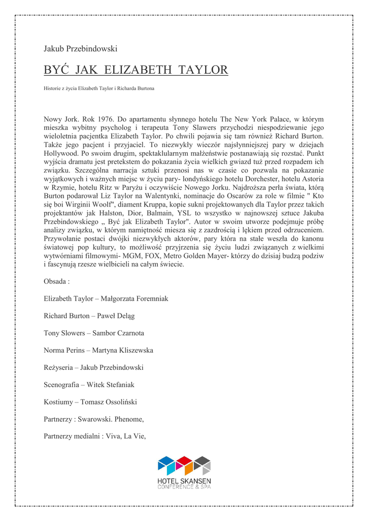Jakub Przebindowski BYĆ JAK ELIZABETH TAYLOR Historie z życia Elizabeth Taylor i Richarda Burtona Nowy Jork. Rok 1976. Do apartamentu słynnego hotelu The New York Palace, w którym mieszka wybitny psycholog i terapeuta Tony Slawers przychodzi niespodziewanie jego wieloletnia pacjentka Elizabeth Taylor. Po chwili pojawia się tam również Richard Burton. Także jego pacjent i przyjaciel. To niezwykły wieczór najsłynniejszej pary w dziejach Hollywood. Po swoim drugim, spektaklularnym małżeństwie postanawiają się rozstać. Punkt wyjścia dramatu jest pretekstem do pokazania życia wielkich gwiazd tuż przed rozpadem ich związku. Szczególna narracja sztuki przenosi nas w czasie co pozwala na pokazanie wyjątkowych i ważnych miejsc w życiu pary- londyńskiego hotelu Dorchester, hotelu Astoria w Rzymie, hotelu Ritz w Paryżu i oczywiście Nowego Jorku. Najdroższa perła świata, którą Burton podarował Liz Taylor na Walentynki, nominacje do Oscarów za role w filmie " Kto się boi Wirginii Woolf", diament Kruppa, kopie sukni projektowanych dla Taylor przez takich projektantów jak Halston, Dior, Balmain, YSL to wszystko w najnowszej sztuce Jakuba Przebindowskiego „ Być jak Elizabeth Taylor". Autor w swoim utworze podejmuje próbę analizy związku, w którym namiętność miesza się z zazdrością i lękiem przed odrzuceniem. Przywołanie postaci dwójki niezwykłych aktorów, pary która na stałe weszła do kanonu światowej pop kultury, to możliwość przyjrzenia się życiu ludzi związanych z wielkimi wytwórniami filmowymi- MGM, FOX, Metro Golden Mayer- którzy do dzisiaj budzą podziw i fascynują rzesze wielbicieli na całym świecie. Obsada : Elizabeth Taylor – Małgorzata Foremniak Richard Burton – Paweł Deląg Tony Slowers – Sambor Czarnota Norma Perins – Martyna Kliszewska Reżyseria – Jakub Przebindowski Scenografia – Witek Stefaniak Kostiumy – Tomasz Ossoliński Partnerzy : Swarowski. Phenome, Partnerzy medialni : Viva, La Vie,