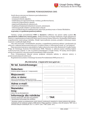 Urz¹d Gminy Wilga ul. Warszawska 38; 08-470 Wilga GMINNE POWIADOMIENIA SMS Je¿eli chcesz otrzymywaæ darmowe powiadomienia o: - zebraniach wiejskich, - terminach zbiórek odpadów, - nadchodz¹cych zagro¿eniach (np. wichury, gwa³towne burze), - wa¿nych wydarzeniach w gminie, - imprezach kulturalnych i sportowych, - bezp³atnych badaniach lekarskich, kursach, szkoleniach, - informacjach dla rolników i producentów rolnych - oraz wszelkich innych wiadomoœciach, które by³y przekazywane w formie Okólników, to prosimy o wype³nienie poni¿szej ankiety. Gminny system powiadomieñ SMS to darmowy (odbiorca nie ponosi op³at) system dla mieszkañców (odbiorców) naszej gminy, dziæki któremu na bieýàco bædziemy mogli informowaã Pañstwa o najistotniejszych sprawach dotyczàcych naszej Gminy/So³ectwa. Komunikat SMS bædzie uzupeùnieniem tradycyjnego okólnika. Dziæki wprowadzeniu systemu, przepùyw informacji stanie siæ prosty i szybki jak nigdy dotàd. Aby móc korzystaã z komunikatów prosimy o uzupeùnienie poniýszej ankiety i przekazanie jej soùtysowi, radnemu lub pozostawienie jej w Urzêdzie Gminy w Sekretariacie (pok. nr 1 na I piêtrze). Dane pozostawione przez mieszkañców bêd¹ wykorzystywane tylko dla potrzeb Urzêdu Gminy Wilga do Gminnego Systemu Powiadomiania SMS. Wpisany w ankiecie numer telefonu bêdzie wykorzystywany jedynie w celu wysy³ania komunikatów Urzêdu Gminy. W ka¿dej chwili bêdzie mo¿na zrezygnowaæ z otrzymywania komunikatów SMS od urzêdu. Poza wymienionymi danymi proszê podpisaæ niniejsz¹ ankietê w zakresie ustawy o przetwarzaniu danych osobowych. Regulamin korzystania z Gminnego Systemu Powiadamiania SMS jest na str. 2. Ankieta rejestracyjna: Nr tel. komórkowego: So³ectwo: (mo¿na wpisaæ wiêcej ni¿ 1 miejscowoœæ) Miejscowoœæ: ulica; nr domu: (dane nie s¹ obowi¹zkowe, mog¹ byæ pomocne przy indywidualnych komunikatach, np. dotycz¹cych op³at za œmieci ) Adres e-mail: (dane nie s¹ obowi¹zkowe) Nazwisko: Imiê: (dane nie s¹ obowi¹zkowe) Informacje dla rolników (proszê zaznaczyæ TAK jeœli chc¹ pañstwo otrzymywaæ komunikaty dla rolników) TAK Wyraýam zgodæ na przetwarzanie moich danych osobowych zawartych w danej ankiecie dla potrzeb niezbædnych do realizacji systemu SMS Gminy Wilga (zgodnie z Ustawà z dnia 29 sierpnia 1997 roku o ochronie danych osobowych, Dz. U. z 2014 r. poz. 1182 z poŸn. zm.). data, podpis REGULAMIN KORZYSTANIA Z GMINNEGO SYSTEMU POWIADAMIANIA SMS GMINY WILGA § 1 Postanowienia wstêpne 1. Niniejszy regulamin (zwany dalej „Regulaminem”) okreœla zasady korzystania z Gminnego Systemu Powiadamiania SMS Gminy Wilga (zwanego dalej „Systemem”). 2. Us³uga powiadamiania SMS jest œwiadczona przez Gminê Wilga (zwany dalej „Urzêdem”). 3. U¿ytkownikiem Systemu jest ka¿da osoba fizyczna (zwana dalej „U¿ytkownikiem”), która dokona³a prawid³owej rejestracji zgodnie z § 2 ust. 2 niniejszego Regulaminu, wyra¿aj¹c tym samym zgodê na zastosowanie wszystkich postanowieñ Regulaminu oraz otrzymywanie informacji w postaci wiadomoœci SMS na telefony komórkowe lub w formie g³osowej na telefony stacjonarne o treœci ustalonej przez Urz¹d. § 2 Zasady korzystania z Systemu 1. Us³uga powiadomieñ SMS umo¿liwia otrzymywanie informacji w postaci bezp³atnych wiadomoœci SMS na telefony komórkowe oraz bezp³atnych komunikatów g³osowych na telefony stacjonarne dla U¿ytkowników, którzy dokonali prawid³owej rejestracji do Systemu. 2. Ka¿da osoba, bêd¹ca u¿ytkownikiem sieci komórkowej w standardzie GSM lub telefonu stacjonarnego, mo¿e dokonaæ rejestracji w Systemie poprzez: 1) prawid³owe wype³nienie papierowej ankiety rejestracyjnej, dostêpnej w Urzêdzie i z³o¿enie jej w sekretariacie Urzêdu Gminy Wilga (pokój nr 1); 2) wype³nion¹ ankietê rejestracyjn¹ mo¿na przekazaæ równie¿ so³tysowi. 3. Prawid³owa rejestracja w systemie powiadamiania SMS jest potwierdzona przes³aniem przez System powitalnej wiadomoœci SMS do U¿ytkownika. 4. U¿ytkownik mo¿e w dowolnym momencie zrezygnowaæ z korzystania z powiadomieñ SMS dokonuj¹c wyrejestrowania siê z Systemu poprzez: 1) wype³nienie formularza dostêpnego na stronie www Urzêdu, 2) wype³nienie papierowego formularza, dostêpnego w Urzêdzie. 5. Prawid³owe wyrejestrowanie z systemu potwierdzone jest komunikatem SMS wys³anym do U¿ytkownika. 6. U¿ytkownik nie ponosi ¿adnych kosztów z tytu³u otrzymywania wiadomoœci wys³anych przez Urz¹d. § 3 Komunikaty SMS 1. W ramach systemu powiadamiania SMS Urz¹d zobowi¹zuje siê przekazywaæ U¿ytkownikom na ich telefony komórkowe b¹dŸ stacjonarne wiadomoœci SMS zawieraj¹ce wybrane treœci w nastêpuj¹cych obszarach tematycznych: 1) Informacje alarmowe i kryzysowe o zagro¿eniach, które mog¹ wystêpowaæ na terenie gminy. Treœci tego typu rozsy³ane s¹ do wszystkich zarejestrowanych U¿ytkowników bez wzglêdu na grupê tematyczn¹, do której zapisali siê podczas procesu rejestracji (w przypadku utworzenia grup tematycznych przez Urz¹d); 2) Informacje o utrudnieniach, które mog¹ istotnie dezorganizowaæ sytuacjê w regionie; 3) Informacje promuj¹ce dzia³alnoœæ Urzêdu oraz jego s³u¿b wœród spo³ecznoœci lokalnej np. wiadomoœci dotycz¹ce wydarzeñ sportowych oraz kulturalnych organizowanych b¹dŸ wspieranych przez Urz¹d lub odbywaj¹cych siê na jego terenie; 4) Informacje o bie¿¹cych sprawach zwi¹zanych z dzia³alnoœci¹ Urzêdu. 2. Urz¹d Gminy Wilga zobowi¹zuje siê do przesy³ania wiadomoœci SMS oraz wiadomoœci g³osowych jedynie do U¿ytkowników, którzy poprzez rejestracjê do systemu wyrazili zgodê na ich otrzymywanie oraz o tematyce dotycz¹cej Urzêdu. § 4 Postanowienia koñcowe 1. Korzystanie z Systemu jest równoznaczne z wyra¿eniem zgody przez U¿ytkownika na przetwarzanie jego danych osobowych przez Urz¹d na potrzeby korzystania z Systemu zgodnie z ustaw¹ z dnia 29 sierpnia 1997 r. o ochronie danych osobowyc