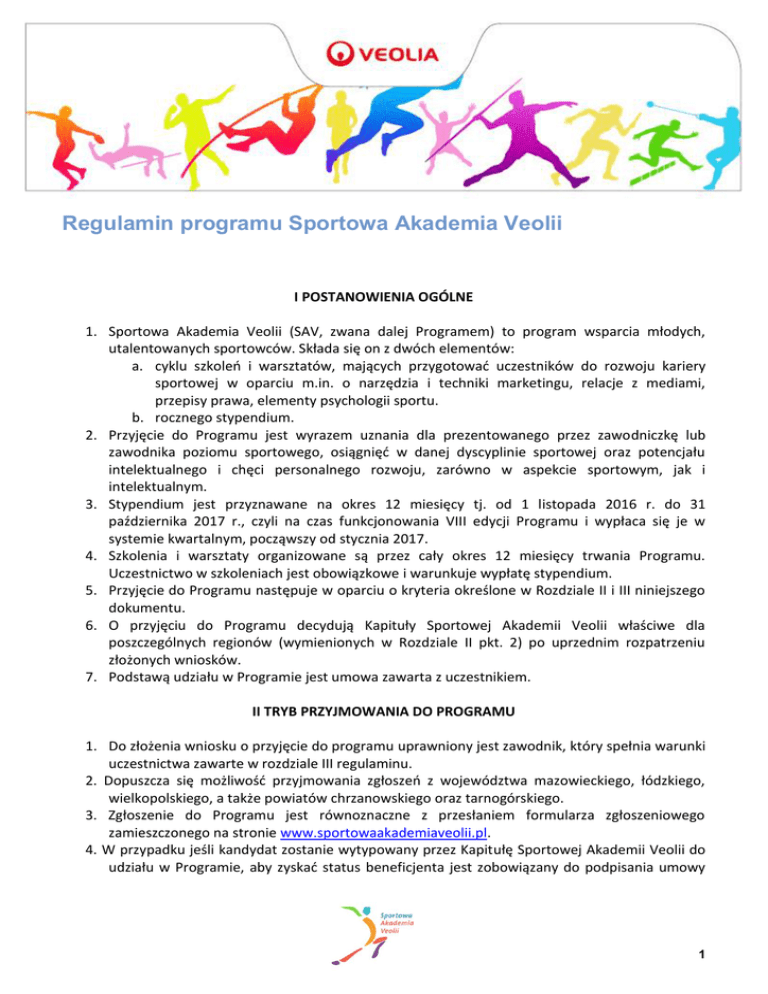 Regulamin programu Sportowa Akademia Veolii I POSTANOWIENIA OGÓLNE 1. Sportowa Akademia Veolii (SAV, zwana dalej Programem) to program wsparcia młodych, utalentowanych sportowców. Składa się on z dwóch elementów: a. cyklu szkoleo i warsztatów, mających przygotowad uczestników do rozwoju kariery sportowej w oparciu m.in. o narzędzia i techniki marketingu, relacje z mediami, przepisy prawa, elementy psychologii sportu. b. rocznego stypendium. 2. Przyjęcie do Programu jest wyrazem uznania dla prezentowanego przez zawodniczkę lub zawodnika poziomu sportowego, osiągnięd w danej dyscyplinie sportowej oraz potencjału intelektualnego i chęci personalnego rozwoju, zarówno w aspekcie sportowym, jak i intelektualnym. 3. Stypendium jest przyznawane na okres 12 miesięcy tj. od 1 listopada 2016 r. do 31 października 2017 r., czyli na czas funkcjonowania VIII edycji Programu i wypłaca się je w systemie kwartalnym, począwszy od stycznia 2017. 4. Szkolenia i warsztaty organizowane są przez cały okres 12 miesięcy trwania Programu. Uczestnictwo w szkoleniach jest obowiązkowe i warunkuje wypłatę stypendium. 5. Przyjęcie do Programu następuje w oparciu o kryteria określone w Rozdziale II i III niniejszego dokumentu. 6. O przyjęciu do Programu decydują Kapituły Sportowej Akademii Veolii właściwe dla poszczególnych regionów (wymienionych w Rozdziale II pkt. 2) po uprzednim rozpatrzeniu złożonych wniosków. 7. Podstawą udziału w Programie jest umowa zawarta z uczestnikiem. II TRYB PRZYJMOWANIA DO PROGRAMU 1. Do złożenia wniosku o przyjęcie do programu uprawniony jest zawodnik, który spełnia warunki uczestnictwa zawarte w rozdziale III regulaminu. 2. Dopuszcza się możliwośd przyjmowania zgłoszeo z województwa mazowieckiego, łódzkiego, wielkopolskiego, a także powiatów chrzanowskiego oraz tarnogórskiego. 3. Zgłoszenie do Programu jest równoznaczne z przesłaniem formularza zgłoszeniowego zamieszczonego na stronie www.sportowaakademiaveolii.pl. 4. W przypadku jeśli kandydat zostanie wytypowany przez Kapitułę Sportowej Akademii Veolii do udziału w Programie, aby zyskad status beneficjenta jest zobowiązany do podpisania umowy 1 uczestnictwa w Programie, która obliguje go do uczęszczania na zajęcia organizowane w ramach Programu. 2. Wytypowanie kandydatów na uczestników Programu ma miejsce podczas zebrania Kapituły Sportowej Akademii Veolii w każdym z regionów, które biorą udział w programie (wymienionych w Rozdziale II pkt. 2). W skład każdej Kapituły wchodzą: przedstawiciele Partnerów (Urzędy Miast i media patronackie) oraz przedstawiciele Organizatorów (Veolii i Star PR). 3. Kapituła stosownym porozumieniem (większośd głosów) wybiera od trzech do sześciu kandydatów z każdego regionu: a. 6 (sześciu) kandydatów z województwa mazowieckiego, b. 5 (pięciu) kandydatów z województwa wielkopolskiego, c. 4 (czterech) kandydatów z województwa łódzkiego d. 3 (trzech) kandydatów z powiatu chrzanowskiego, e. 3 (trzech) kandydatów z powiatu tarnogórskiego oraz umieszcza w każdym z regionów po trzech pozostałych na liście rezerwowej. III WARUNKI UCZESTNICTWA W PROGRAMIE 1. O udział w Programie mogą się ubiegad zawodniczki i zawodnicy, którzy: a. reprezentują barwy klubu sportowego, stowarzyszenia kultury fizycznej, spełniający warunki zawarte w rozdziale II pkt. 2, b. są urodzeni w latach 1998-2002 (pomiędzy 1.01.1998 a 31.12.2002), c. reprezentują dyscyplinę niezespołową, olimpijską. 2. O uczestnictwo w Programie mogą się ubiegad osoby, które od 1.01.2016, spełniły przynajmniej jedno z następujących kryteriów sportowych: a. zajęły miejsce 1-16 w Mistrzostwach Świata kadetów, juniorów lub młodzieżowców, b. zajęły miejsce 1-8 w Mistrzostwach Europy kadetów, juniorów lub młodzieżowców, c. zajęły miejsca 1-8 w Pucharach Europy lub Świata w kategorii kadetów, juniorów lub młodzieżowców, d. zostały zakwalifikowane decyzją właściwego związku sportowego do kadry narodowej kadetów, juniorów, młodzieżowców lub seniorów, e. ustanowiły, potwierdzony przez właściwy związek sportowy, rekord Polski, Europy lub świata w kategorii juniorów, młodzieżowców lub seniorów, f. zajęły miejsca 1-3 we współzawodnictwie sportowym osób niepełnosprawnych na Mistrzostwach Świata, Europy lub Pucharach Świata, Europy w konkurencjach, w których brało udział co najmniej 6 zawodników lub 6 drużyn, osad, załóg w danej rywalizacji sportowej, g. osiągnęły wysoki wynik sportowy o niewymiernym charakterze lub zajęły wysokie miejsca w prestiżowej, międzynarodowej imprezie sportowej (niewymienionej w pkt. af) h. oraz osiągają dobre wyniki w nauce. 2 3. Wyniki wymienione w pkt. a–g winny byd potwierdzone przez właściwy związek sportowy, najpóźniej na etapie podpisania umowy uczestnictwa w Programie. 4. W Programie nie mogą brad udziału kandydaci, którzy byli beneficjentami Programu w poprzednich edycjach. IV OBOWIĄZKI BENEFICJENTA SPORTOWEJ AKADEMII VEOLII 1. Po zaakceptowaniu kandydatury beneficjent zobowiązany będzie do podpisania umowy, definiującej jego obowiązki, przede wszystkim: a. uczęszczania na zajęcia prowadzone w ramach Sportowej Akademii Veolii, b. przestrzegania ogólnych zasad moralnych i sportowego trybu życia, c. udzielenia bezterminowego prawa do wykorzystania wizerunku przez Sportową Akademię Veolii w działaniach promocyjnych, d. promocji logotypu Sportowej Akademii Veolii w zakresie, formie i treści uzgodnionej z Organizatorem Programu oraz zawartej w umowie. V ROZWIĄZANIE UMOWY UCZESTNICTWA W PROGRAMIE 1. Beneficjenci programu są zobowiązani do udziału w zajęciach organizowanych przez Sportową Akademię Veolii. Obecnośd jest weryfikowana przez organizatorów programu w cyklach trzymiesięcznych. W przypadku obecności na mniej niż 50% zajęd wobec danego beneficjenta wyciągane są następujące konsekwencje: a. Pisemne upom