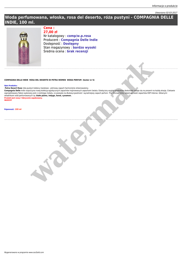 Informacje o produkcie Utworzono 02-03-2017 Woda perfumowana, włoska, rosa del deserto, róża pustyni - COMPAGNIA DELLE INDIE, 100 ml. Cena : 27,00 zł er m ar k Nr katalogowy : comp/w.p.rosa Producent : Compagnia Delle Indie Dostępność : Dostępny Stan magazynowy : bardzo wysoki Średnia ocena : brak recenzji COMPAGNIA DELLE INDIE ROSA DEL DESERTO DI PETRA WOMEN WODA PERFUM (tester nr 5) Opis Produktu: Petra Desert Rose róża pustyni kobiecy kwiatowo - piżmowy zapach harmonijnie zrównoważony. Compagnia Delle Indie rozpoczyna nową kolekcję egzotycznych zapachów inspirowanych zapachami świata. Estetyczny wygląd produktów doskonale nadaje się na prezent na każdą okazję. Ciekawie zaprojektowany flakon wykonany jest z cienkiego metalu, co pozwala na dłuższą żywotność i wyraźniejszy zapach perfum. The Silkroad który obejmuje sześć zapachów EDP Intense. Głównymi składnikami wód perfumowanych są: białe piżmo, indygo, koral, cynamon. Produkt jest nowy i fabrycznie zapakowany. WŁOCHY w at Pojemność: 100 ml Wygenerowano w programie www.oscGold.com