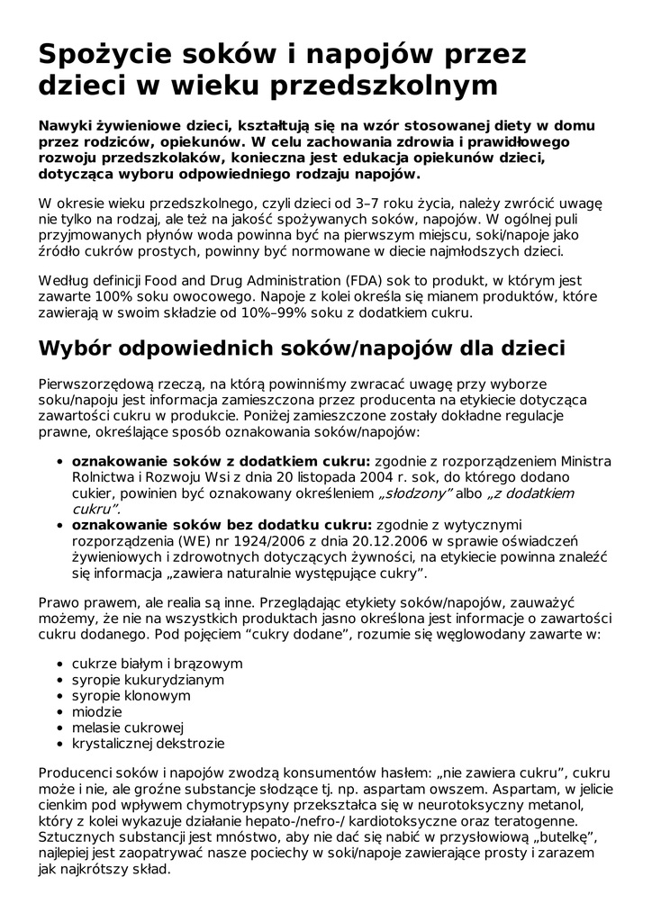 Spożycie soków i napojów przez dzieci w wieku przedszkolnym Nawyki żywieniowe dzieci, kształtują się na wzór stosowanej diety w domu przez rodziców, opiekunów. W celu zachowania zdrowia i prawidłowego rozwoju przedszkolaków, konieczna jest edukacja opiekunów dzieci, dotycząca wyboru odpowiedniego rodzaju napojów. W okresie wieku przedszkolnego, czyli dzieci od 3–7 roku życia, należy zwrócić uwagę nie tylko na rodzaj, ale też na jakość spożywanych soków, napojów. W ogólnej puli przyjmowanych płynów woda powinna być na pierwszym miejscu, soki/napoje jako źródło cukrów prostych, powinny być normowane w diecie najmłodszych dzieci. Według definicji Food and Drug Administration (FDA) sok to produkt, w którym jest zawarte 100% soku owocowego. Napoje z kolei określa się mianem produktów, które zawierają w swoim składzie od 10%–99% soku z dodatkiem cukru. Wybór odpowiednich soków/napojów dla dzieci Pierwszorzędową rzeczą, na którą powinniśmy zwracać uwagę przy wyborze soku/napoju jest informacja zamieszczona przez producenta na etykiecie dotycząca zawartości cukru w produkcie. Poniżej zamieszczone zostały dokładne regulacje prawne, określające sposób oznakowania soków/napojów: oznakowanie soków z dodatkiem cukru: zgodnie z rozporządzeniem Ministra Rolnictwa i Rozwoju Wsi z dnia 20 listopada 2004 r. sok, do którego dodano cukier, powinien być oznakowany określeniem „słodzony” albo „z dodatkiem cukru”. oznakowanie soków bez dodatku cukru: zgodnie z wytycznymi rozporządzenia (WE) nr 1924/2006 z dnia 20.12.2006 w sprawie oświadczeń żywieniowych i zdrowotnych dotyczących żywności, na etykiecie powinna znaleźć się informacja „zawiera naturalnie występujące cukry”. Prawo prawem, ale realia są inne. Przeglądając etykiety soków/napojów, zauważyć możemy, że nie na wszystkich produktach jasno określona jest informacje o zawartości cukru dodanego. Pod pojęciem “cukry dodane”, rozumie się węglowodany zawarte w: cukrze białym i brązowym syropie kukurydzianym syropie klonowym miodzie melasie cukrowej krystalicznej dekstrozie Producenci soków i napojów zwodzą konsumentów hasłem: „nie zawiera cukru”, cukru może i nie, ale groźne substancje słodzące tj. np. aspartam owszem. Aspartam, w jelicie cienkim pod wpływem chymotrypsyny przekształca się w neurotoksyczny metanol, który z kolei wykazuje działanie hepato-/nefro-/ kardiotoksyczne oraz teratogenne. Sztucznych substancji jest mnóstwo, aby nie dać się nabić w przysłowiową „butelkę”, najlepiej jest zaopatrywać nasze pociechy w soki/napoje zawierające prosty i zarazem jak najkrótszy skład. Przykład: Na powyższym zdjęciu widzimy, że sok nie zawiera żadnych substancji dodatkowych. Zawartość cukru w napoju wynosi 9,3g/100ml, są to cukry naturalnie występujące w produkcie, tj.: sacharoza, fruktoza, glukoza, sorbitol. Soki jako źródło cukrów, powinny być normowane w diecie dzieci. Dlaczego tak ważne jest ograniczanie cukru w diecie małego dziecka? Cukier czyli sacharoza to węglowodan powszechnie używany do słodzenia potraw, jest produktem wysokoenergetycznym zawierającym 405 kcal/100 g surowca. Dzienna podaż cukru w diecie nie powinna przekraczać 10% dobowego zapotrzebowania energetycznego. Każda nadwyżka cukru sprzyja m.in. zwiększeniu masy ciała oraz wzroście prawdopodobieństwa zachorowania w przyszłości na cukrzycę typu 2 lub choroby układu krążenia. Soki i napoje zalecenia i przeciwwskazania Soki i napoje wykonane z owoców, zawierają przeciwutleniacze tj. polifenole (np. antocyjany), flawonole, flawanole, kwasy fenolowe, witaminę C i karotenoidy. Sokiem najbogatszym w witaminę C jest sok z aceroli. Na skład chemiczny owoców, warzyw wpływają: czynniki genetyczne i środowiskowe, odmiana surowca, warunki klimatyczne i agrotechniczne, stopień dojrzałości, miejsce przechowywania. Większa ilość związków fenolowych w owocach znajduje się w skórce i zewnętrznych częściach owocu niż w jego wnętrzu. Przeciwutleniacze mają działanie: przeciwzapalne, przeciwnowotworowe, przeciwalergicznie. Soki i napoje dostarczają również dużych ilości potasu, manganu i umiarkowanej ilości kwasu foliowego, magnezu. Płyny te, ze względu na przewagę składników mineralnych tj.: sód, potas, wapń, magnez, żelazo, przesuwają równowagę kwasowo-zasadową w kierunku zasadowym. Soki i napoje są dobrym źródłem biologicznie aktywnych związków, można je stosować w walce z różnymi chorobami np. sok z malin ma działanie napotne i zaleca się go podawać dzieciom w czasie gorączki lub prewencyjnie, by zapobiec infekcji. Spośród szerokiej gamy zaleceń, istnieją również przeciwwskazania do picia soków i napojów przez dzieci, są nimi przykładowo: zaburzenia odżywiania tj. niedożywienie bądź nadwaga i otyłość, zaburzenia w czynnościach przewodu pokarmowego: przewlekła biegunka, nadmierna ilości oddawanych gazów, ból brzucha, próchnica zębów – ilość spożywanych soków powinna być dokładnie określona przez lekarza bądź dietetyka. Sok kojarzony jest ze zdrowiem, niejednokrotnie w czasie odwiedzin małych dzieci w szpitalu, zdarza się im dawać w „prezencie” słodki soczek bądź napój. Takie postępowanie zaostrza istniejące już biegunki (na które choruje masa dzieci) i ze zdrowiem nie ma nic wspólnego. Soki niepasteryzowane Komercyjne, niepasteryzowane soki, zwane również sokami jednodniowymi nie są zalecane do spożycia dla dzieci w wieku przedszkolnym. Mogą być one zanieczyszczone patogenną florą bakteryjną tj. np. pałeczką okrężnicy (z łac. Escherichia coli). Zakażenie E. coli najczęściej kończy się zatruciem pokarmowych, z tego powodu zaleca się dla dzieci soki pasteryzowane. Inaczej postrzega się ręcznie wykonane soki, które wykonuje się dla dzieci z owoców, warzyw wiadomego pochodzenia i po uprzednim dok