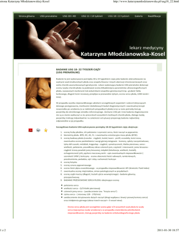 strona Katarzyny Młodzianowskiej-Kosel 1z2 http://www.katarzynamlodzianowska.pl/usg18_22.html BADANIE USG 18- 22 TYDZIEŃ CIĄŻY (USG PRENATALNE) Badanie to jest wykonywane pomiędzy 18 a 22 tygodniem ciąży jako badanie ukierunkowane na wykrycie wad strukturalnych płodu oraz zespołu Downa i innych aberracji chromosomowych oraz wielu chorób uwarunkowanych genetycznie. Lekarz wykonujący badanie USG prenetalne dokonuje oceny ryzyka chorób płodu na podstawie oceny kilkudziesięciu parametrów ultrasonograficznych płodu, nazywanych markerami lub wskaźnikami zespołów genetycznych (np.: grubość fałdu karkowego, długość kości nosowej, przepływ w przewodzie żylnym, ocena serca płodu, UKM nerek i inne). W przypadku wyniku nieprawidłowego udzielam szczegółowych wyjaśnień i zaleceń dotyczących dalszego postępowania, możliwości dodatkowych badań diagnostycznych i ewentualnej terapii noworodka po urodzeniu (a w niektórych przypadkach płodu) oraz w razie potrzeby kieruję pacjentkę do określonego ośrodka referencyjnego. Zarówno USG jak i inne badania diagnostycznie nie są w stanie wykluczyć w stu procentach wszystkich możliwych chorób płodu, dlatego każdą pacjentkę traktuję indywidualnie i w zależności od sytuacji proponuję badania najbardziej odpowiednie w jej przypadku. Szczegółowo badanie USG wykonywane pomiędzy 18-22 tygodniem ciąży obejmuje: 1. ocenę liczby płodów, ich położenia i czynności serca, ilości naczyń w pępowinie. 2. biometrię płodu. BPD, HC, AC, FL + ewentualna orientacyjna masa płodu (EFW). 3. ocenę budowy płodu (czaszka - ciągłość, kształ, twarz - profil, oczodoły, kości nosa, ewentualna ocena podniebienia i wargi górnej,mózgowie - komory, sploty naczyniówkowe, tylny dół czaszki, móżdżek, kręgosłup - ciągłość, symetryczność, klatka piersiowa, serce wielkość, położenie, prawidłowy obraz czterech jam, częstość i miarowość, jama brzuszna ciągłość ściany powłoki jamy brzusznej, żołądek (lokalizacja, wielkość, kształt), echogeniczność jelit, pęcherz moczowy,nerki - opis ewentualnych nieprawidłowości ( szerokość UKM ), kończyny - ocena obecności kości udowych, ramieniowych, przedramienia, podudzia, rąk i stóp, ruchomość kończyn 4. ocenę łożyska 5. ocenę sznura pępowinowego 6. ocena ilości płynu owodniowego - w przypadku nieprawidłowości AFI (Amniotic Fluid Index) 7. ewentualna ocenę mięśniaków, zmian patologicznych w przydatkach 8. ocenę szyjki macicy (długość, kształt ujścia wewnętrznego) - badanie głowicą przezpochwową 9. BADANIE PRZESIEWOWE SERCA PŁODU obejmujące ocenę: położenia serca wielkości serca - (1/3 klatki piersiowej) czterech jamy serca - (uwidocznienie tzw. "krzyża serca") rytmu serca - ( miarowy 120 - 170/min) uwidocznienie skrzyżowania dużych naczyń (drogi wypływu z lewej i prawej komory serca) oraz śródpiersia górnego (obraz trzech naczyń = 3 vessel view). Ocena serca płodu jest szczególnie ważna gdyż 1/3 wszystkich wad płodu to wady serca (najczęstsza wada wrodzona) a w przypadku stwierdzenia jakichkolwiek nieprawidłowości, kieruję pacjentkę na badanie echokardiograficznego płodu 2011-01-30 18:57 strona Katarzyny Młodzianowskiej-Kosel 2z2 http://www.katarzynamlodzianowska.pl/usg18_22.html 2011-01-30 18:57