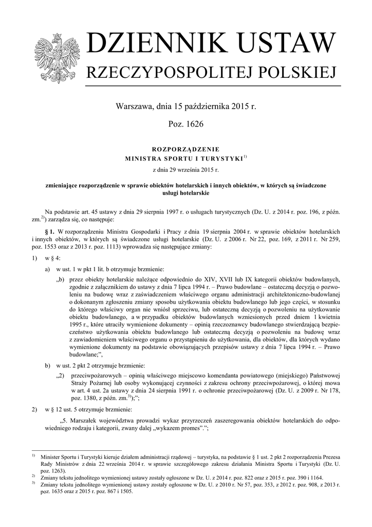 DZIENNIK USTAW RZECZYPOSPOLITEJ POLSKIEJ Warszawa, dnia 15 października 2015 r. Poz. 1626 RO ZPO R ZĄ D ZE N I E M INI S TR A SPO R T U I TU RY S T YK I 1) z dnia 29 września 2015 r. zmieniające rozporządzenie w sprawie obiektów hotelarskich i innych obiektów, w których są świadczone usługi hotelarskie Na podstawie art. 45 ustawy z dnia 29 sierpnia 1997 r. o usługach turystycznych (Dz. U. z 2014 r. poz. 196, z późn. zm.2)) zarządza się, co następuje: § 1. W rozporządzeniu Ministra Gospodarki i Pracy z dnia 19 sierpnia 2004 r. w sprawie obiektów hotelarskich i innych obiektów, w których są świadczone usługi hotelarskie (Dz. U. z 2006 r. Nr 22, poz. 169, z 2011 r. Nr 259, poz. 1553 oraz z 2013 r. poz. 1113) wprowadza się następujące zmiany: 1) w § 4: a) w ust. 1 w pkt 1 lit. b otrzymuje brzmienie: „b) przez obiekty hotelarskie należące odpowiednio do XIV, XVII lub IX kategorii obiektów budowlanych, zgodnie z załącznikiem do ustawy z dnia 7 lipca 1994 r. – Prawo budowlane – ostateczną decyzją o pozwoleniu na budowę wraz z zaświadczeniem właściwego organu administracji architektoniczno-budowlanej o dokonanym zgłoszeniu zmiany sposobu użytkowania obiektu budowlanego lub jego części, w stosunku do którego właściwy organ nie wniósł sprzeciwu, lub ostateczną decyzją o pozwoleniu na użytkowanie obiektu budowlanego, a w przypadku obiektów budowlanych wzniesionych przed dniem 1 kwietnia 1995 r., które utraciły wymienione dokumenty – opinią rzeczoznawcy budowlanego stwierdzającą bezpieczeństwo użytkowania obiektu budowlanego lub ostateczną decyzją o pozwoleniu na budowę wraz z zawiadomieniem właściwego organu o przystąpieniu do użytkowania, dla obiektów, dla których wydano wymienione dokumenty na podstawie obowiązujących przepisów ustawy z dnia 7 lipca 1994 r. – Prawo budowlane;”, b) w ust. 2 pkt 2 otrzymuje brzmienie: „2) 2) przeciwpożarowych – opinią właściwego miejscowo komendanta powiatowego (miejskiego) Państwowej Straży Pożarnej lub osoby wykonującej czynności z zakresu ochrony przeciwpożarowej, o której mowa w art. 4 ust. 2a ustawy z dnia 24 sierpnia 1991 r. o ochronie przeciwpożarowej (Dz. U. z 2009 r. Nr 178, poz. 1380, z późn. zm.3));”; w § 12 ust. 5 otrzymuje brzmienie: „5. Marszałek województwa prowadzi wykaz przyrzeczeń zaszeregowania obiektów hotelarskich do odpowiedniego rodzaju i kategorii, zwany dalej „wykazem promes”.”; 1) 2) 3) Minister Sportu i Turystyki kieruje działem administracji rządowej – turystyka, na podstawie § 1 ust. 2 pkt 2 rozporządzenia Prezesa Rady Ministrów z dnia 22 września 2014 r. w sprawie szczegółowego zakresu działania Ministra Sportu i Turystyki (Dz. U. poz. 1263). Zmiany tekstu jednolitego wymienionej ustawy zostały ogłoszone w Dz. U. z 2014 r. poz. 822 oraz z 2015 r. poz. 390 i 1164. Zmiany tekstu jednolitego wymienionej ustawy zostały ogłoszone w Dz. U. z 2010 r. Nr 57, poz. 353, z 2012 r. poz. 908, z 2013 r. poz. 1635 oraz z 2015 r. poz. 867 i 1505. Dziennik Ustaw 3) –2– Poz. 1626 w § 18: a) w ust. 3: – wprowadzenie do wyliczenia otrzymuje brzmienie: „Marszałek województwa z urzędu wykreśla obiekt z wykazu promes, jeżeli:”, – uchyla się pkt 3, b) dodaje się ust. 4 i 5 w brzmieniu: „4. Marszałek województwa wykreśla obiekt z wykazu promes na wniosek przedsiębiorcy. 5. Marszałek województwa zawiadamia przedsiębiorcę o wykreśleniu obiektu z wykazu promes.”; 4) w załączniku nr 1: a) 19 lp. 19 otrzymuje brzmienie: Oddzielny dźwig towarowo-osobowy lub towarowy, o ile wymagany jest dźwig osobowy o o o o Nie dotyczy hoteli/moteli **** posiadających do 50 j m. b) w lp. 26: – w pkt 7 lit. b otrzymuje brzmienie: b) krzesło lub inny mebel do siedzenia (1 miejsce na osobę) o o o o o o – pkt 11 otrzymuje brzmienie: 11) wieszak ścienny lub stojący na odzież wierzchnią c) e) o o o o o o o o o o o o o o o o o o o o 50 50 25 10 w lp. 30 w pkt 10 lit. e otrzymuje brzmienie: szklanka lub kubek jednorazowy konfekcjonowany d) lp. 31 otrzymuje brzmienie: 31 Procent j.m. z pełnym węzłem higieniczno-sanitarnym 100 100 100 100 100 100 W obiektach nowo budowanych – 100% bez względu na kategorię obiektu e) po lp. 32 dodaje się lp. 32a w brzmieniu: 32a Recepcja czynna całą dobę f) o o o o o o o o o o o o o o o o uchyla się lp. 39, g) lp. 42 otrzymuje brzmienie: 42 Sprzedaż lub zapewnienie kosmetyków i środków higieny osobistej (co najmniej szczoteczka do zębów, pasta do zębów, krem do golenia i maszynka do golenia) h) lp. 46 otrzymuje brzmienie: 46 Zespół odnowy biologicznej: pływalnia, sauna, siłownia, solarium, masaże i inne usługi rekreacyjne – co najmniej dwa rodzaje usług Dziennik Ustaw i) 48 –3– Poz. 1626 lp. 48 otrzymuje brzmienie: Możliwość oglądania telewizji w miejscu ogólnodostępnym o o o o Nie dotyczy obiektów posiadających instalację umożliwiającą odbiór programów telewizyjnych we wszystkich j.m. 5) w załączniku nr 2: a) 1 lp. 1 otrzymuje brzmienie: Obiekt stanowi odrębny budynek lub wydzieloną część budynku stanowiącą funkcjonalnie całość, lub zespół budynków wraz z infrastrukturą towarzyszącą o o o o o o o o o o o o o o b) lp. 8 otrzymuje brzmienie: 8 Wentylacja: 1) mechaniczna wyciągowa w w h.s.; w obiektach ** i * dopuszcza się wentylację grawitacyjną w w.h.s. z oknem lub przy kubaturze kabin ustępowych przekraczającej 6,5 m3 o 2) 3) 1) mechaniczna w części ogólnodostępnej 1) mechaniczna lub grawitacyjna w części ogólnodostępnej Nie dotyczy pensjonatów, w odniesieniu do których obowiązujące przepisy w okresie dopuszczania do użytkowania nie wymagały spełnienia ww. wymagań c) lp. 12 i 13 otrzymują brzmienie: 12 Telefon i faks dostępny dla gości w recepcji – w przypadku wyposażenia recepcji w faks o o o 13 Instalacja umożliwiająca odbiór programów radiowych i telewizyjnych o o o o o o o o o o o o