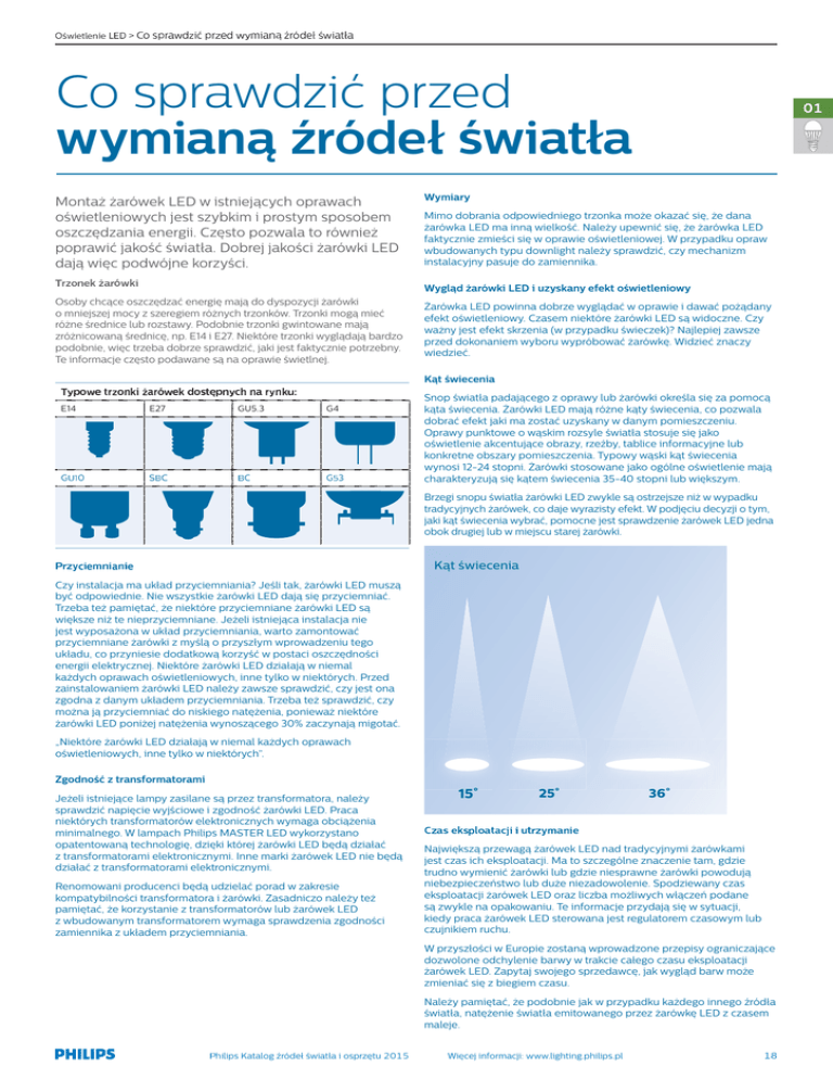 O !"#$%#&"# '() > *+ ,-./01234 -.251 0673/89 :.;15< =03/?</ Co sprawdzić przed wymianą źródeł światła Montaż żarówek LED w istniejących oprawach oświetleniowych jest szybkim i prostym sposobem oszczędzania energii. Często pozwala to również poprawić jakość światła. Dobrej jakości żarówki LED dają więc podwójne korzyści. T 01 Wymiary Mimo dobrania odpowiedniego trzonka może okazać się, że dana żarówka LED ma inną wielkość. Należy upewnić się, że żarówka LED faktycznie zmieści się w oprawie oświetleniowej. W przypadku opraw wbudowanych typu downlight należy sprawdzić, czy mechanizm instalacyjny pasuje do zamiennika. Wygląd żarówki LED i uzyskany efekt oświetleniowy Osoby chcące oszczędzać energię mają do dyspozycji żarówki o mniejszej mocy z szeregiem różnych trzonków. Trzonki mogą mieć różne średnice lub rozstawy. Podobnie trzonki gwintowane mają zróżnicowaną średnicę, np. E14 i E27. Niektóre trzonki wyglądają bardzo podobnie, więc trzeba dobrze sprawdzić, jaki jest faktycznie potrzebny. Te informacje często podawane są na oprawie świetlnej. Żarówka LED powinna dobrze wyglądać w oprawie i dawać pożądany efekt oświetleniowy. Czasem niektóre żarówki LED są widoczne. Czy ważny jest efekt skrzenia (w przypadku świeczek)? Najlepiej zawsze przed dokonaniem wyboru wypróbować żarówkę. Widzieć znaczy wiedzieć. Kąt świecenia T E14 E27 GU5.3 G4 G G Snop światła padającego z oprawy lub żarówki określa się za pomocą kąta świecenia. Żarówki LED mają różne kąty świecenia, co pozwala dobrać efekt jaki ma zostać uzyskany w danym pomieszczeniu. Oprawy punktowe o wąskim rozsyle światła stosuje się jako oświetlenie akcentujące obrazy, rzeźby, tablice informacyjne lub konkretne obszary pomieszczenia. Typowy wąski kąt świecenia wynosi 12-24 stopni. Żarówki stosowane jako ogólne oświetlenie mają charakteryzują się kątem świecenia 35-40 stopni lub większym. Brzegi snopu światła żarówki LED zwykle są ostrzejsze niż w wypadku tradycyjnych żarówek, co daje wyrazisty efekt. W podjęciu decyzji o tym, jaki kąt świecenia wybrać, pomocne jest sprawdzenie żarówek LED jedna obok drugiej lub w miejscu starej żarówki. Kąt świecenia P Czy instalacja ma układ przyciemniania? Jeśli tak, żarówki LED muszą być odpowiednie. Nie wszystkie żarówki LED dają się przyciemniać. Trzeba też pamiętać, że niektóre przyciemniane żarówki LED są większe niż te nieprzyciemniane. Jeżeli istniejąca instalacja nie jest wyposażona w układ przyciemniania, warto zamontować przyciemniane żarówki z myślą o przyszłym wprowadzeniu tego układu, co przyniesie dodatkową korzyść w postaci oszczędności energii elektrycznej. Niektóre żarówki LED działają w niemal każdych oprawach oświetleniowych, inne tylko w niektórych. Przed zainstalowaniem żarówki LED należy zawsze sprawdzić, czy jest ona zgodna z danym układem przyciemniania. Trzeba też sprawdzić, czy można ją przyciemniać do niskiego natężenia, ponieważ niektóre żarówki LED poniżej natężenia wynoszącego 30% zaczynają migotać. „Niektóre żarówki LED działają w niemal każdych oprawach oświetleniowych, inne tylko w niektórych”. Zgodność z transformatorami Jeżeli istniejące lampy zasilane są przez transformatora, należy sprawdzić napięcie wyjściowe i zgodność żarówki LED. Praca niektórych transformatorów elektronicznych wymaga obciążenia minimalnego. W lampach Philips MASTER LED wykorzystano opatentowaną technologię, dzięki której żarówki LED będą działać z transformatorami elektronicznymi. Inne marki żarówek LED nie będą działać z transformatorami elektronicznymi. Renomowani producenci będą udzielać porad w zakresie kompatybilności transformatora i żarówki. Zasadniczo należy też pamiętać, że korzystanie z transformatorów lub żarówek LED z wbudowanym transformatorem wymaga sprawdzenia zgodności zamiennika z układem przyciemniania. 15˚ 25˚ 36˚ C Największą przewagą żarówek LED nad tradycyjnymi żarówkami jest czas ich eksploatacji. Ma to szczególne znaczenie tam, gdzie trudno wymienić żarówki lub gdzie niesprawne żarówki powodują niebezpieczeństwo lub duże niezadowolenie. Spodziewany czas eksploatacji żarówek LED oraz liczba możliwych włączeń podane są zwykle na opakowaniu. Te informacje przydają się w sytuacji, kiedy praca żarówek LED sterowana jest regulatorem czasowym lub czujnikiem ruchu. W przyszłości w Europie zostaną wprowadzone przepisy ograniczające dozwolone odchylenie barwy w trakcie całego czasu eksploatacji żarówek LED. Zapytaj swojego sprzedawcę, jak wygląd barw może zmieniać się z biegiem czasu. Należy pamiętać, że podobnie jak w przypadku każdego innego źródła światła, natężenie światła emitowanego przez żarówkę LED z czasem maleje. @A"%ips Katalog źródeł światła i osprzętu 2015 Więcej informacji: !!!.lighting.philips.pl BD