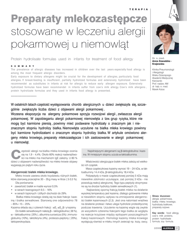 T E R A P I A Preparaty mlekozastępcze stosowane w leczeniu alergii pokarmowej u niemowląt Protein hydrolisate formulas used in infants for treatment of food allergy S U M M A R Y The prevalence of allergic diseases has increased in children over the last years especially food allergy is among the most frequent allergic disorders. Early exposure to dietary allergens might be crucial for the development of allergies, particularly food allergies. If breast-feeding is insufficient , partially hydrolized formulas and extensively hydrolized have been recommendet as substitutes in infants at risk for allergic to reduce early allergen exposure. Extensively hydrolized formulas have been recommendet in infants suffer from cow’s milk allergy. Cow’s milk allergens , protein hydrolizate formulas and they used in infants food allergy is presented. Dr n. med. Anna Zawadzka Krajewska Klinika Pneumonologii i Alergologii Wieku Dziecięcego Akademii Medycznej Kierownik: Prof. nadzw. AM dr hab. n. med. Marek Kulus ............................... W ostatnich latach częstość występowania chorób alergicznych u dzieci zwiększyła się, szczególnie zwiększyła liczba dzieci z objawami alergii pokarmowej . Wczesna ekspozycja na alergeny pokarmowe sprzyja rozwojowi alergii , zwłaszcza alergii pokarmowej. W zapobieganiu alergii pokarmowej niemowlęta z tzw. grup ryzyka, które nie mogą być karmione piersią , powinny mieć podawane hydrolizaty o znacznym jak i nieznacznym stopniu hydrolizy białka. Niemowlęta uczulone na białka mleka krowiego powinny być karmione hydrolizatami o znacznym stopniu hydrolizy białka. W artykule omówiono alergeny mleka krowiego, preparaty mlekozastępcze i ich zastosowanie w alergii pokarmowej u niemowląt. C zęstość alergii na białka mleka krowiego ocenia się na 1,9 – 4,4%. Około 60% reakcji nadwrażliwości na mleko ma mechanizm IgE zależny. U 80 % dzieci z objawami nadwrażliwości na mleko krowie objawy wygasają po piątym roku życia. Alergenność białek mleka krowiego. Mleko krowie zawiera około trzydziestu różnych białek, które stanowią przeciętnie 30 – 35 g masy w litrze ( 3-3,5 %). Dla porównania: • zawartość białek w maśle wynosi 0,5% • w serach twarogowych 9,5 – 16% • w serach topionych i żółtych dochodzi do 29%. Białka mleka krowiego dzielą się na dwie frakcje: kazeinę i białka serwatkowe. Stanowią one odpowiednio 78 – 85% i 15 – 25%. Kazeina składa się z czterech frakcji : αS1, αS2, β i γ kazeiny. Do białek serwatkowych należą β – laktoglobulina ( 36 %), α – laktoalbumina ( 20% ), albumina surowicza (5%) ,immunoglobuliny (10%), laktoferyna (4%), proteozo-peptony ( 20%), laktoperoksydaza. Najsilniejszymi alergenami są β-laktoglobulina i kazeina. W mniejszym stopniu uczula α-laktoalbumina. Właściwości alergizujące białek mleka zależą od wielkości ich cząstek. Masa cząsteczkowa kazeiny wynosi 19 – 24 kDa, α-laktoalbuminy 14,4 kDa, β-laktoglobuliny 18,4 kDa. Polipeptydy o masie cząsteczkowej poniżej 5 kDa mają niewielkie zdolności uczulające, zaś poniżej 3 kDa - nie powodują reakcji alergicznej. Tego typu peptydy otrzymywane są na drodze hydrolizy białek serwatkowych (1). Najbardziej oporną frakcją białek mleka na działanie wysokiej temperatury jest kazeina, dlatego gotowanie mleka w niewielkim stopniu wpływa na zmniejszenie alergenności białek kazeinowych (2,3). Jest ona natomiast wrażliwa na działanie proteaz i łatwo ulega hydrolizie proteolitycznej podczas trawienia. Uczulenie na kazeinę wiąże się zwykle ze wszystkimi czterema frakcjami tego białka ze względu na reakcje krzyżowe między epitopami poszczególnych frakcji kazeinowych. Homologi kazeiny mleka krowiego występują również w mleku innych zwierząt np. kozy, owcy, Słowa kluczowe: alergia pokarmowa, białka mleka krowiego, hydrolizaty białkowe, preparaty sojowe. Key words: food allergy, cow’s milk proteins, protein hydrolisate formula, soy formula. 2/2006 ALERGIA 31 T E R A P I A kobyły. W 80 – 90% są one identyczne w budowie chemicznej, następstwem czego jest występowanie reakcji krzyżowej między tymi białkami, a w konsekwencji konieczność eliminacji z diety również mleka tych zwierząt (4,5). Białka serwatkowe są w dużo większym stopniu niż kazeina wrażliwe na gotowanie, dlatego gotowanie mleka w znacznym stopniu pozbawia białka serwatkowe właściwości uczulających (2,3). Najbardziej termostabilną frakcją jest α-laktoalbumina. Istnieje ponadto możliwość osłabienia alergenności białek serwatkowych przez hydrolizę enzymatyczną, modyfikację chemiczną i procesy biotechnologiczne. Hydroliza enzymatyczna wykonywana jest za pomocą enzymów proteolitycznych pochodzenia zwierzęcego / trypsyny, chymotrypsyny, pepsyny, pankreatyny /, roślinnego / papainy/, bakteryjnego / Bacillus subtilis / lub grzybów /Aspergillus oryzae/. 2 TABELA Mieszanki mlekozastępcze i wskazanie do ich podawania u niemowląt uczulonych na białka mleka krowiego. Mieszanki Mieszanki elementarne • lody, torty lodowe • kremy deserowe w proszku (do ciast) • pieczywo cukiernicze (np. krakersy, wafle, ciastka, ciasta, drożdżówki, rogale) • cukierki typu toffi, mleczne, krówki • zupy i sosy w proszku lub kostkach • potrawy w puszkach i słoikach (flaczki, gołąbki) • pieczywo żytnie • pieczywo pszenne • kiełbasy homogenizowane (mortadela, parówki) • wędliny drobiowe i z podrobów (pasztetowa, pasztety) • sosy – chrzanowy, tatarski Im większy stopień rozfragmentaryzowania białka, tym mniejsze prawdopodobieństwo alergizacji i niestety gorszy smak i zapach otrzymanego produktu. α-laktoalbumina trawiona jest w przewodzie pokarmowym przez enzymy proteolityczne : pepsynę i trypsynę. β-laktoglobulina jest oporna na działanie tych enzymów i w formie prawie niezmienionej przechodzi do krwiobiegu i to między innymi jest przyczyną silniejszego działan