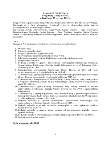 Protokół Nr XXXVI/2013 z sesji Rady Gminy Borowa, odbytej dnia 25 czerwca 2014 r. Sesję otworzył i poprowadził Przewodniczący Rady Gminy Borowa Pan Mieczysław Wiącek. Stwierdził, że w Sesji uczestniczy 15 radnych i jest to odpowiednia liczba radnych do podejmowania prawomocnych uchwał. Na wstępie powitał przybyłych na sesję: Wójta Gminy Borowa – Pana Władysława Błażejowskiego, Skarbnika Gminy Borowa – Pana Wiesława Kozdębę, Radną Powiatu Mielec – Panią Beatę Zakręcką, Redaktora tygodnika „Korso” Pana Piotra Duraka, Radnych i Sołtysów. Ad 2 Następnie Przewodniczący przedstawił proponowany porządek obrad: 1. 2. 3. 4. 5. 6. 7. Otwarcie sesji. Przyjęcie porządku obrad. Przyjęcie protokołu z poprzedniej sesji. Sprawozdanie z działalności międzysesyjnej Wójta. Informacja o pracach organów Rady Gminy w okresie międzysesyjnym. Interpelacje i zapytania. Podjęcie uchwały w sprawie zatwierdzenia sprawozdania finansowego Gminnego Samodzielnego Publicznego Zakładu Opieki Zdrowotnej im. prof. Klemensa Skóry w Borowej za 2013 rok. 8. Przedstawienie sprawozdania finansowego Gminy Borowa za 2013 rok wraz ze sprawozdaniem z wykonania budżetu za 2013 rok. 9. Zapoznanie się z opinią Regionalnej Izby Obrachunkowej o przedłożonym przez Wójta Gminy Borowa sprawozdaniu z wykonania budżetu za 2013 rok. 10. Zapoznanie się z Zarządzeniem Nr 14/2014 Wójta Gminy Borowa z dnia 28 marca 2014 r. w sprawie informacji o stanie mienia komunalnego Gminy Borowa według stanu na dzień 31.12.2013 r. 11. Zapoznanie się z opinią Komisji Rewizyjnej Rady Gminy Borowa w sprawie sprawozdania z wykonania budżetu Gminy Borowa za rok 2013 i sprawozdania finansowego. 12. Zapoznanie się z opinią Regionalnej Izby Obrachunkowej o przedłożonym wniosku Komisji Rewizyjnej Rady Gminy Borowa o udzielenie absolutorium dla Wójta Gminy z tytułu wykonania budżetu za 2013 rok. 13. Podjęcie uchwały w sprawie zatwierdzenia sprawozdania finansowego oraz sprawozdania z wykonania budżetu Gminy Borowa za 2013 r. 14. Podjęcie uchwały w sprawie udzielenia absolutorium z tytułu wykonania budżetu Gminy Borowa za 2013 r. 15. Podjęcie uchwały w sprawie inkasa podatku od nieruchomości, podatku rolnego i podatku leśnego. 16. Podjęcie uchwały w sprawie zmiany uchwały budżetowej Gminy Borowa na 2014 r. 17. Sprawy różne i wolne wnioski. Sesja uroczysta godz. 12.00 1 Pan Przewodniczący Czy są jakieś uwagi lub propozycje do porządku obrad? Ponieważ propozycji dotyczących zmian w porządku obrad nie było, porządek poddany został pod głosowanie i przyjęty jednogłośnie. Ad 3 Pan Przewodniczący stwierdził, że protokół z poprzedniej sesji odbytej w dniu 22 maja 2014 r. był udostępniony w biurze obsługi Rady i każdy mógł zapoznać się z jego treścią, jeżeli są jakieś uwagi lub zapytania do protokołu to proszę o zgłoszenie. Uwag ani zapytań do protokołu nie było, przyjęcie protokołu poddane zostało pod głosowanie i przyjęte większością głosów przy dwóch wstrzymującym. Ad 4 Pan Wójt Władysław Błażejowski złożył sprawozdanie z działalności międzysesyjnej Wójta. Pytań do działalności międzysesyjnej Wójta nie było. Ad 5 Przewodniczący Komisji Stałych Rady Gminy poinformowali o pracach komisji w okresie międzysesyjnym. Pan Fryderyk Sapała – Przewodniczący Komisji Rozwoju Gospodarczego, Rolnictwa, i Ochrony Środowiska, Pan Zdzisław Moryto – Przewodniczący Komisji Oświaty, Zdrowia, Spraw Społecznych, Kultury i Sportu, Pan Ryszard Sapała – Przewodniczący Komisji Samorządu, Gospodarki Finansowej, Mienia Komunalnego, Porządku i Bezpieczeństwa. Pytań do informacji o pracach organów rady gminy nie było. Ad 6 Pan Przewodniczący poinformował, że Pani Beata Zakręcka – Kierownik GSP ZOZ im. Prof. Klemensa Skóry w Borowej złożyła interpelację na piśmie. Pan Fryderyk Sapała Pod Panem Zielińskim w Sadkowej Górze jest droga tłuczniowa, po zakończeniu budowy przeprawy mostowej stanie się ona łącznikiem do drogi wojewódzkiej. Prośba do Pani Radnej Powiatu, Pani Beaty Zakręckiej i Pana Wójta, by mieli na uwadze tą drogę. Należy obwałować Brnik. Pan Józef Kazimierski Prośba do Pani Radnej Powiatu, by wstawiła się w powiecie o drogi, które zostały zepsute przy budowie przeprawy mostowej. Pan Józef Walas Dziękuję za wykonanie drogi Orłów – Czermin. 2 Pan Andrzej Jarosz Odnośnie zarządzenia Wójta z 18 czerwca 2014 r. dotyczącego powołania komisji, która ma dokonywać odbioru budowy drogi Orłów – Czermin. Trzeba wyczulić Komisję, by zwróciła uwagę na to, że wjazdy z dróg polnych są zaniżone a zgodnie z umową był tam przewidziany kamień. Ok. 13 zjazdów jest zaniżonych. Droga będzie załamywana przy wjeździe na nią. W pasie drogowym wjazdy utwardzić nie materiałem sypkim. Pan Józef Walas Przeglądałem tą drogę. Pobocza i wjazdy są wysypane tłuczniem i zawalcowane. Ad 7 Pani Stanisława Bujak odczytała projekt uchwały w sprawie zatwierdzenia sprawozdania finansowego Gminnego Samodzielnego Publicznego Zakładu Opieki Zdrowotnej im. prof. Klemensa Skóry w Borowej za 2013 rok. Pan Przewodniczący Na wszystkich 3 komisjach sprawozdanie to było omawiane i opiniowane. Uwag ani zapytań do przedstawionego projektu uchwały nie było, przedstawiony projekt poddany został pod głosowanie i przyjęty większością głosów przy jednym wstrzymującym. Ad 8 Przewodniczący Rady Gminy Pan Mieczysław Wiącek stwierdził, że radni otrzymali sprawozdanie roczne z wykonania budżetu Gminy za 2013 r. oraz sprawozdanie finansowe za 2013 r. Sprawozdania te były przedmiotem obrad wszystkich Komisji Rady, wszystkie Komisje pozytywnie zaopiniowały przedstawione sprawozdanie z wykonania budżetu Gminy za 2013 r. oraz sprawozdanie finansowe za 2013 r. Następnie otworzył dyskusję nad sprawozdaniami. Pan Andrzej Jarosz Mam spore wątpliwości, co do całych 4 