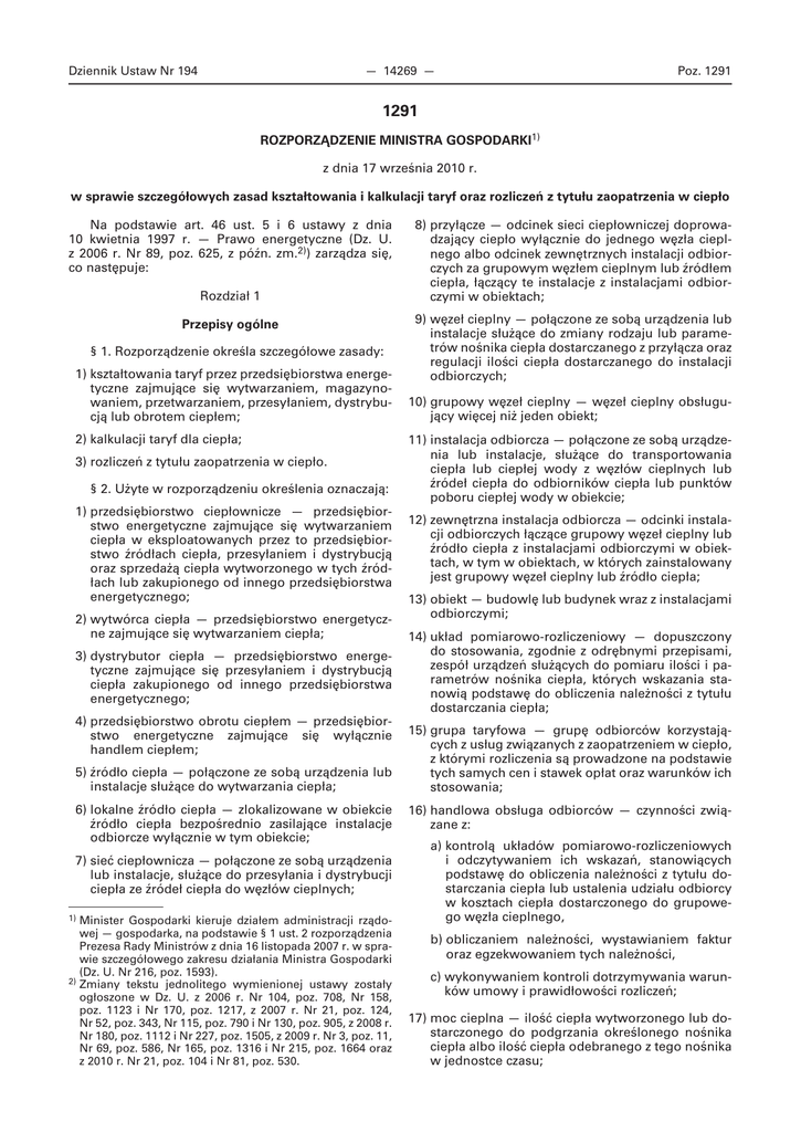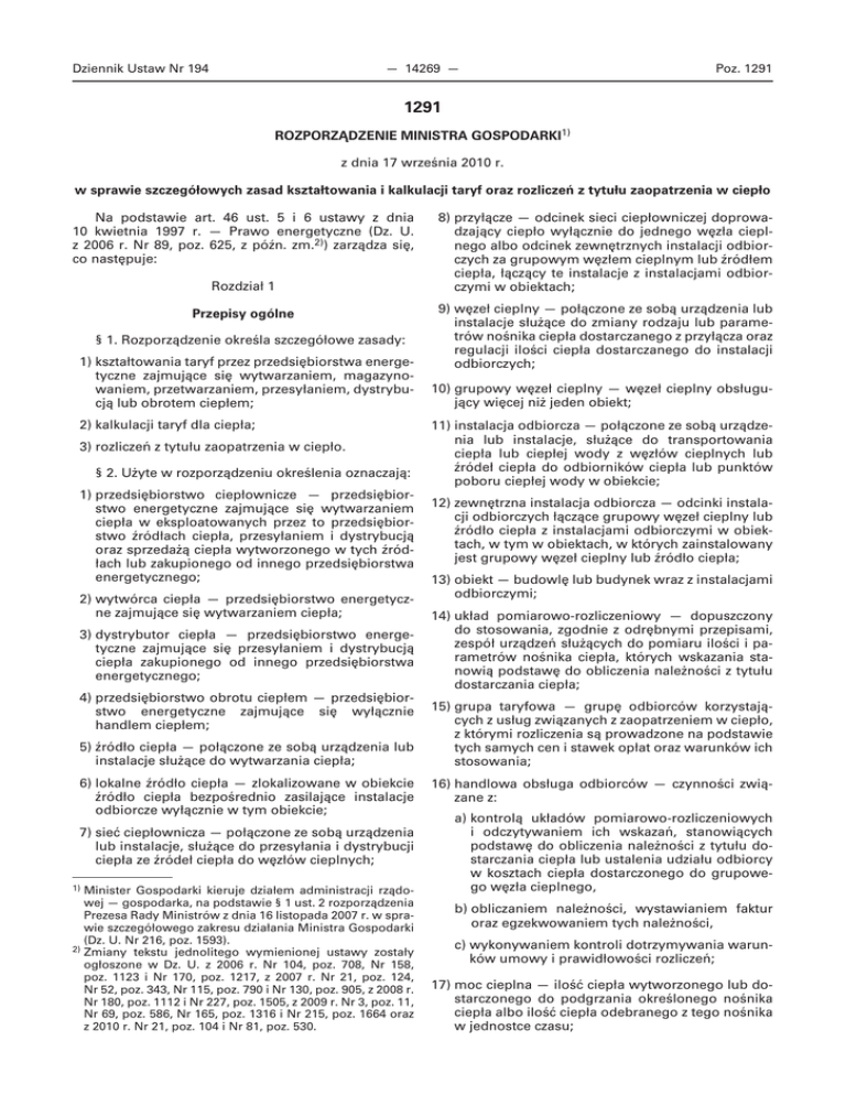Dziennik Ustaw Nr 194 — 14269 — Poz. 1291 1291 ROZPORZĄDZENIE MINISTRA GOSPODARKI1) z dnia 17 września 2010 r. w sprawie szczegółowych zasad kształtowania i kalkulacji taryf oraz rozliczeń z tytułu zaopatrzenia w ciepło Na podstawie art. 46 ust. 5 i 6 ustawy z dnia 10 kwietnia 1997 r. — Prawo energetyczne (Dz. U. z 2006 r. Nr 89, poz. 625, z późn. zm.2)) zarządza się, co następuje: Rozdział 1 Przepisy ogólne § 1. Rozporządzenie określa szczegółowe zasady: 1) kształtowania taryf przez przedsiębiorstwa energetyczne zajmujące się wytwarzaniem, magazynowaniem, przetwarzaniem, przesyłaniem, dystrybucją lub obrotem ciepłem; 2) kalkulacji taryf dla ciepła; 3) rozliczeń z tytułu zaopatrzenia w ciepło. § 2. Użyte w rozporządzeniu określenia oznaczają: 1) przedsiębiorstwo ciepłownicze — przedsiębiorstwo energetyczne zajmujące się wytwarzaniem ciepła w eksploatowanych przez to przedsiębiorstwo źródłach ciepła, przesyłaniem i dystrybucją oraz sprzedażą ciepła wytworzonego w tych źródłach lub zakupionego od innego przedsiębiorstwa energetycznego; 2) wytwórca ciepła — przedsiębiorstwo energetyczne zajmujące się wytwarzaniem ciepła; 3) dystrybutor ciepła — przedsiębiorstwo energetyczne zajmujące się przesyłaniem i dystrybucją ciepła zakupionego od innego przedsiębiorstwa energetycznego; 4) przedsiębiorstwo obrotu ciepłem — przedsiębiorstwo energetyczne zajmujące się wyłącznie handlem ciepłem; 5) źródło ciepła — połączone ze sobą urządzenia lub instalacje służące do wytwarzania ciepła; 6) lokalne źródło ciepła — zlokalizowane w obiekcie źródło ciepła bezpośrednio zasilające instalacje odbiorcze wyłącznie w tym obiekcie; 7) sieć ciepłownicza — połączone ze sobą urządzenia lub instalacje, służące do przesyłania i dystrybucji ciepła ze źródeł ciepła do węzłów cieplnych; 1) Minister Gospodarki kieruje działem administracji rządowej — gospodarka, na podstawie § 1 ust. 2 rozporządzenia Prezesa Rady Ministrów z dnia 16 listopada 2007 r. w sprawie szczegółowego zakresu działania Ministra Gospodarki (Dz. U. Nr 216, poz. 1593). 2) Zmiany tekstu jednolitego wymienionej ustawy zostały ogłoszone w Dz. U. z 2006 r. Nr 104, poz. 708, Nr 158, poz. 1123 i Nr 170, poz. 1217, z 2007 r. Nr 21, poz. 124, Nr 52, poz. 343, Nr 115, poz. 790 i Nr 130, poz. 905, z 2008 r. Nr 180, poz. 1112 i Nr 227, poz. 1505, z 2009 r. Nr 3, poz. 11, Nr 69, poz. 586, Nr 165, poz. 1316 i Nr 215, poz. 1664 oraz z 2010 r. Nr 21, poz. 104 i Nr 81, poz. 530. 8) przyłącze — odcinek sieci ciepłowniczej doprowadzający ciepło wyłącznie do jednego węzła cieplnego albo odcinek zewnętrznych instalacji odbiorczych za grupowym węzłem cieplnym lub źródłem ciepła, łączący te instalacje z instalacjami odbiorczymi w obiektach; 9) węzeł cieplny — połączone ze sobą urządzenia lub instalacje służące do zmiany rodzaju lub parametrów nośnika ciepła dostarczanego z przyłącza oraz regulacji ilości ciepła dostarczanego do instalacji odbiorczych; 10) grupowy węzeł cieplny — węzeł cieplny obsługujący więcej niż jeden obiekt; 11) instalacja odbiorcza — połączone ze sobą urządzenia lub instalacje, służące do transportowania ciepła lub ciepłej wody z węzłów cieplnych lub źródeł ciepła do odbiorników ciepła lub punktów poboru ciepłej wody w obiekcie; 12) zewnętrzna instalacja odbiorcza — odcinki instalacji odbiorczych łączące grupowy węzeł cieplny lub źródło ciepła z instalacjami odbiorczymi w obiektach, w tym w obiektach, w których zainstalowany jest grupowy węzeł cieplny lub źródło ciepła; 13) obiekt — budowlę lub budynek wraz z instalacjami odbiorczymi; 14) układ pomiarowo-rozliczeniowy — dopuszczony do stosowania, zgodnie z odrębnymi przepisami, zespół urządzeń służących do pomiaru ilości i parametrów nośnika ciepła, których wskazania stanowią podstawę do obliczenia należności z tytułu dostarczania ciepła; 15) grupa taryfowa — grupę odbiorców korzystających z usług związanych z zaopatrzeniem w ciepło, z którymi rozliczenia są prowadzone na podstawie tych samych cen i stawek opłat oraz warunków ich stosowania; 16) handlowa obsługa odbiorców — czynności związane z: a) kontrolą układów pomiarowo-rozliczeniowych i odczytywaniem ich wskazań, stanowiących podstawę do obliczenia należności z tytułu dostarczania ciepła lub ustalenia udziału odbiorcy w kosztach ciepła dostarczonego do grupowego węzła cieplnego, b) obliczaniem należności, wystawianiem faktur oraz egzekwowaniem tych należności, c) wykonywaniem kontroli dotrzymywania warunków umowy i prawidłowości rozliczeń; 17) moc cieplna — ilość ciepła wytworzonego lub dostarczonego do podgrzania określonego nośnika ciepła albo ilość ciepła odebranego z tego nośnika w jednostce czasu; Dziennik Ustaw Nr 194 — 14270 — 18) zamówiona moc cieplna — ustaloną przez odbiorcę lub podmiot ubiegający się o przyłączenie do sieci ciepłowniczej największą moc cieplną, jaka w danym obiekcie wystąpi w warunkach obliczeniowych, która zgodnie z określonymi w odrębnych przepisach warunkami technicznymi oraz wymaganiami technologicznymi dla tego obiektu jest niezbędna do zapewnienia: a) pokrycia strat ciepła w celu utrzymania normatywnej temperatury i wymiany powietrza w pomieszczeniach, b) utrzymania normatywnej temperatury ciepłej wody w punktach czerpalnych, c) prawidłowej pracy innych urządzeń lub instalacji; 19) przyłączeniowa moc cieplna — moc cieplną ustaloną przez przedsiębiorstwo energetyczne dla danej sieci ciepłowniczej na podstawie zamówionej mocy cieplnej przez odbiorców przyłączonych do tej sieci, po uwzględnieniu strat mocy cieplnej podczas przesyłania ciepła tą siecią oraz niejednoczesności występowania szczytowego poboru mocy cieplnej u odbiorców; 20) obliczeniowe natężeni