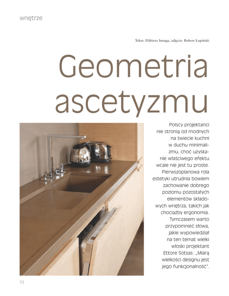 wnętrze Tekst: Elżbieta Smuga, zdjęcia: Robert Łupiński Geometria ascetyzmu Polscy projektanci nie stronią od modnych na świecie kuchni w duchu minimalizmu, choć uzyskanie właściwego efektu wcale nie jest tu proste. Pierwszoplanowa rola estetyki utrudnia bowiem zachowanie dobrego poziomu pozostałych elementów składowych wnętrza, takich jak chociażby ergonomia. Tymczasem warto przypomnieć słowa, jakie wypowiedział na ten temat wielki włoski projektant Ettore Sotsas: „Miarą wielkości designu jest jego funkcjonalność”. 72 wnętrze 73 wnętrze 74 wnętrze Kuchnia, którą mamy okazję oglądać bez wątpienia należy do udanych realizacji, choć przypomina raczej ekspozycję z mediolańskich targów meblowych niż wnętrze mieszkalne. Perfekcyjnie zaprojektowana zabudowa, pozbawiona jakichkolwiek zbędnych detali i rozpraszających uwagę akcesoriów ma zdecydowanie ascetyczny charakter i niektórym może wydawać się zbyt pusta i surowa. Ale jej spokojna, harmonijna forma i zastosowane drewno może też działać terapeutycznie. Właściciel mieszkania wysunął nawet postulat, aby wnętrze pomimo minimalistycznego stylu nie było przesadnie chłodne w odbiorze. I to się udało. W kuchni uderza ogromna powściągliwość w użyciu barw i konsekwencja kolorystyczna. Czysta biel stanowi tu neutralne tło dla dwóch kontrastowych odcieni brązu – jasnego forniru i ciemne- Projekt: Łukasz Kwietniewski, Grzegorz Bajorek Realizacja: Pracownia Projektowa O&O European Design Meble kuchenne: firma „Bogdan Kamiński” Projekt kuchni zdobył III miejsce w konkursie „Miele – Architekt Roku 2006”, któremu patronuje redakcja magazynu „Kuchnia i Technika” 75 wnętrze 76 wnętrze 77 wnętrze 78 wnętrze go kamienia. W efekcie takiego połączenia biel utraciła właściwy sobie chłód, podkreślając elegancję oryginalnych frontów z obłogiem wykonanym ze szczotkowanego dębu. Na nastrój w istotny sposób wpłynęło też pojawienie się w różnych miejscach tego samego marmuru Marrone Armani – na podłodze, blatach, w pasie między dolną i górną zabudową oraz na cokołach. Jego przygaszony, brunatnobrązowy kolor i specjalnie zabezpieczona, zmatowiona powierzchnia działa uspokajająco na użytkowników. Trzeba w tym miejscu dodać, że przeniesienie odważnej koncepcji projektowej do realiów mieszkania było nie lada sztuką, bo wymagało stoczenia zwycięskiej batalii z niewidocznymi dla laika przeszkodami: ścianami, rurami wodnymi, kanałami wentylacyjnymi, przewodami napięciowymi itp. Wspomniane trudności to nie jedyny problem, z jakim stykają się projektanci wnętrz minimalistycznych. Kuchnia jest wszak miejscem pracy i wymaga logicznego umiejscowienia wielu urządzeń oraz zagwarantowania funkcjonalnego programu dla spełnia- nia należnych jej zadań. Cieszy więc fakt, że pomimo rygorystycznych założeń, jakie narzucili sobie twórcy omawianego wnętrza, udało im się pogodzić wszystkie aspekty dobrej kuchni: zarówno te estetyczne, jak i użytkowe. Cechą charakterystyczną, która rzuca się w oczy po wejściu do pomieszczenia jest ubogość urządzeń kuchennych, jakie widzimy. Dostrzeżemy jedynie umieszczoną na wyspie płytę ceramiczną i grillową , bo nawet zawieszony nad nimi okap „ubrano” w specjalną białą obudowę, by pozostawał w cieniu i nie stanowił elementu dominującego, jak ma to miejsce w większości nowoczesnych kuchni. Istnienia reszty urządzeń możemy się jedynie domyślać. Wprawdzie standardem jest zabudowa chłodziarko-zamrażarki i nikogo nie dziwi zmywarka ze zintegrowanym panelem sterowania, lecz tu ukryto też stalowe fronty piekarnika i urządzenia do gotowania na parze. Czystość formy była najważniejsza. Z kuchni do aneksu jadalnego prowadzi korytarz zamykany w razie potrzeby oryginalnymi drzwia- 79 wnętrze mi, które nie mają klamek ani widocznych zawiasów, a po złożeniu wyglądają jak dekoracyjny panel. Sama jadalnia zaś, znajdująca się w jednej przestrzeni z pokojem dziennym, jest stylistycznym nawiązaniem do kuchni. Nad stołem góruje przepiękny żyrandol z białymi abażurami, a krzesła pokrywają sięgające podłogi, białe pokrowce. Stół to z kolei zaprojektowana na potrzeby wnętrza i misternie wykonana konstrukcja, z fornirem identycznym jak na kuchennych frontach. Podziw budzą przepięknie wykonane detale. n 80 wnętrze 81