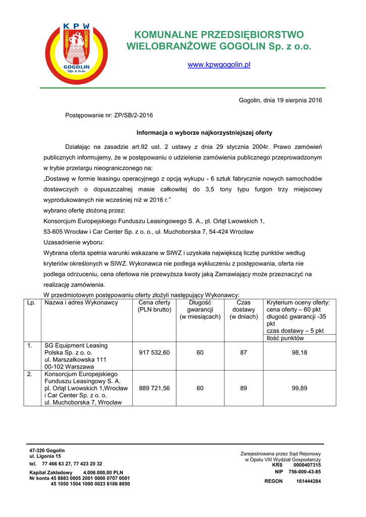 KOMUNALNE PRZEDSIĘBIORSTWO WIELOBRANŻOWE GOGOLIN Sp. z o.o. www.kpwgogolin.pl Gogolin, dnia 19 sierpnia 2016 Postępowanie nr: ZP/SB/2-2016 Informacja o wyborze najkorzystniejszej oferty Działając na zasadzie art.92 ust. 2 ustawy z dnia 29 stycznia 2004r. Prawo zamówień publicznych informujemy, że w postępowaniu o udzielenie zamówienia publicznego przeprowadzonym w trybie przetargu nieograniczonego na: „Dostawę w formie leasingu operacyjnego z opcją wykupu - 6 sztuk fabrycznie nowych samochodów dostawczych o dopuszczalnej masie całkowitej do 3,5 tony typu furgon trzy miejscowy wyprodukowanych nie wcześniej niż w 2016 r.” wybrano ofertę złożoną przez: Konsorcjum Europejskiego Funduszu Leasingowego S. A., pl. Orląt Lwowskich 1, 53-605 Wrocław i Car Center Sp. z o. o., ul. Muchoborska 7, 54-424 Wrocław Uzasadnienie wyboru: Wybrana oferta spełnia warunki wskazane w SIWZ i uzyskała największą liczbę punktów według kryteriów określonych w SIWZ. Wykonawca nie podlega wykluczeniu z postępowania, oferta nie podlega odrzuceniu, cena ofertowa nie przewyższa kwoty jaką Zamawiający może przeznaczyć na realizację zamówienia. Lp. 1. 2. W przedmiotowym postępowaniu oferty złożyli następujący Wykonawcy: Nazwa i adres Wykonawcy Cena oferty Długość Czas (PLN brutto) gwarancji dostawy (w miesiącach) (w dniach) SG Equipment Leasing Polska Sp. z o. o. ul. Marszałkowska 111 00-102 Warszawa Konsorcjum Europejskiego Funduszu Leasingowy S. A. pl. Orląt Lwowskich 1,Wrocław i Car Center Sp. z o. o. ul. Muchoborska 7, Wrocław 47-320 Gogolin ul. Ligonia 15 tel. 77 466 63 27, 77 423 20 32 Kapitał Zakładowy 4.006.000,00 PLN Nr konta 45 8883 0005 2001 0000 0707 0001 Nr konta 45 1050 1504 1000 0023 6186 8850 Kryterium oceny oferty: cena oferty – 60 pkt długość gwarancji -35 pkt czas dostawy – 5 pkt Ilość punktów 917 532,60 60 87 98,18 889 721,56 60 89 99,89 Zarejestrowana przez Sąd Rejonowy w Opolu VIII Wydział Gospodarczy KRS 0000407315 NIP 756-000-43-85 REGON 161444284
