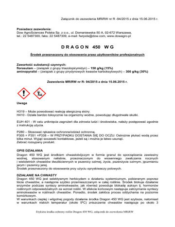 Załącznik do zezwolenia MRiRW nr R -94/2015 z dnia 15.06.2015 r. Posiadacz zezwolenia: Dow AgroSciences Polska Sp. z o.o., ul. Domaniewska 50 A, 02-672 Warszawa, tel.: 22 5487300, faks: 22 5487309, e-mail: [email protected], www.dowagro.pl D R A G O N 450 W G Środek przeznaczony do stosowania przez użytkowników profesjonalnych Zawartość substancji czynnych: florasulam – (związek z grupy triazolopirymidyn) – 150 g/kg (15%) aminopyralid – (związek z grupy pirydynowych kwasów karboksylowych) – 300 g/kg (30%) Zezwolenie MRiRW nr R- 94/2015 z dnia 15.06.2015 r. Uwaga H319 – Może powodować reakcję alergiczną skóry. H410 - Działa bardzo toksycznie na organizmy wodne, powodując długotrwałe skutki. EUH 401 - W celu uniknięcia zagrożeń dla zdrowia ludzi i środowiska, należy postępować zgodnie z instrukcją użycia. P280 – Stosować rękawice ochronne/odzież ochronną. P305 + P351 +P338 – W PRZYPADKU DOSTANIA SIĘ DO OCZU: Ostrożnie płukać wodą przez kilka minut. Wyjąć soczewki kontaktowe, jeżeli są i można je łatwo usunąć. Zebrać rozsypany produkt. OPIS DZIAŁANIA Dragon 450 WG jest środkiem chwastobójczym w formie granul do sporządzania zawiesiny wodnej, stosowanym nalistnie, przeznaczonym do wiosennego zwalczania rocznych i wieloletnich chwastów dwuliściennych w pszenicy ozimej, życie, pszenżycie ozimym, jęczmieniu jarym i pszenicy jarej. Środek przeznaczony do stosowania przy użyciu opryskiwaczy polowych. DZIAŁANIE NA CHWASTY Dragon 450 WG jest selektywnym herbicydem o działaniu systemicznym, pobieranym poprzez liście chwastów, a następnie szybko przemieszczanym w całej roślinie. Środek blokuje działanie enzymów podczas syntezy aminokwasów, jak również powoduje blokadę auksyn tj. hormonów roślinnych odpowiedzialnych za wzrost roślin. W efekcie końcowym następuje zatrzymanie syntezy aminokwasów w roślinach chwastów. Ponadto, środek zakłóca proces oddychania na poziomie komórkowym. W warunkach ciepłej i wilgotnej pogody działanie środka Dragon 450 WG jest szybsze, natomiast w warunkach niskich temperatur (około 5ºC) zniszczenie chwastów następuje po około 3 Etykieta środka ochrony roślin Dragon 450 WG, załącznik do zezwolenia MRiRW tygodniach. Środek zwalcza chwasty, gdy minimalna temperatura dobowa w ciągu 6 dni po wykonaniu zabiegu wynosi powyżej 5ºC. Środek najskuteczniej niszczy chwasty znajdujące się w fazie 2-6 liści. Przytulię czepną zwalcza skutecznie do wysokości 20 cm, chwasty rumianowate do wysokości 25 cm. Chwasty wrażliwe: chaber bławatek, fiołek polny przed kwitnieniem, gorczyca polna, gwiazdnica pospolita, komosa biała w fazie do 4-6 liści właściwych, mak polny, mlecz zwyczajny, maruna bezwonna, miłek letni, niezapominajka polna, ostrożeń polny, przytulia czepna, psianka czarna, rdest plamisty, rdest powojowy, rumian polny, rumianek pospolity, stulicha psia, szarłat szorstki, tasznik pospolity, tobołki polne, wyka wąskolistna, żółtlica drobnokwiatowa, Chwasty średnio wrażliwe: babki, bodziszki, fiołek polny w fazie kwitnienia, jasnota purpurowa, jasnota różowa, kurzyślad polny, mniszek pospolity, powój polny, poziewnik szorstki, przetacznik bluszczykowy, skrzyp polny, rzodkiew świrzepa, samosiewy rzepaku, Chwasty odporne: chwasty jednoliścienne. STOSOWANIE ŚRODKA Pszenica ozima Maksymalna / zalecana dawka dla jednorazowego zastosowania: 33,3 g/ha Termin stosowania: Opryskiwać wiosną od początku krzewienia do fazy pierwszego kolanka zbóż (BBCH 21-31). W celu jednoczesnego zwalczania chwastów dwuliściennych i miotły zbożowej można stosować łącznie ze środkami: Dragon 450 WG 33,3 g/ha + Apyros 75 WG 13,3 - 20 g/ha. Dragon 450 WG 33,3 g/ha + Apyros 75 WG 13,3 g/ha + Atpolan 80 EC 1,5 l/ha. Dragon 450 WG 33,3 g/ha + Attribut 70 WG 60 g/ha. Dragon 450 WG 33,3 g/ha + Atlantis 0,4 WG 150 – 200 g/ha + Actirob 842 EC 1,0 l/ha. Maksymalna liczba zabiegów w sezonie wegetacyjnym: 1. Zalecana ilość wody: 150-300 l/ha. Zalecane opryskiwanie: średniokropliste. Pszenżyto ozime, żyto Maksymalna / zalecana dawka dla jednorazowego zastosowania: 33,3 g/ha Termin stosowania: Opryskiwać wiosną od początku krzewienia do fazy pierwszego kolanka zbóż (BBCH 21-31). W celu jednoczesnego zwalczania chwastów dwuliściennych i mączniaka prawdziwego zbóż można stosować mieszaninę: Dragon 450 WG 33,3 g/ha + Atlas 500 SC 0,2 l/ha Maksymalna liczba zabiegów w sezonie wegetacyjnym: 1. Zalecana ilość wody: 150-300 l/ha. Zalecane opryskiwanie: średniokropliste. Jęczmień jary, pszenica jara Maksymalna / zalecana dawka dla jednorazowego zastosowania: 33,3 g/ha Etykieta środka ochrony roślin Dragon 450 WG, załącznik do zezwolenia MRiRW Termin stosowania: Opryskiwać od fazy 3 liści do fazy pierwszego kolanka zbóż (BBCH13-31). W celu uzyskania wyższej skuteczności zwalczania chwastów średniowrażliwych lub zwalczania chwastów znajdujących się w wyższych stadiach oraz w przypadku wystąpienia silnego zachwaszczenia w zbożach jarych stosować mieszaninę: Dragon 450 WG 33,3 g/ha + Atpolan 80 EC 1,5 l/ha. Dragon 450 WG 33,3 g/ha + Olbras 88 EC 1,5 l/ha. Maksymalna liczba zabiegów w sezonie wegetacyjnym: 1. Zalecana ilość wody: 150-300 l/ha. Zalecane opryskiwanie: średniokropliste. NASTĘPSTWO ROŚLIN W przypadku wcześniejszego zaorania plantacji potraktowanej środkiem (w wyniku uszkodzenia roślin przez przymrozki, choroby lub szkodniki) na polu tym można uprawiać zboża lub kukurydzę, jednak nie wcześniej niż 4 tygodnie od zastosowania produktu i po zaoraniu plantacji na głębokość co najmniej 15 cm. Po zastosowaniu środka DRAGON 450 WG w zalecanych dawkach wiosną, roślinami następczymi mogą być: - jesienią tego samego roku kalendarzowego (po upływie minimum 3 miesięcy) wyłącznie zboża, rzepak ozimy, gorczyca uprawiana jako poplon, kapusta z rozsady, trawy; - wiosną następnego roku kalendarzowego (po upł
